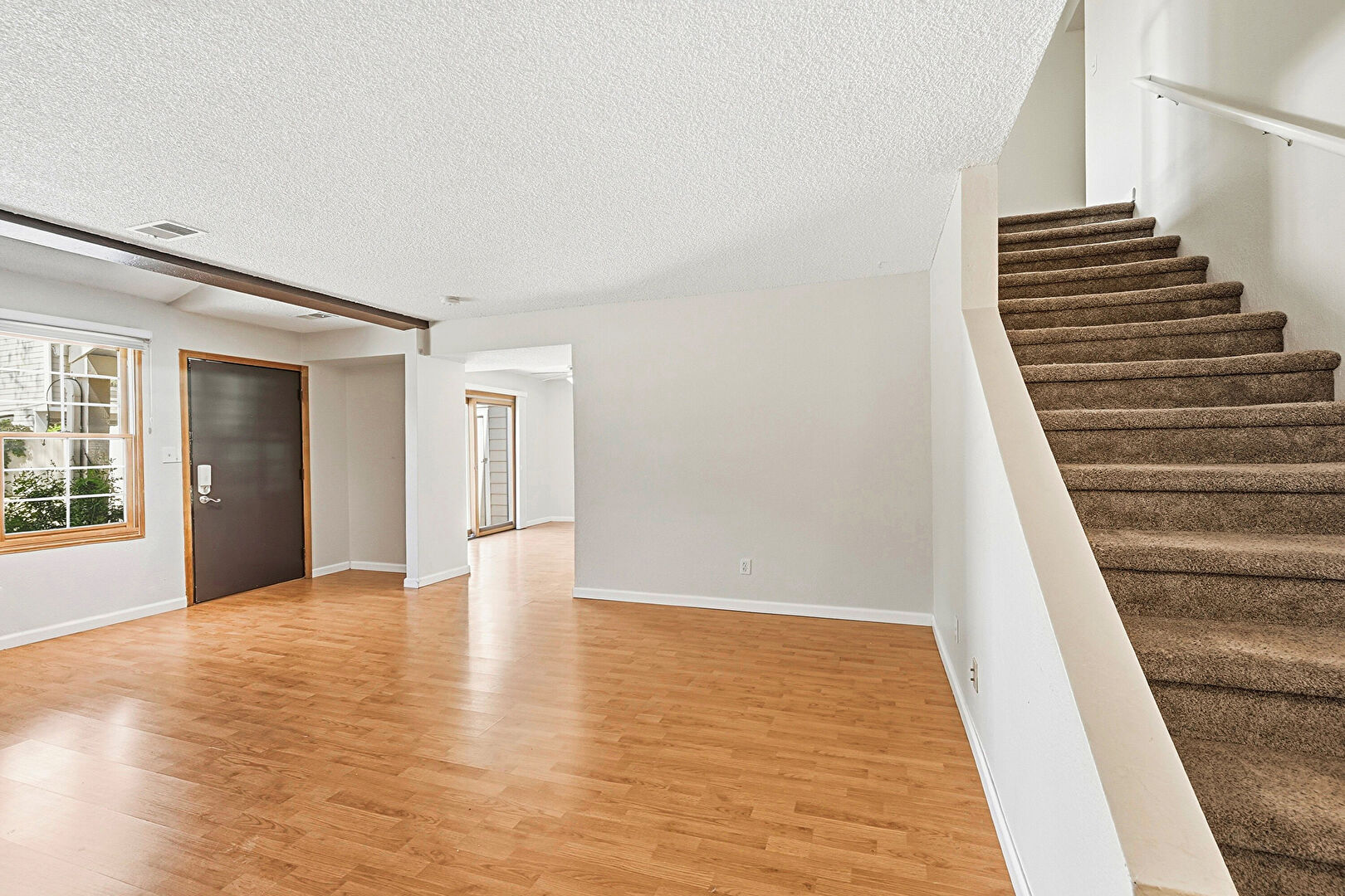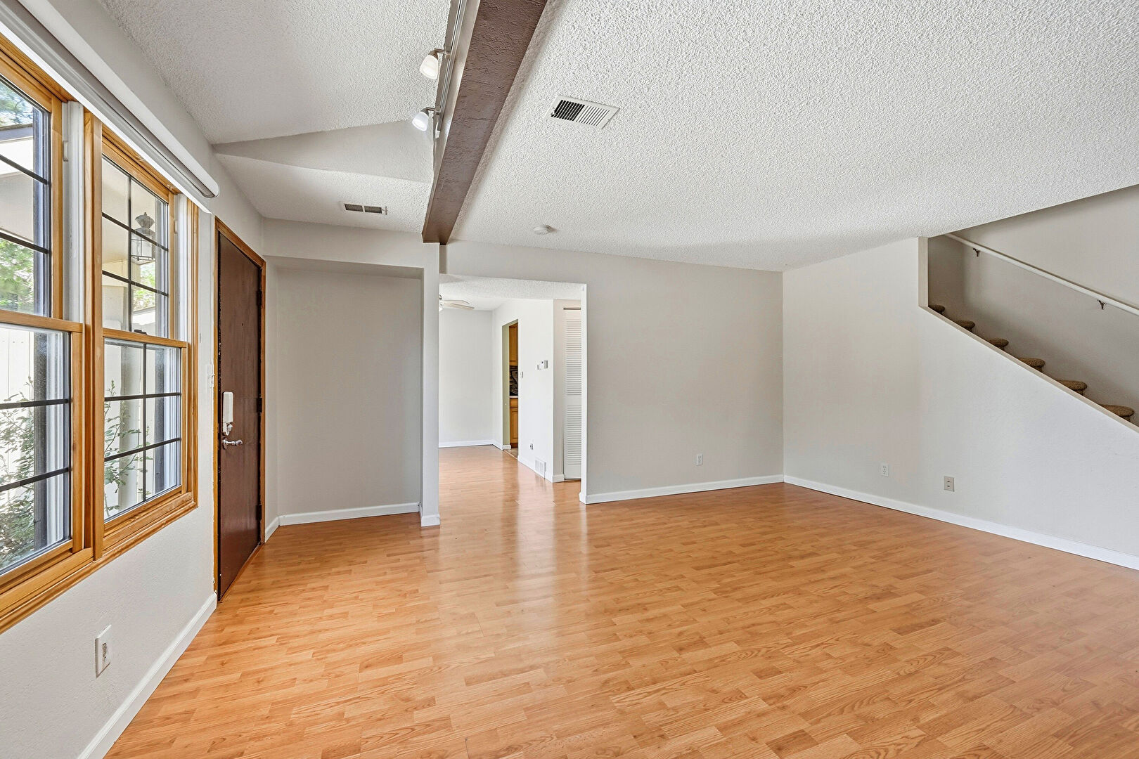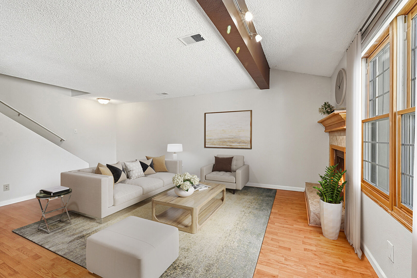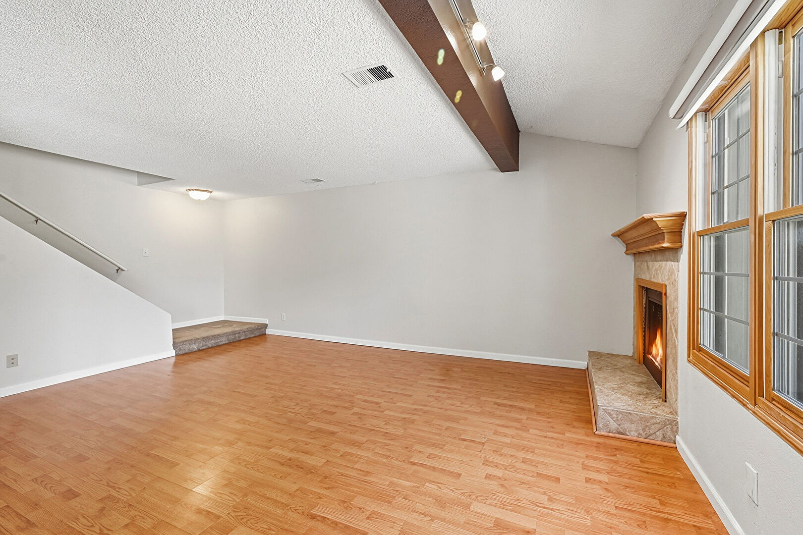 Baseboards Wall, Beamed Ceiling, Drywall, Fireplace, Natural Light, Stairs, Textured Ceiling, Track Lighting, Vaulted Ceiling, Vent, Wood Finish Floor, Beamed Ceiling, Stairs, Vent, Wood Finish Floor
