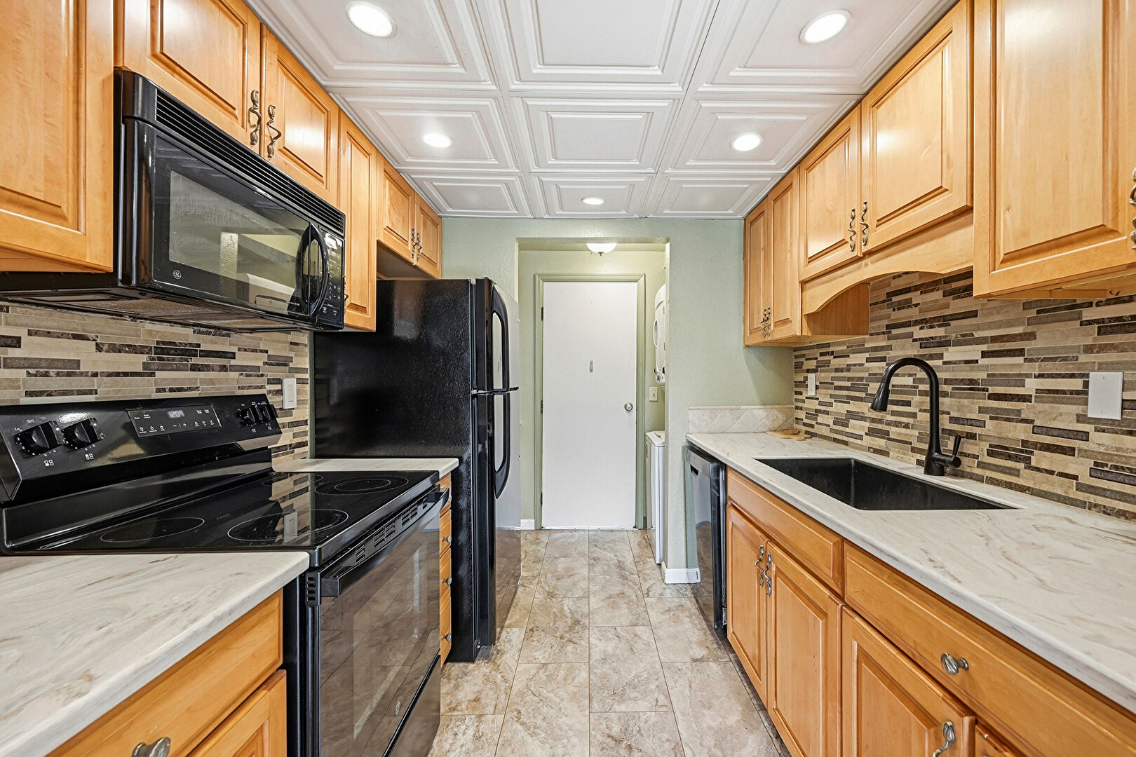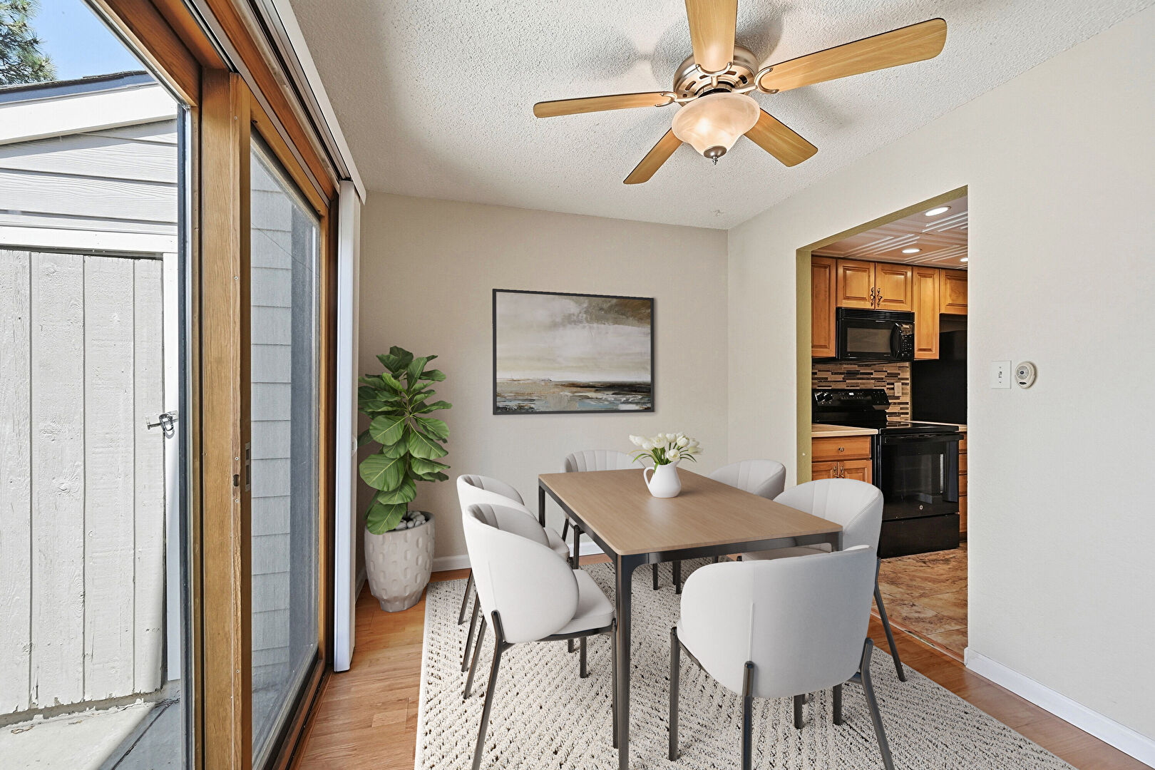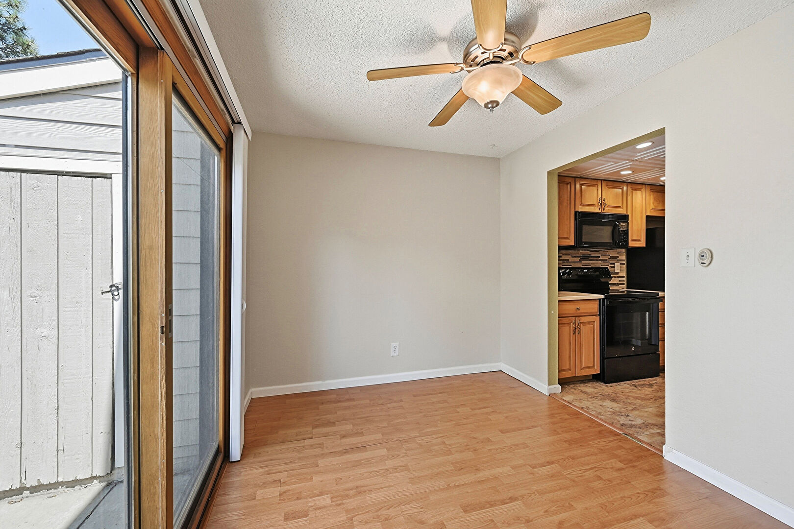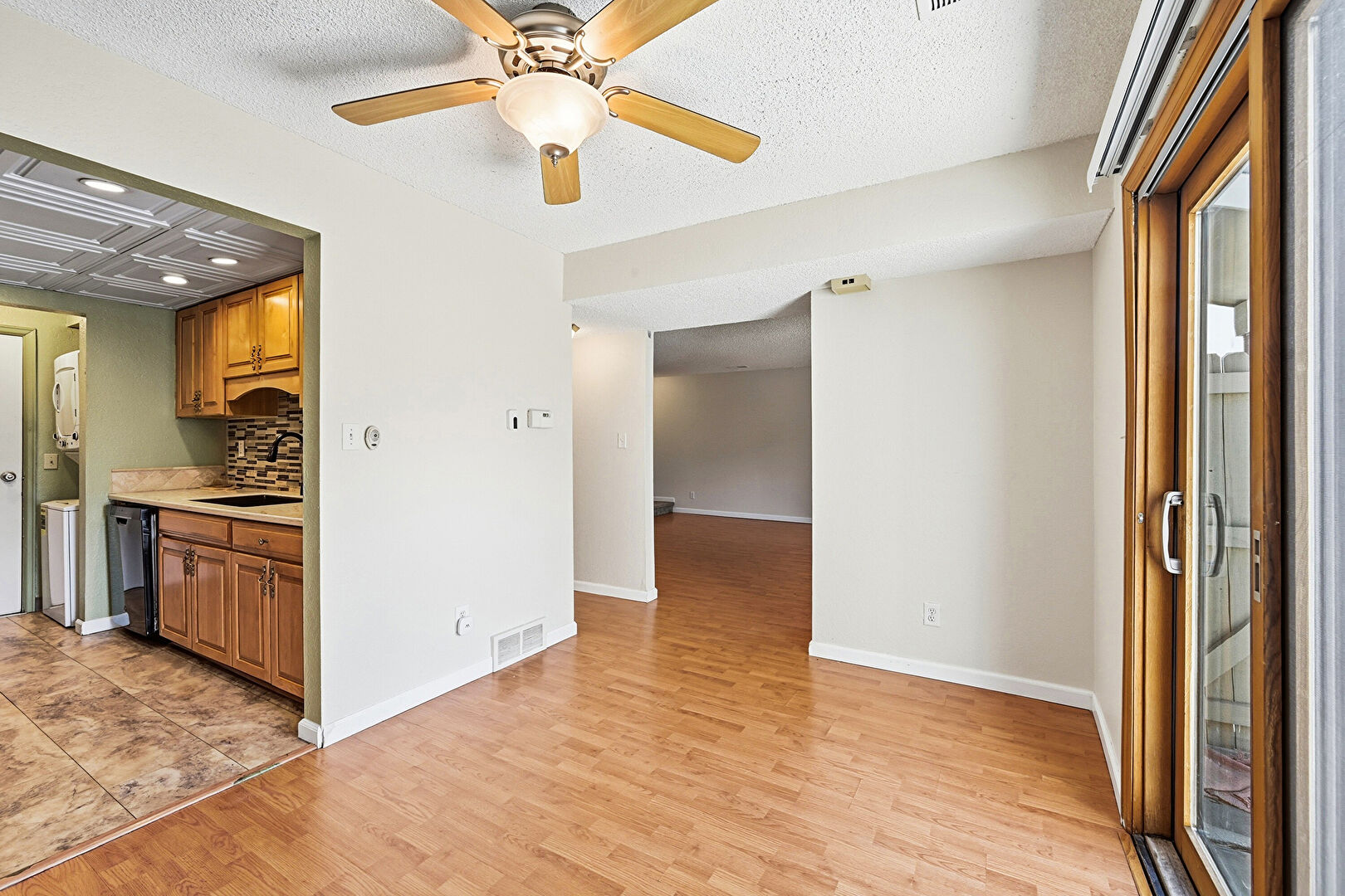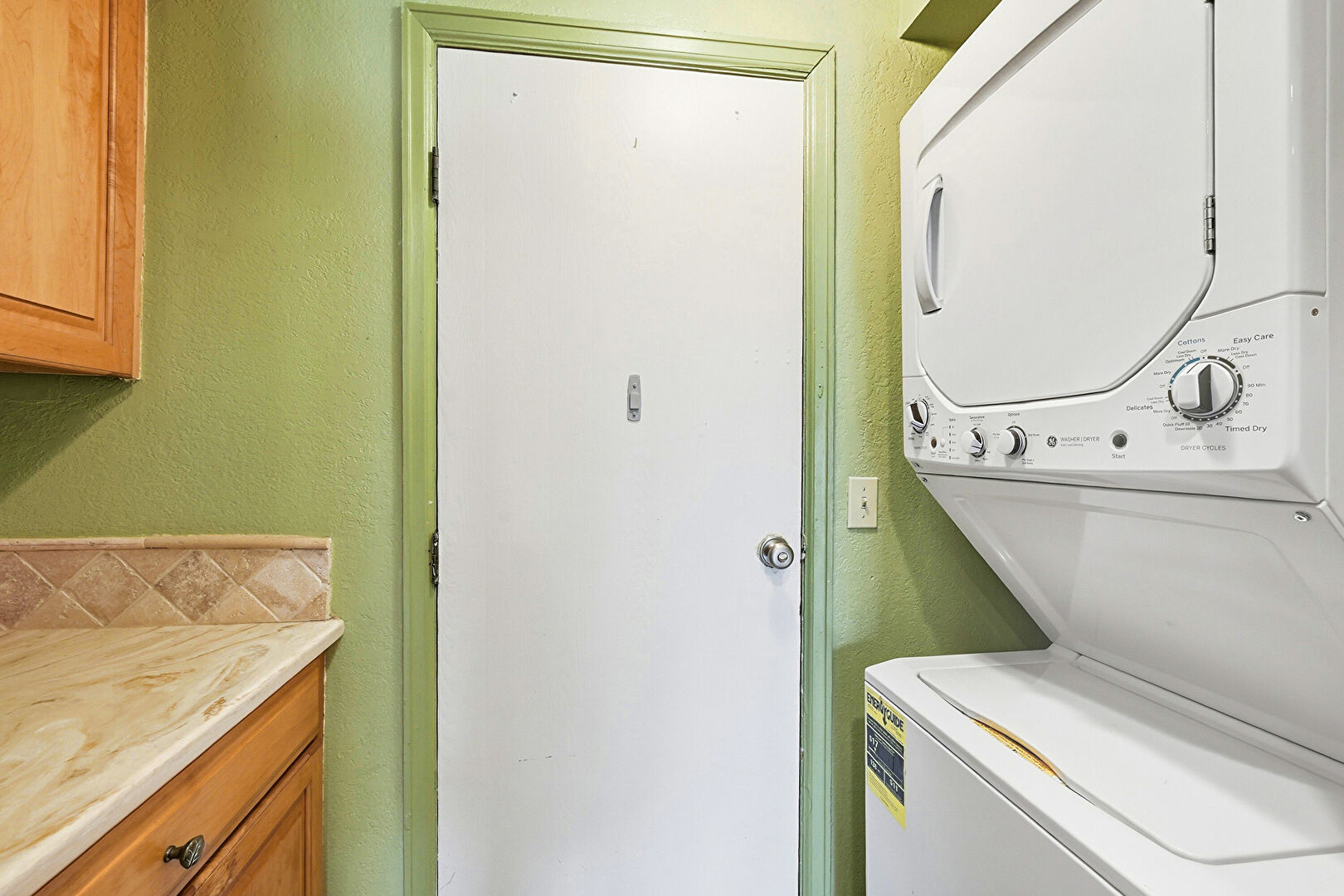 Baseboards Wall, Ceiling Fan, Drywall, Laundry, Medium Brown Cabinets, Natural Light, Raised Cabinets, Recessed Lighting, Textured Ceiling, Tile Floor, Vent, Washer Dryer, Wood Finish Floor, Ceiling Fan, Medium Brown Cabinets