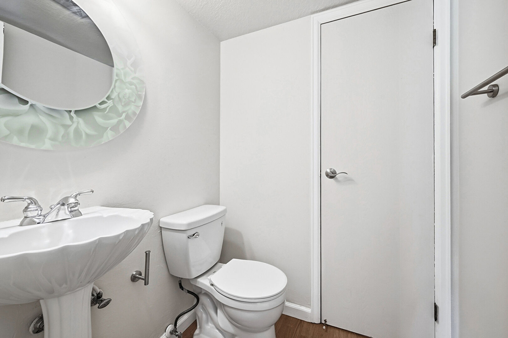 Baseboards Wall, Combined Bath Shower, Drywall, Half Bathroom, Textured Wall, Tile Floor, Vanity, Wood Finish Floor, Full Bathroom, Textured Ceiling