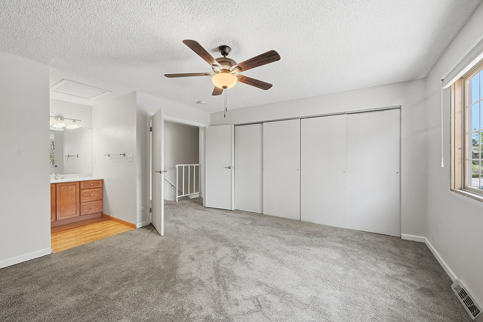 Baseboards Wall, Carpet, Ceiling Fan, Closet, Drywall, Ensuite Bathroom, Natural Light, Scuttle, Textured Ceiling, Vent, Carpet, Drywall