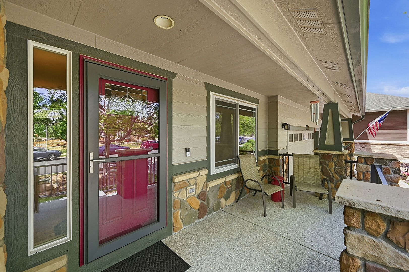 Concrete Foundation, Downspout, Driveway, Gutters, Horizontal Siding, Lawn, Shingle Roof, Stone Siding, Porch