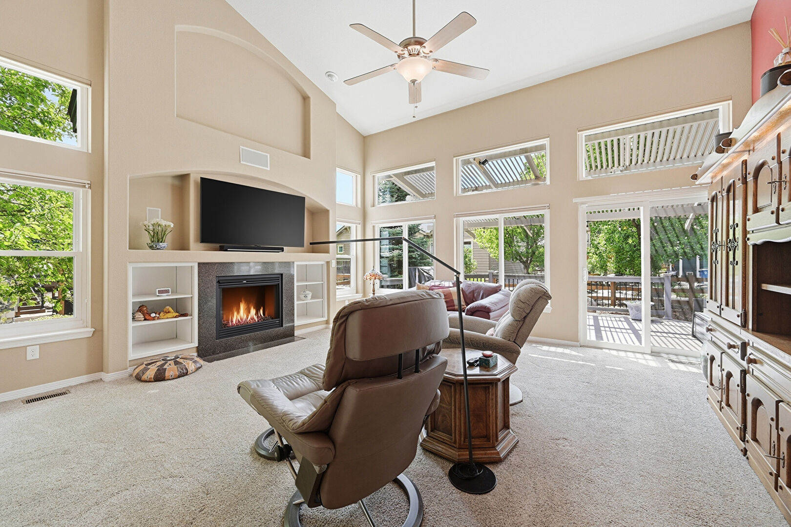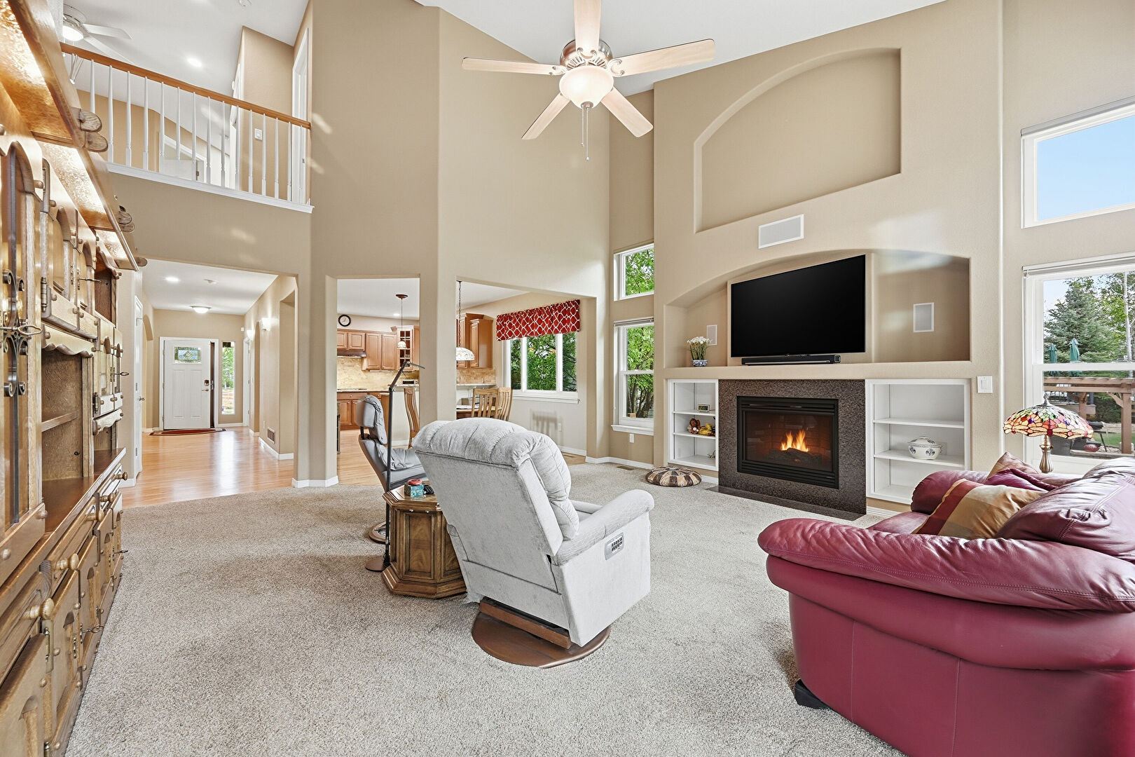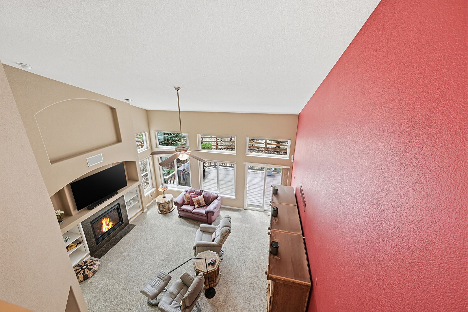 Baseboards Wall, Built In Shelves, Carpet, Ceiling Fan, Drywall, Fireplace, High Ceiling, Natural Light, Recessed Lighting, Textured Wall, Vaulted Ceiling, Vent, Carpet, Fireplace, High Ceiling, Vent