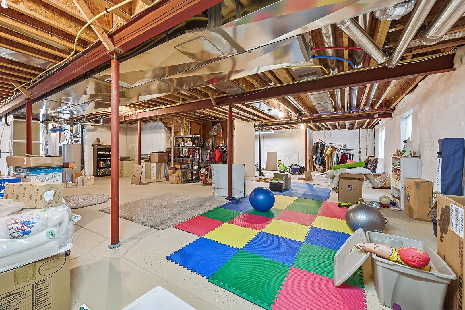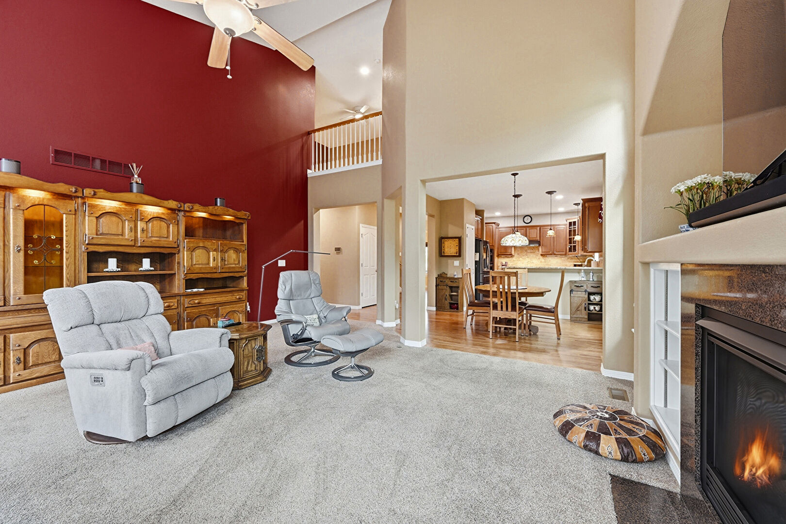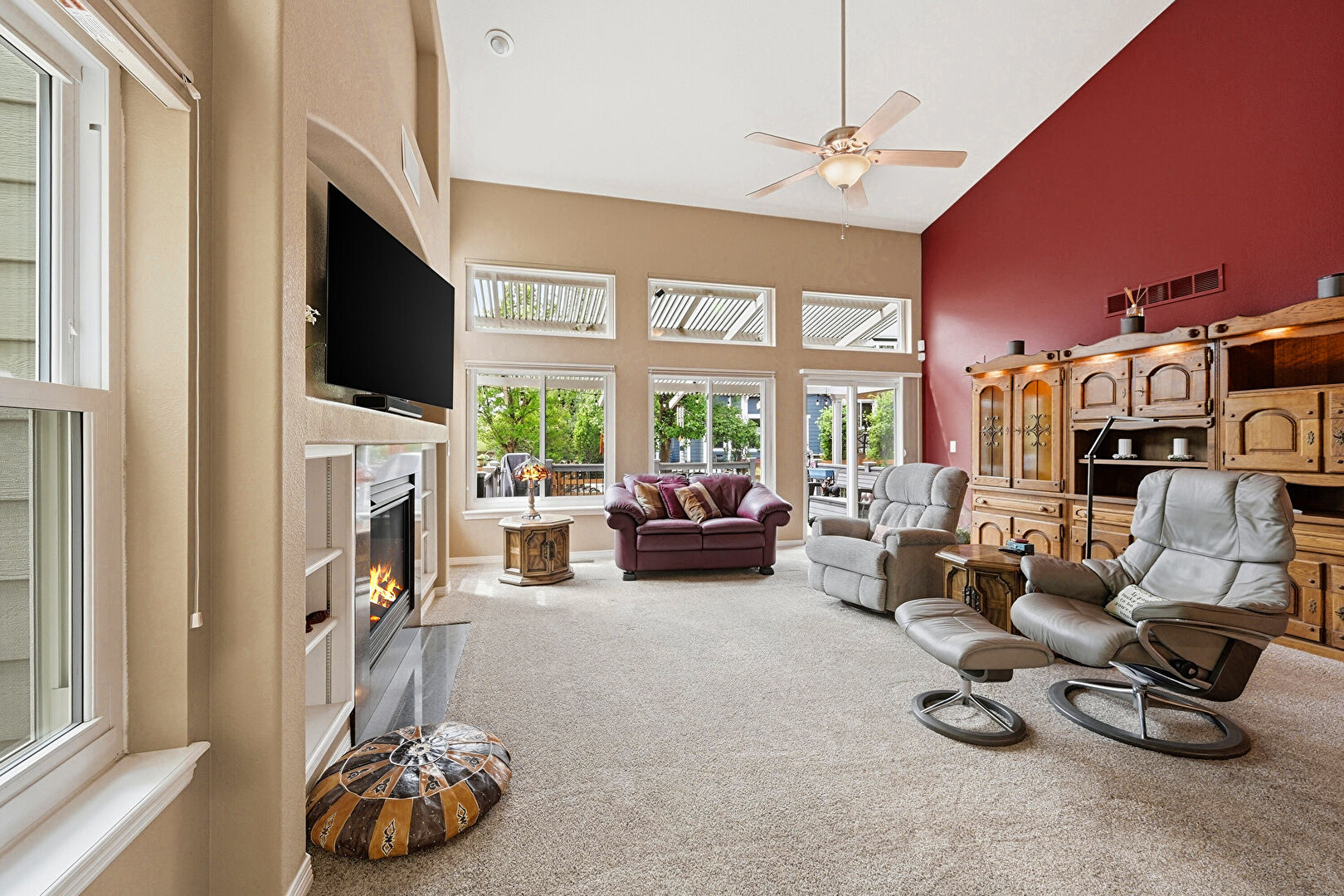 Baseboards Wall, Built In Shelves, Carpet, Ceiling Fan, Drywall, Fireplace, High Ceiling, Natural Light, Recessed Lighting, Textured Wall, Vaulted Ceiling, Vent, Carpet, Fireplace, High Ceiling, Vent
