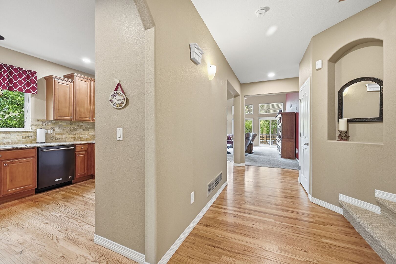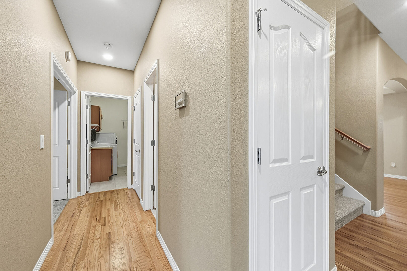 Arched Walkways, Baseboards Wall, Natural Light, Recessed Lighting, Smoke Carbon Monoxide Detector, Stairs, Textured Wall, Vent, Wood Finish Floor, Smoke Carbon Monoxide Detector, Wood Finish Floor