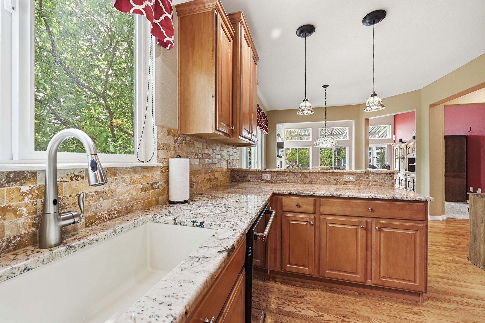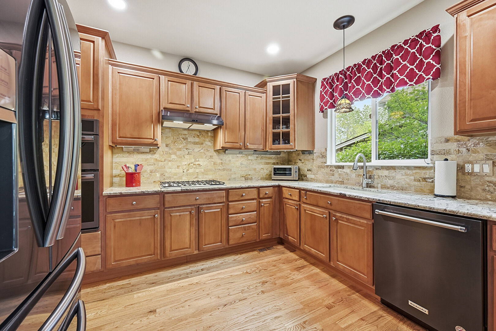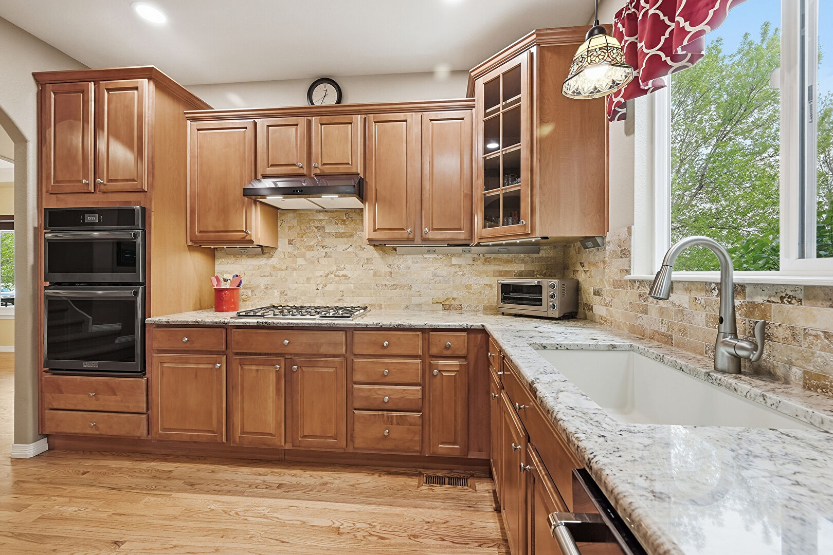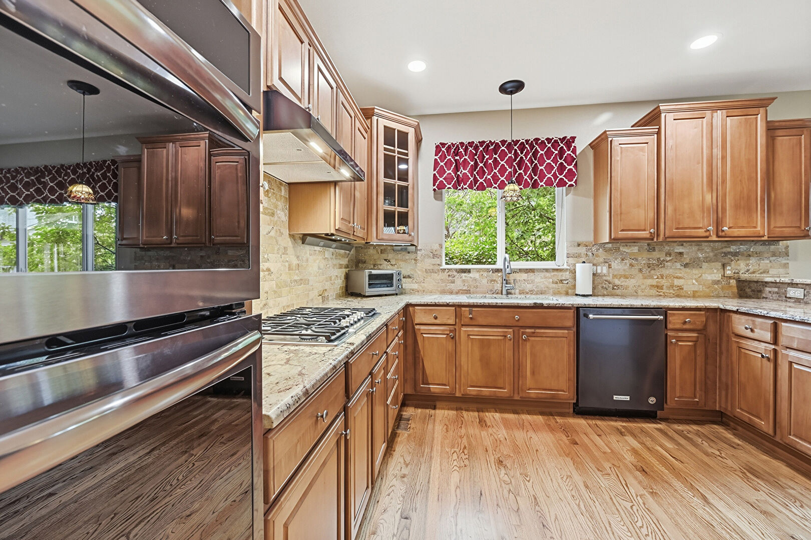 Crown Molding Cabinets, Double Oven, Drywall, Glass Insert Cabinets, Kitchen Peninsula, Medium Brown Cabinets, Natural Light, Opens To Living Area, Pendant Lighting, Raised Cabinets, Recessed Lighting, Stone Countertops, Toaster, Vent, Wood Finish Floor, Medium Brown Cabinets, Pendant Lighting, Raised Cabinets