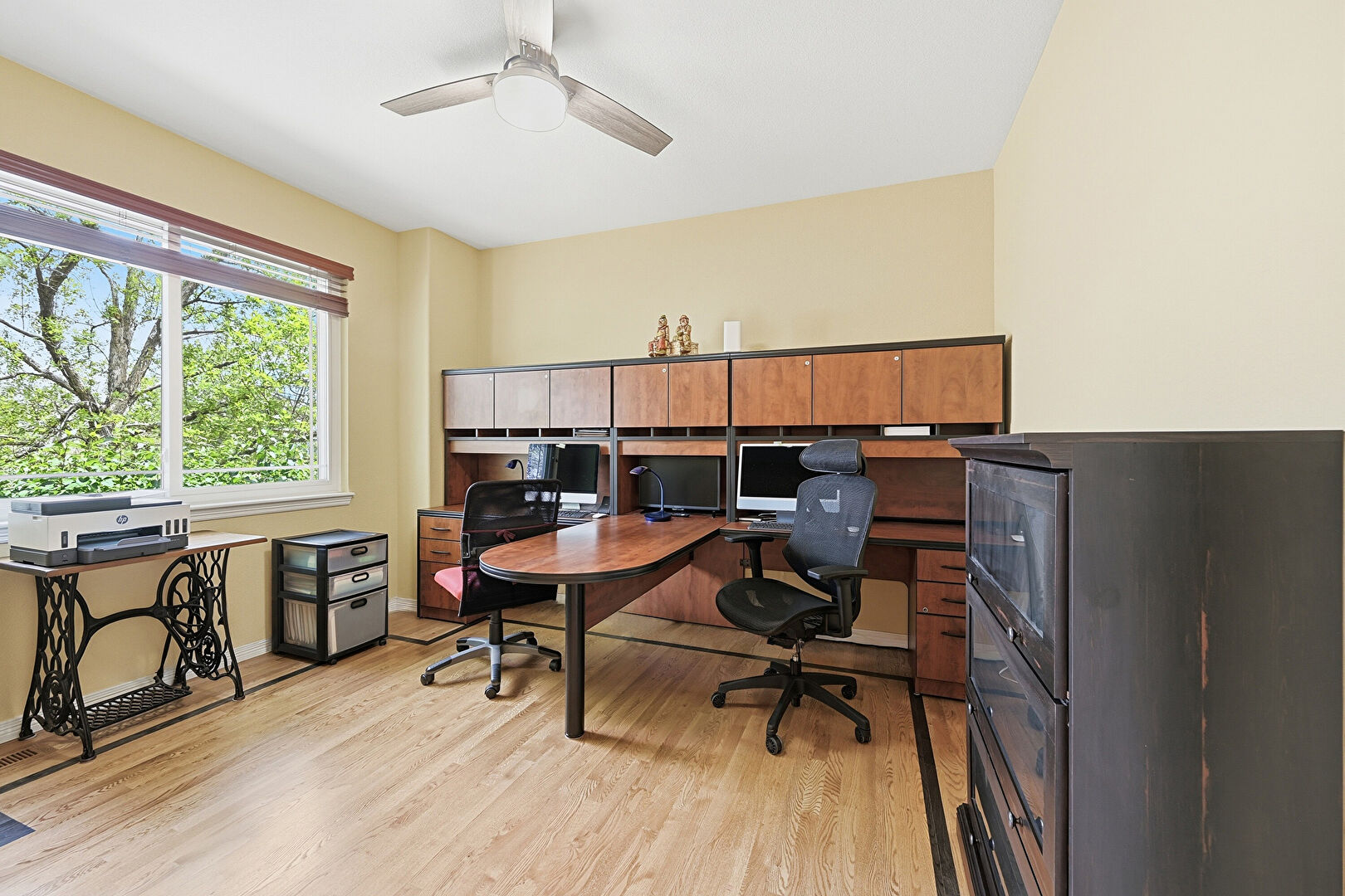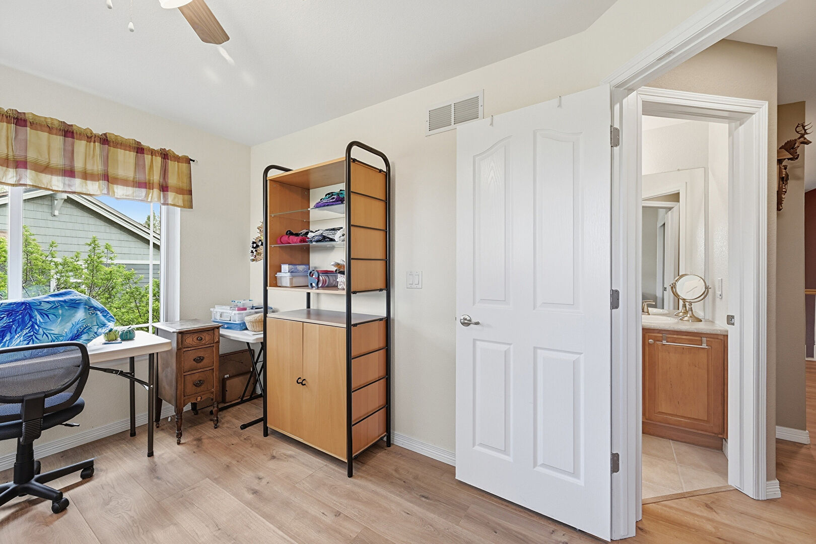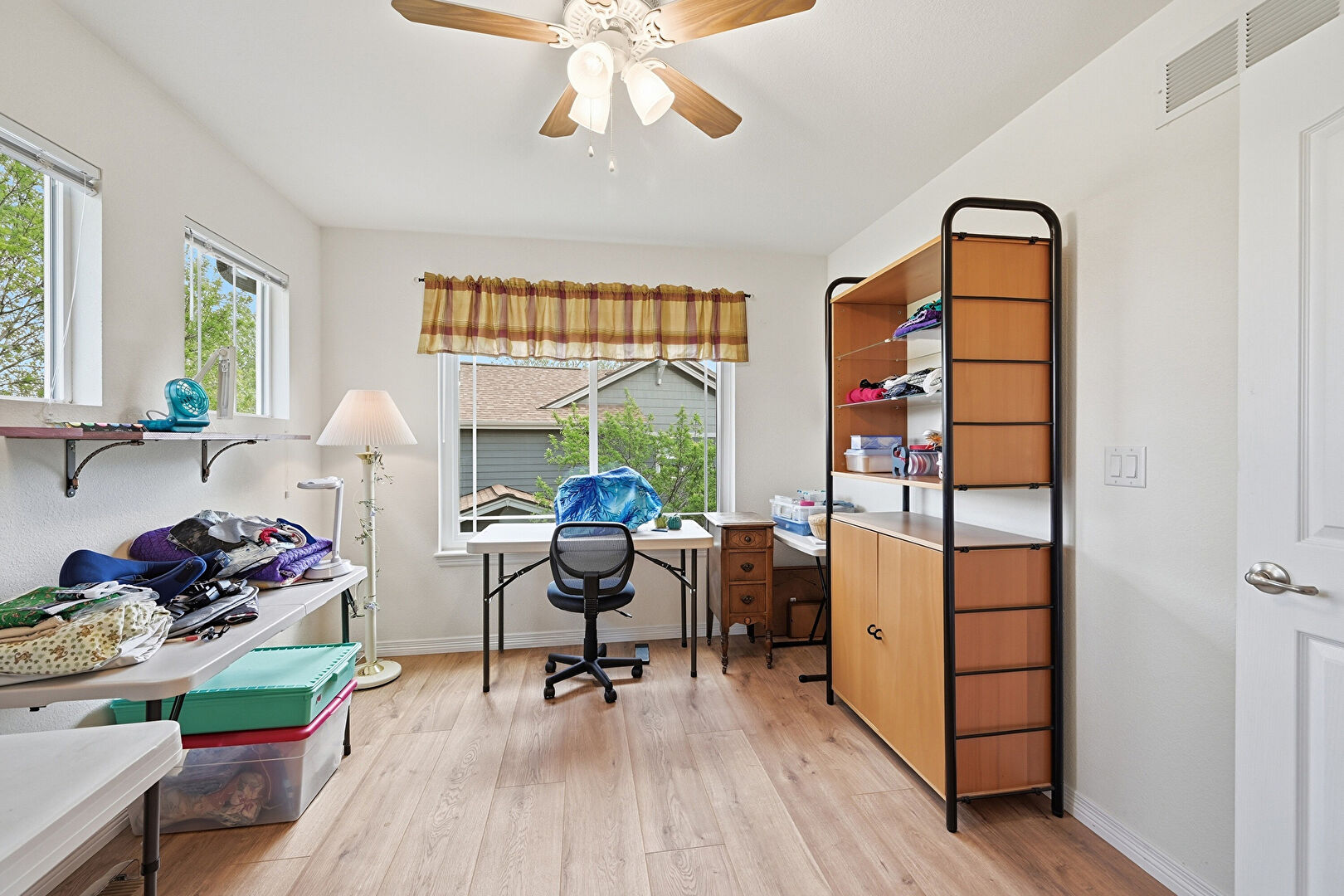 Baseboards Wall, Ceiling Fan, Drywall, Natural Light, Office Area, Wood Finish Floor, Vent