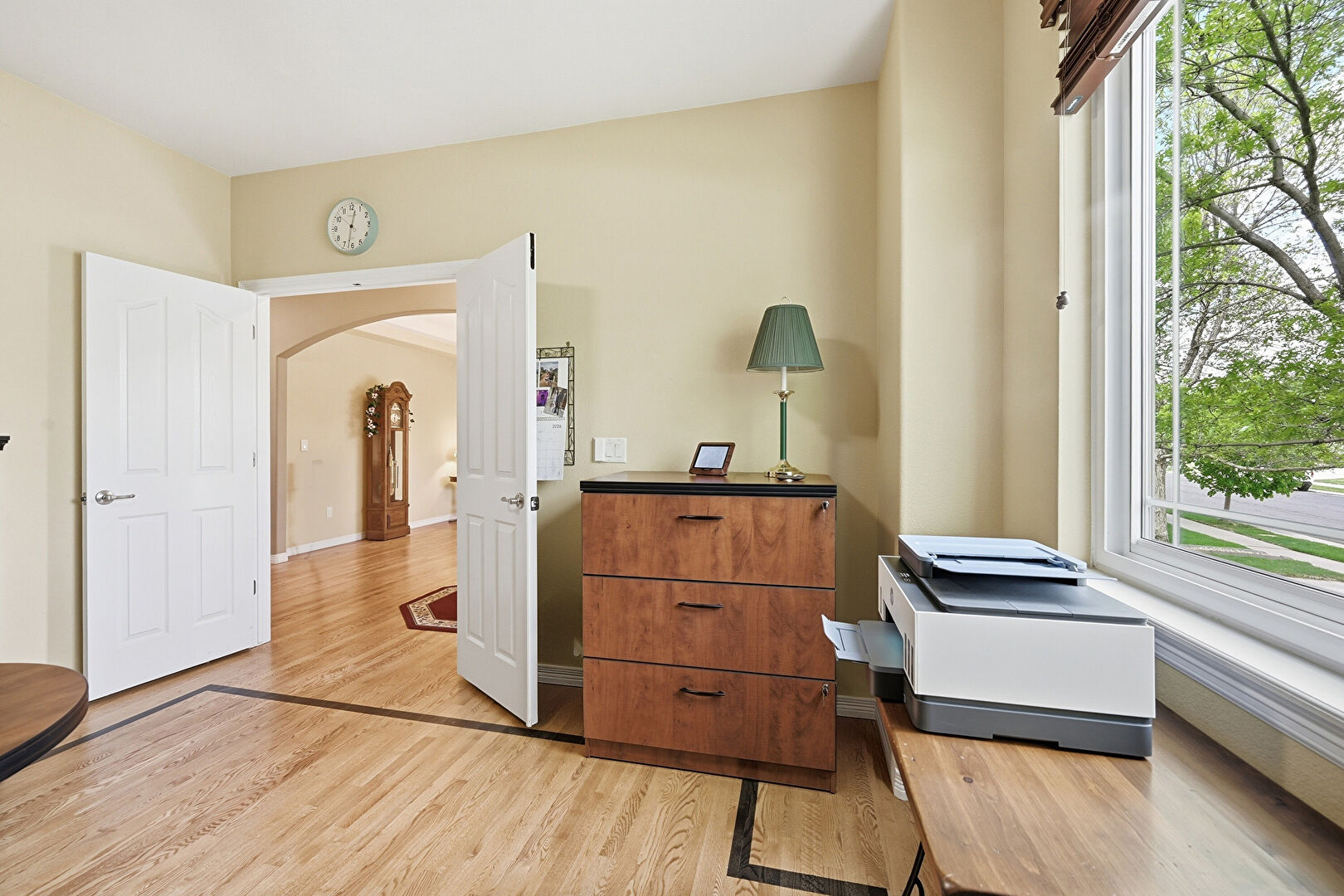 Arched Walkways, Baseboards Wall, Drywall, Natural Light, Office Area, Wood Finish Floor, Ceiling Fan, Natural Light