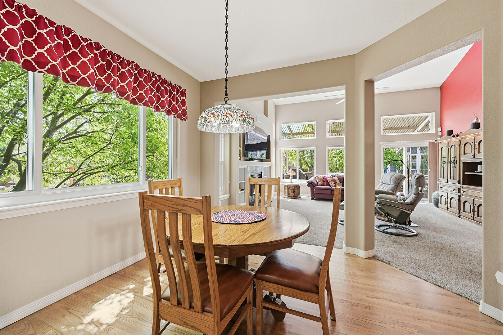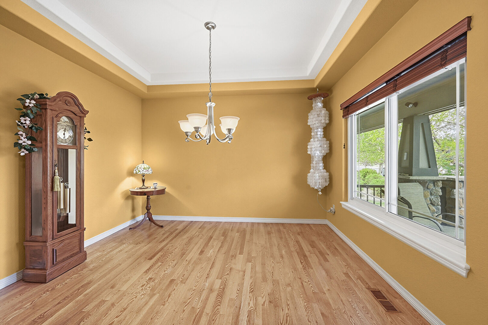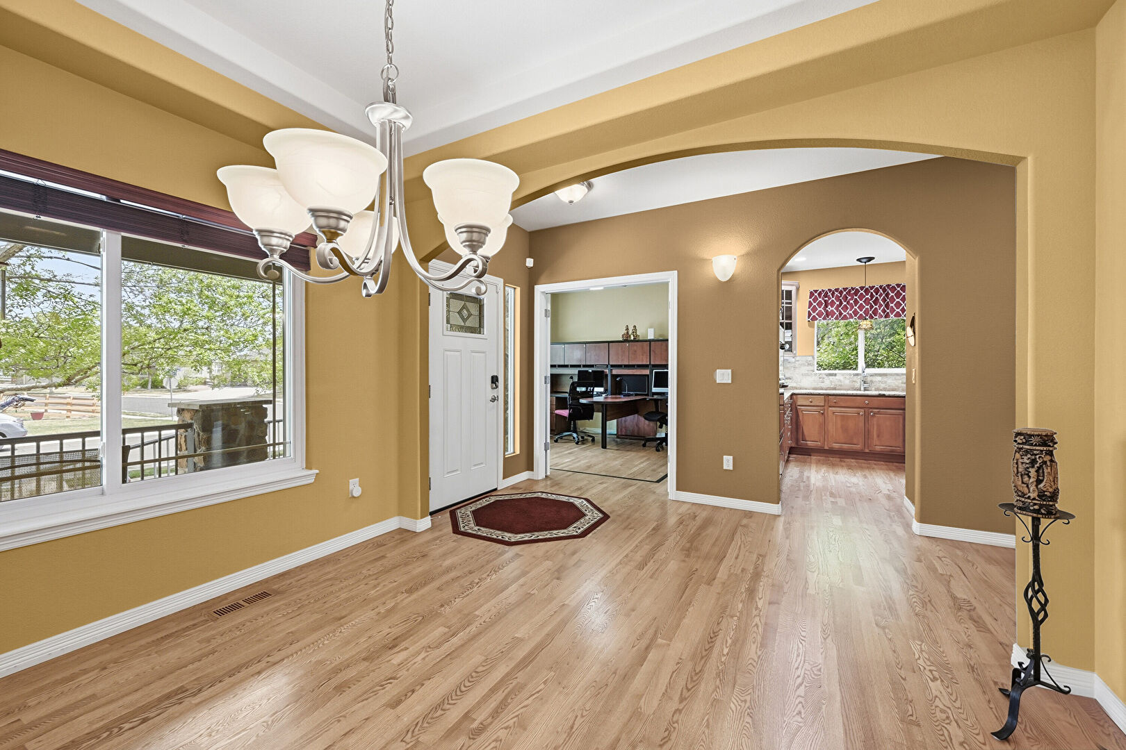 Arched Walkways, Baseboards Wall, Drywall, Natural Light, Notable Chandelier, Tray Ceiling, Vent, Wood Finish Floor, Baseboards Wall, Drywall