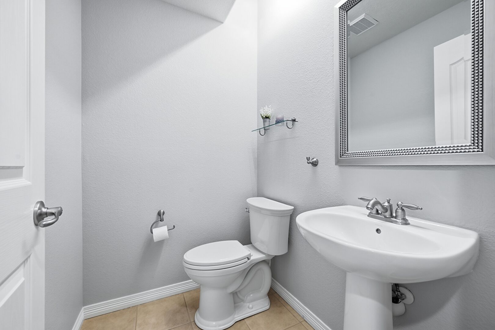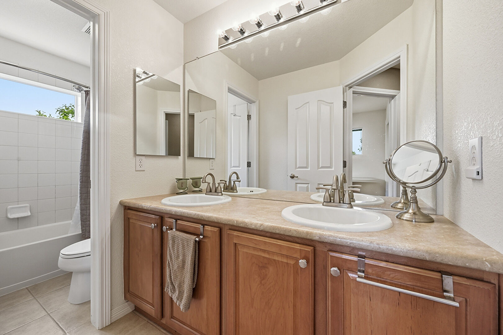 Baseboards Wall, Combined Bath Shower, Double Vanity, Full Bathroom, Half Bathroom, Textured Wall, Tile Floor, Natural Light, Vent