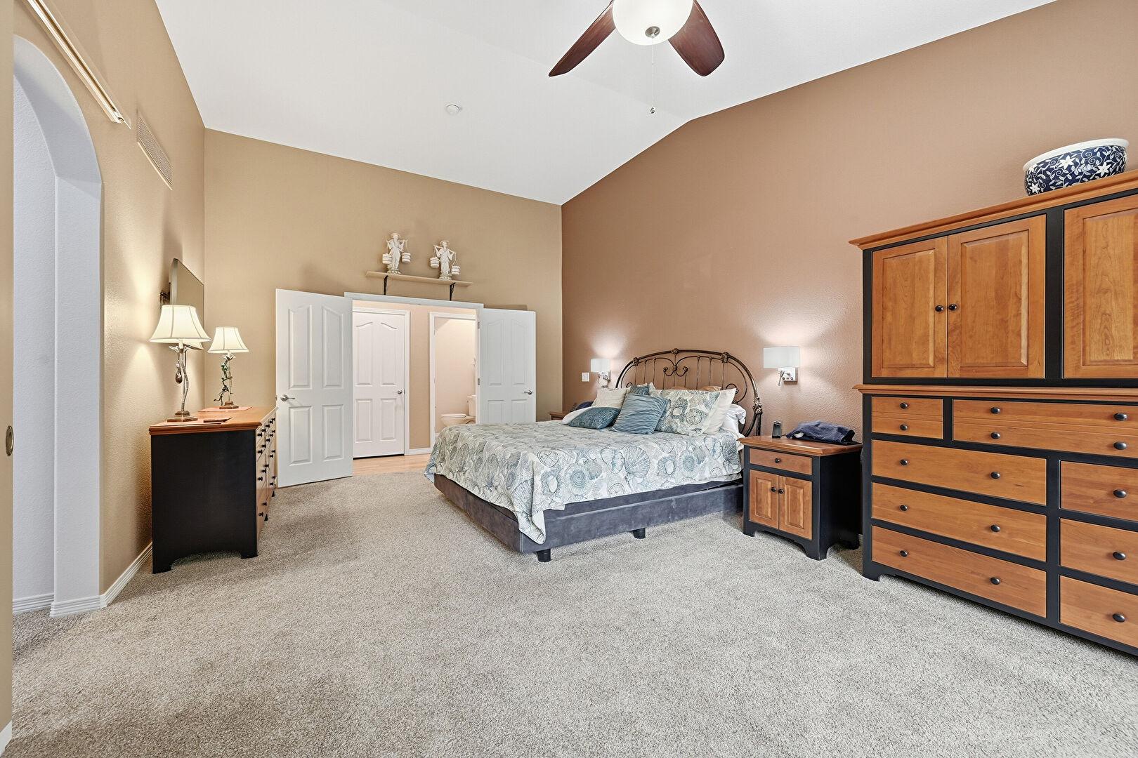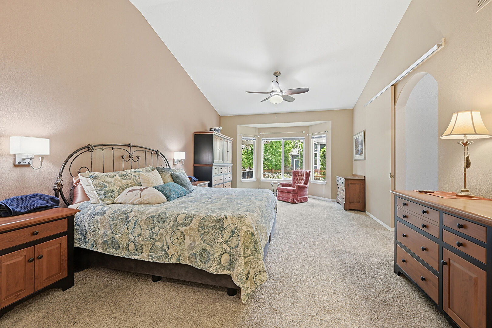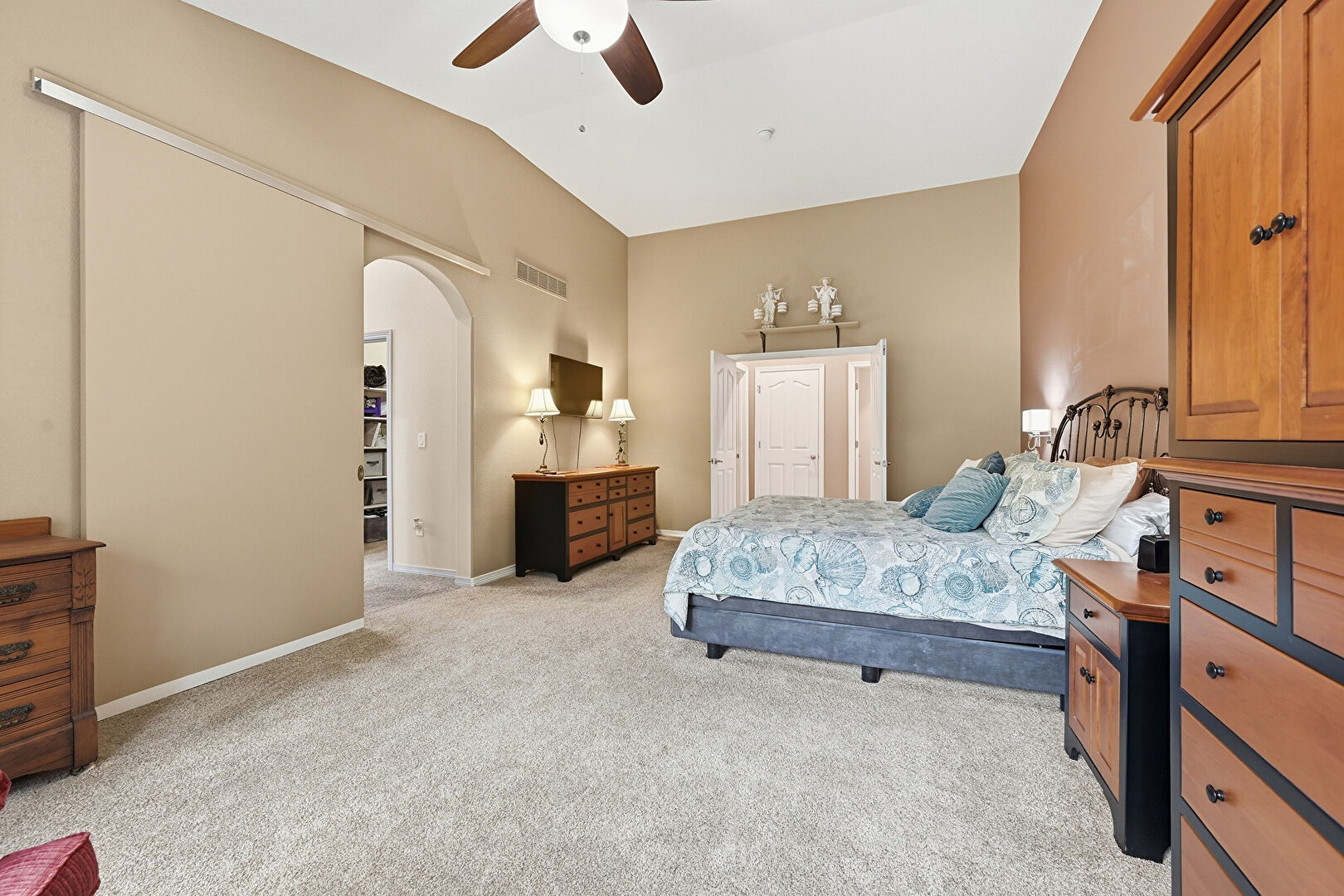 Arched Walkways, Baseboards Wall, Carpet, Cathedral Ceiling, Ceiling Fan, Drywall, High Ceiling, Natural Light, Vaulted Ceiling, Carpet, Vaulted Ceiling, Vent