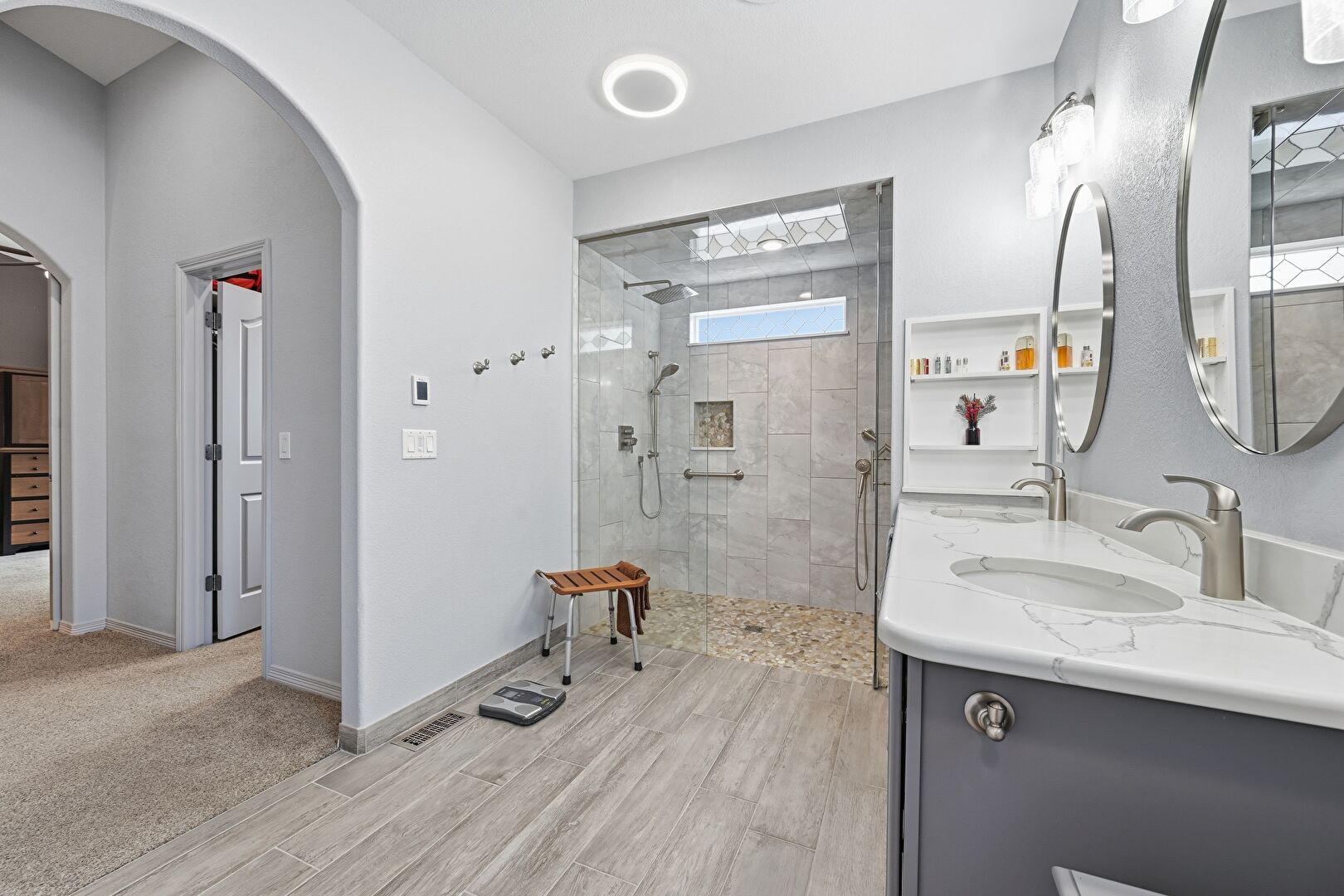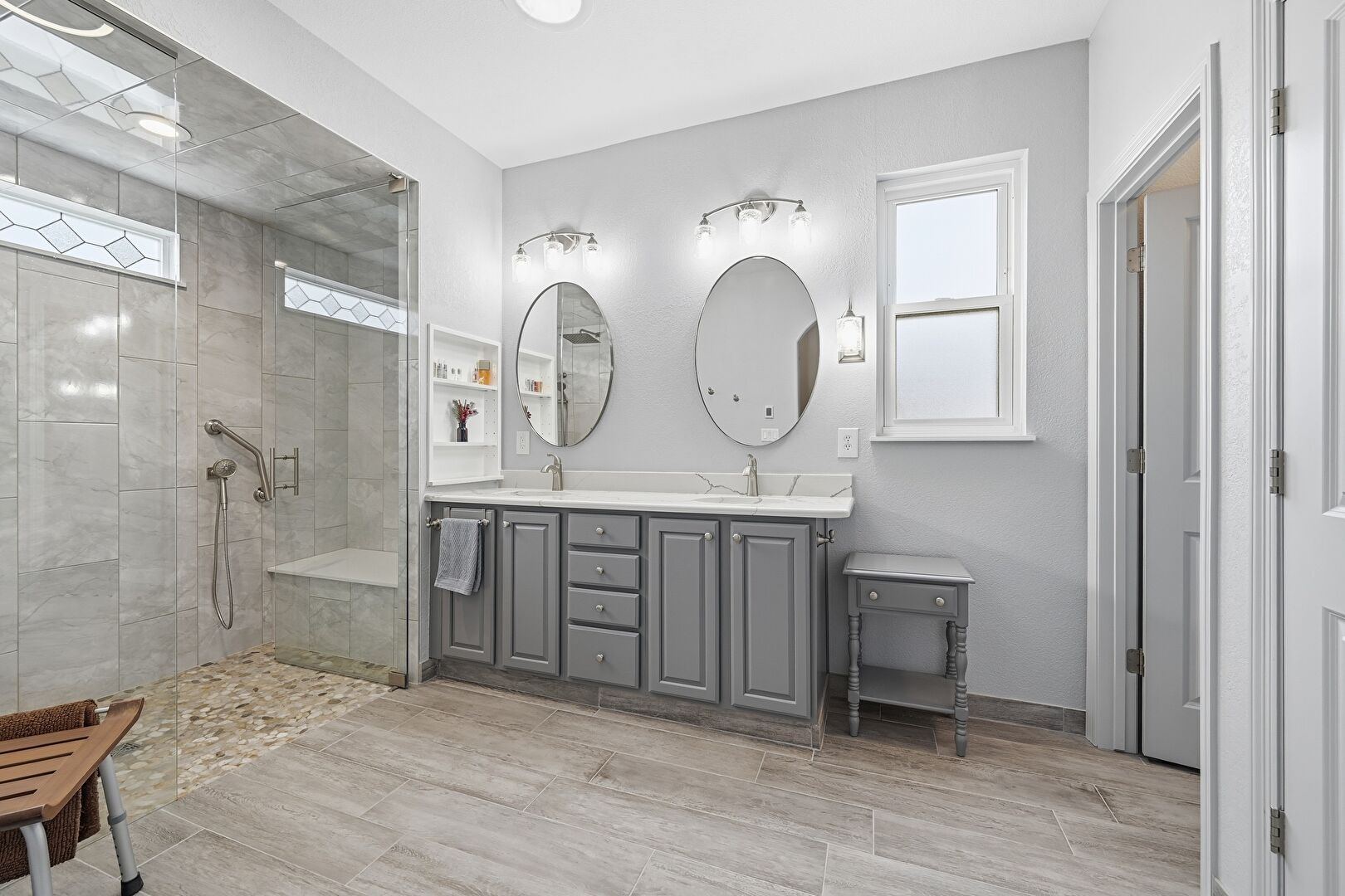 Baseboards Wall, Double Vanity, Drywall, Full Bathroom, Recessed Lighting, Vent, Wood Finish Floor, Natural Light