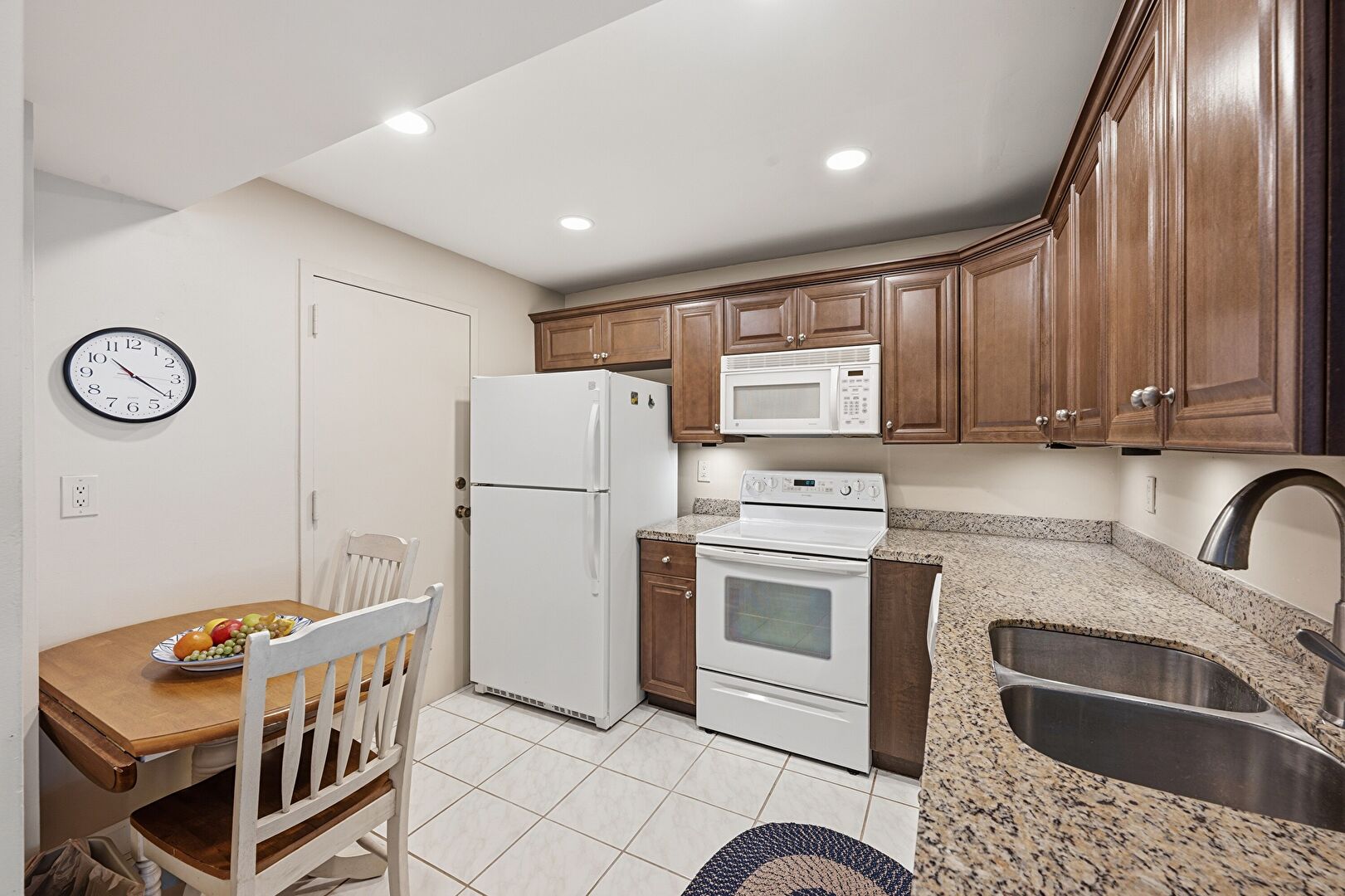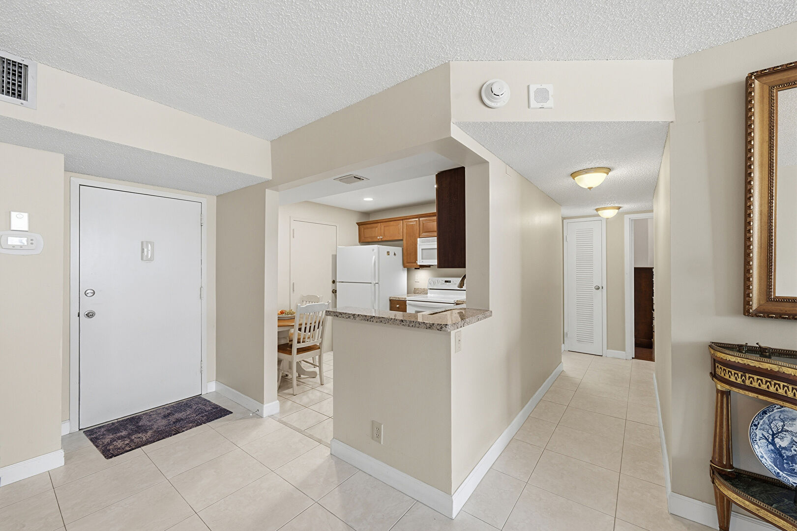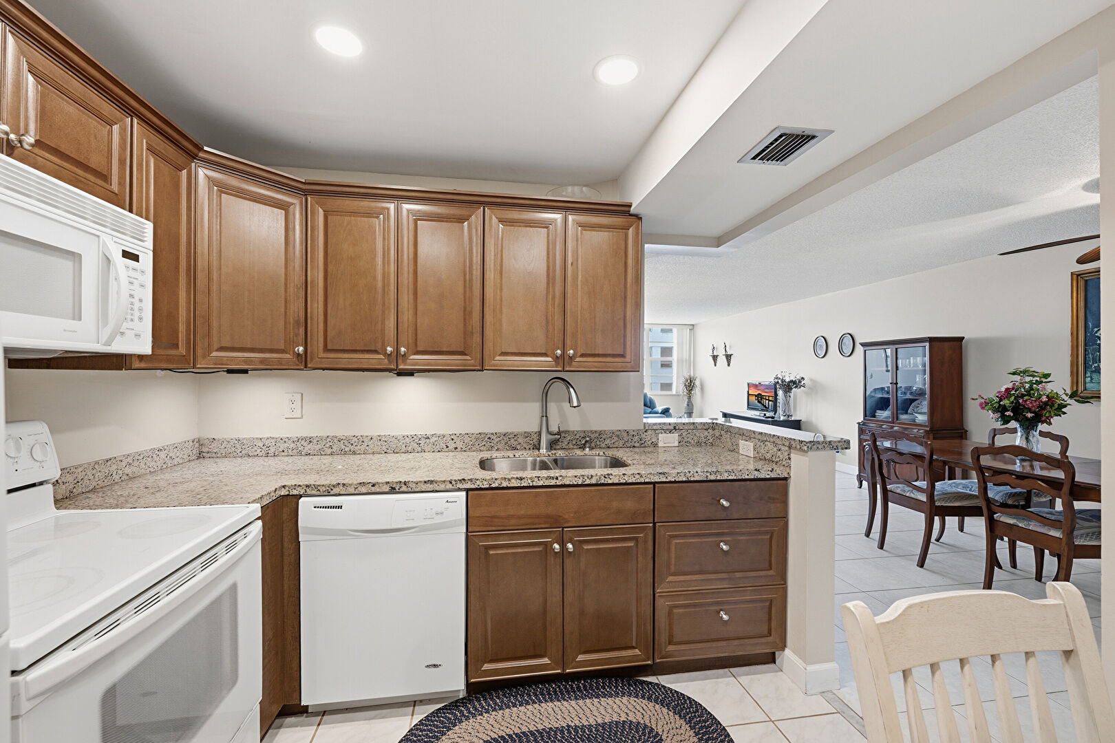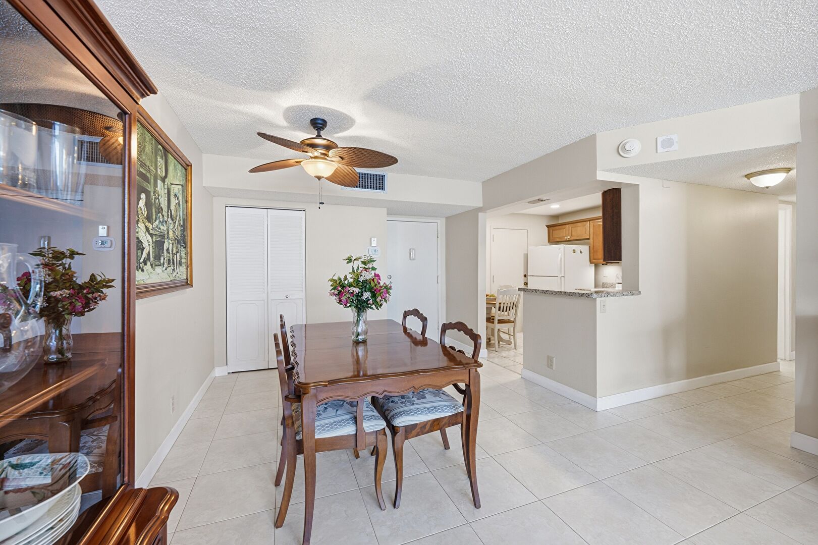 Baseboards Wall, Ceiling Fan, Crown Molding Cabinets, Drywall, Kitchen Peninsula, Medium Brown Cabinets, Natural Light, Raised Cabinets, Recessed Lighting, Shaker Cabinets, Smoke Carbon Monoxide Detector, Stone Countertops, Tile Floor, Vent, Stone Countertops, Textured Ceiling, Vent