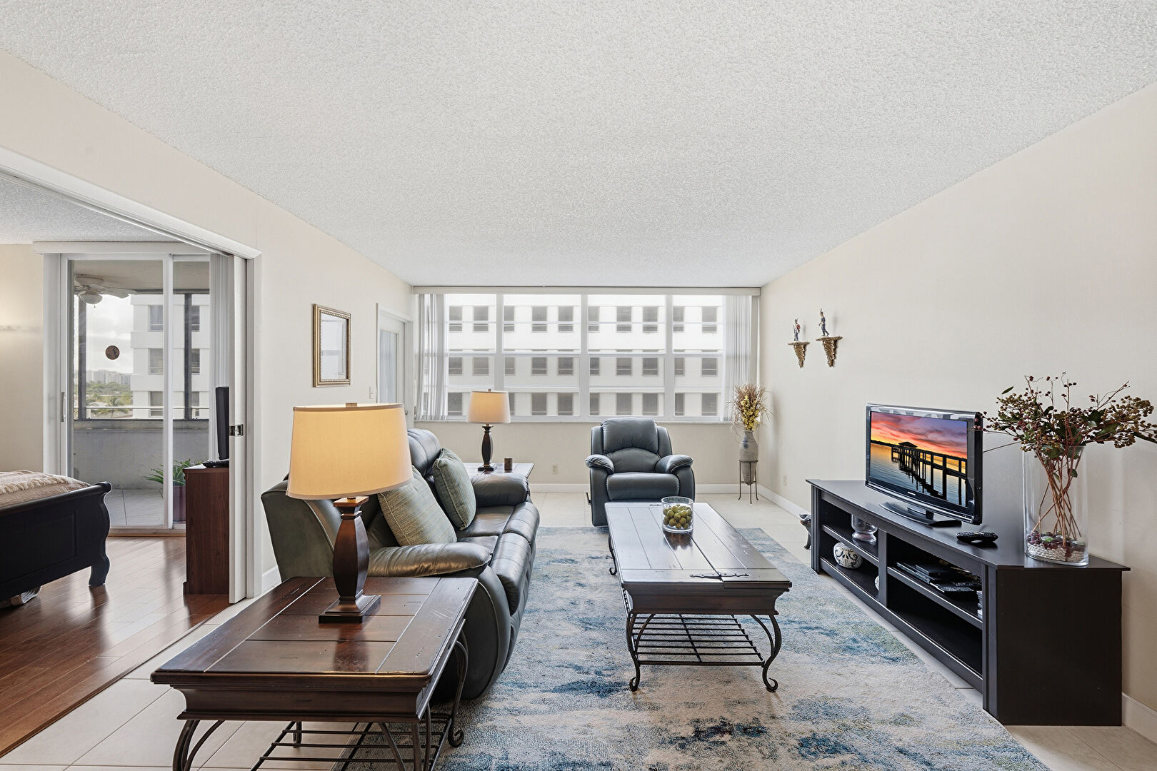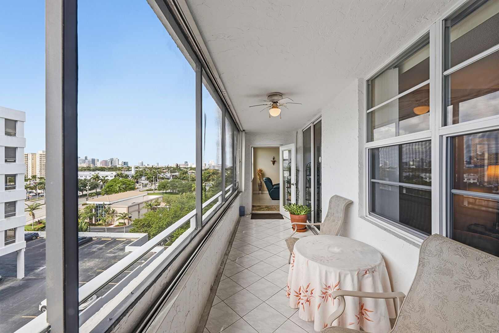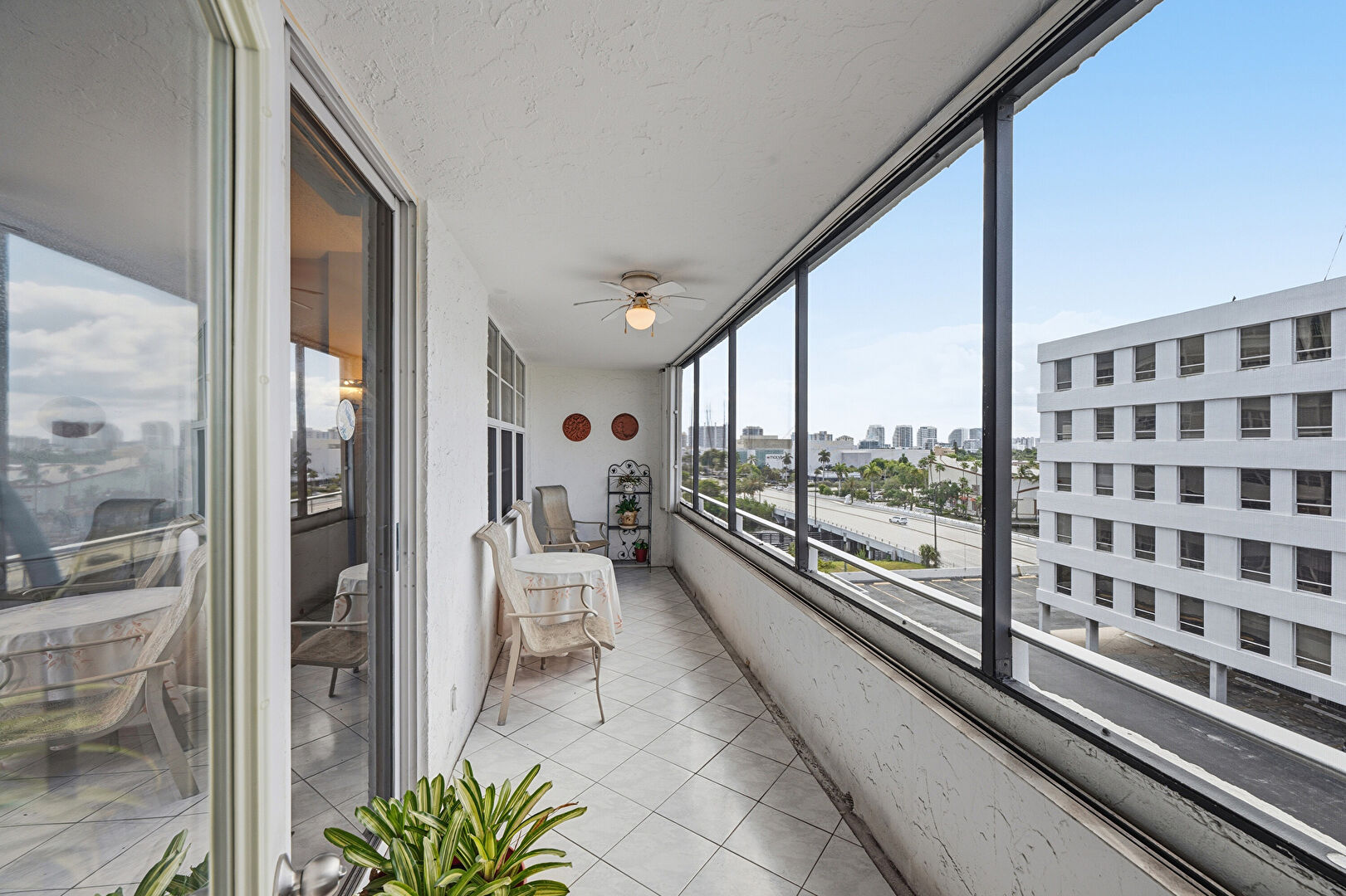 Ceiling Fan, City View, Drywall, Natural Light, Sunroom, Tile Floor, City View, Textured Ceiling
