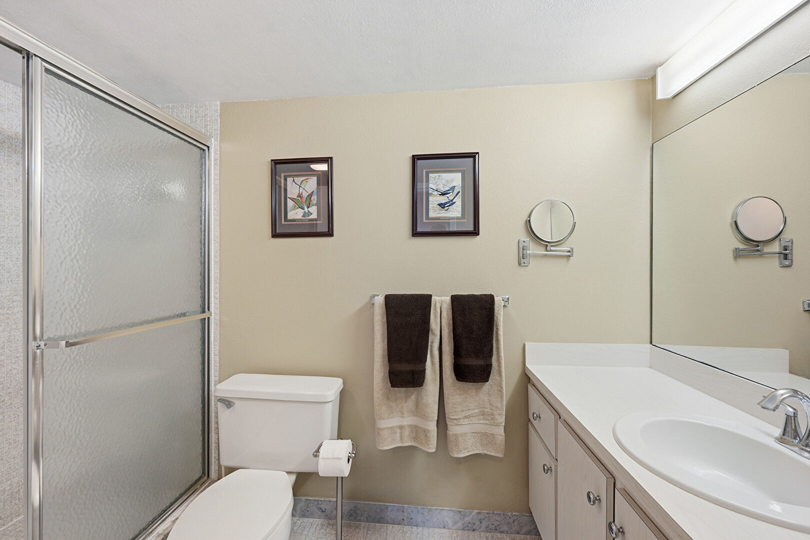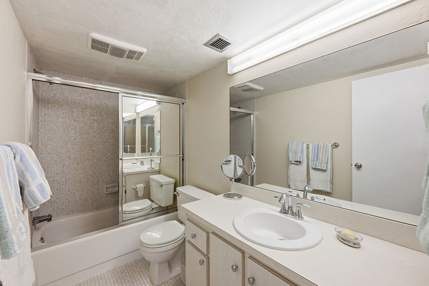 Baseboards Wall, Combined Bath Shower, Drywall, Full Bathroom, Textured Ceiling, Tile Floor, Vanity, Vent, Drywall, Vanity