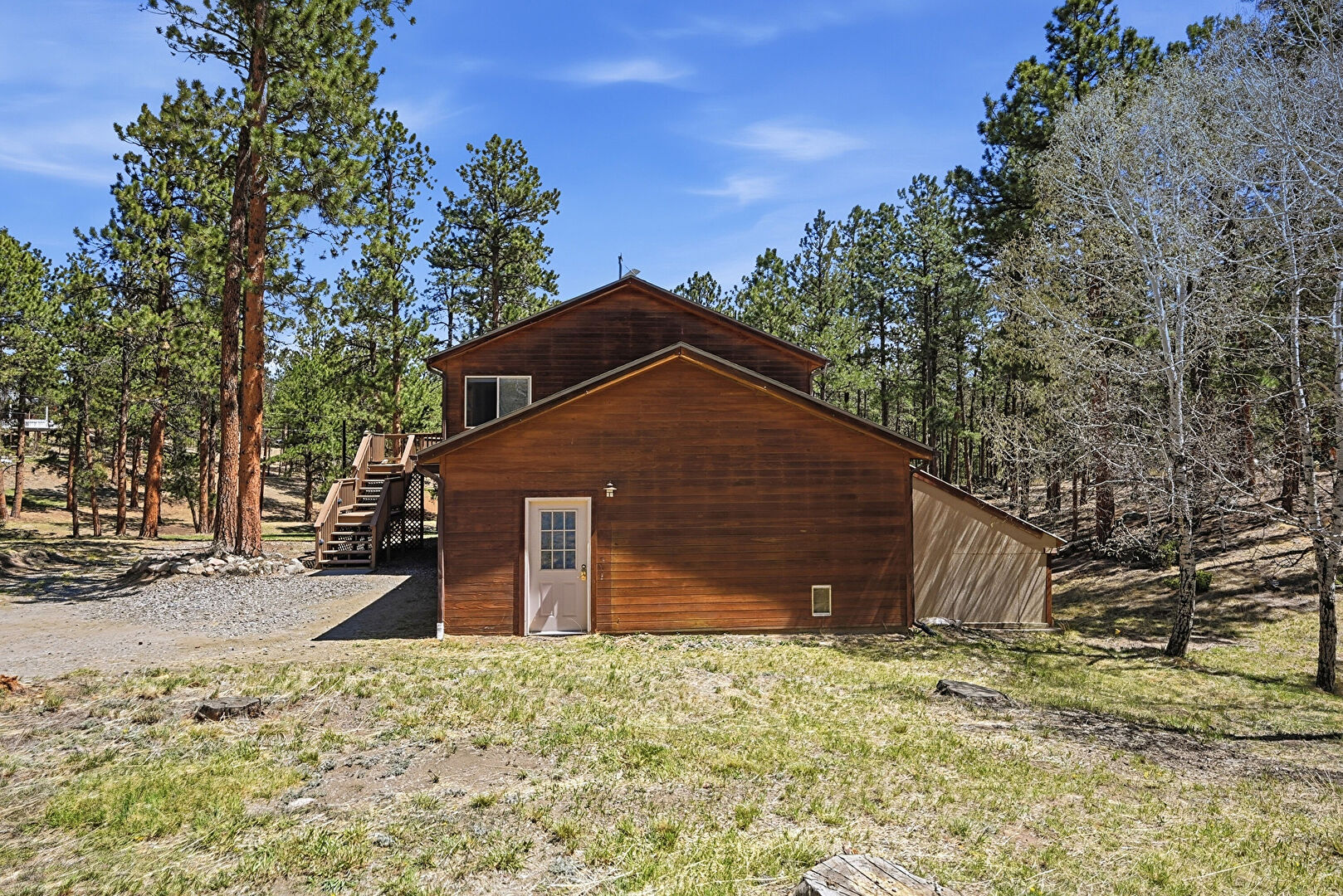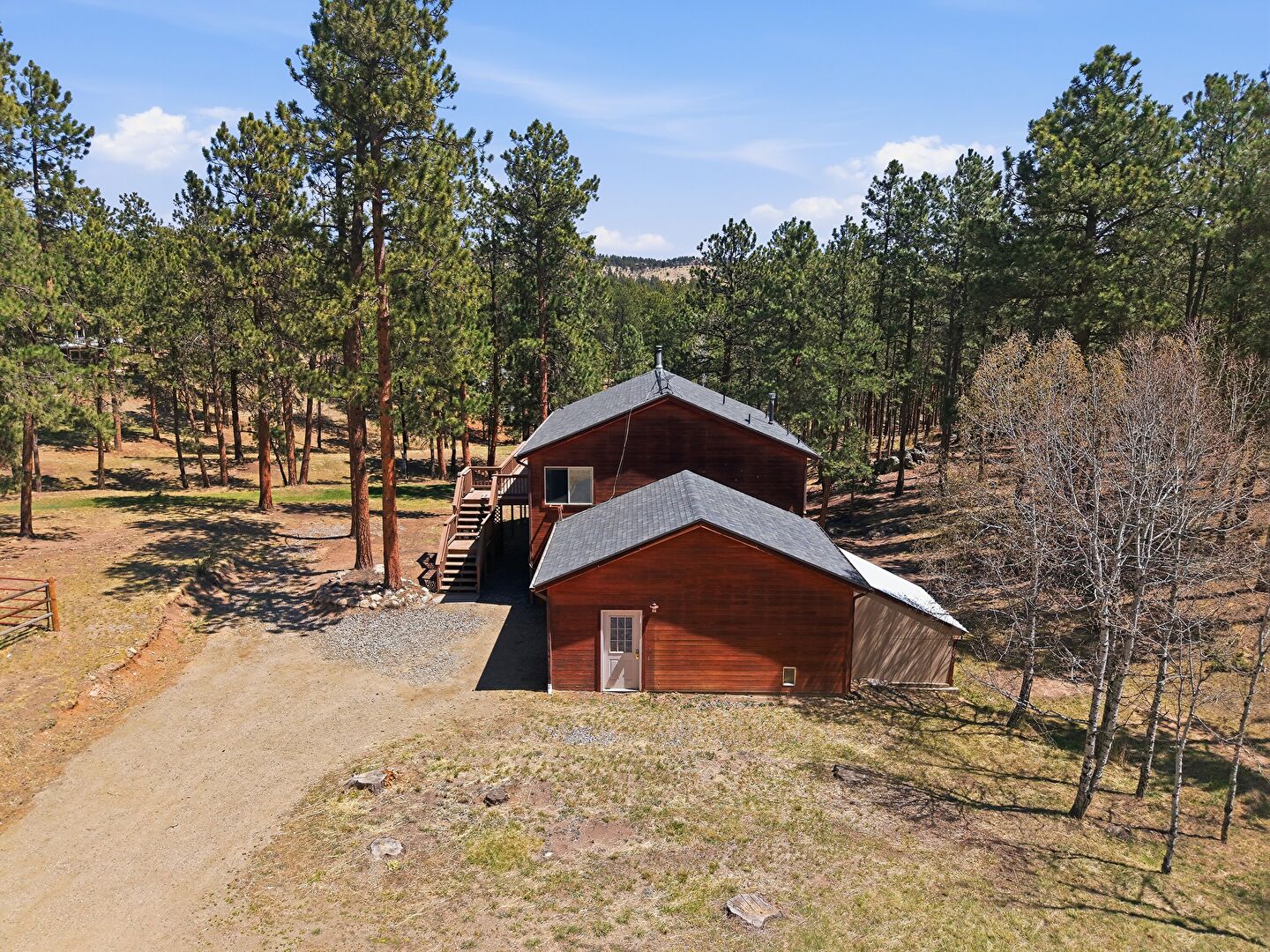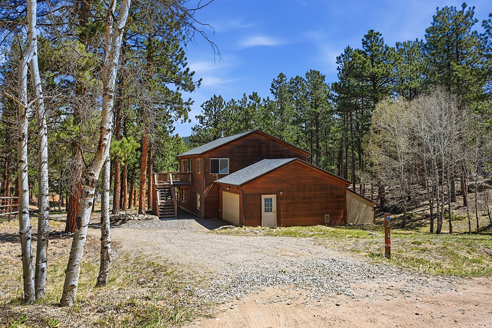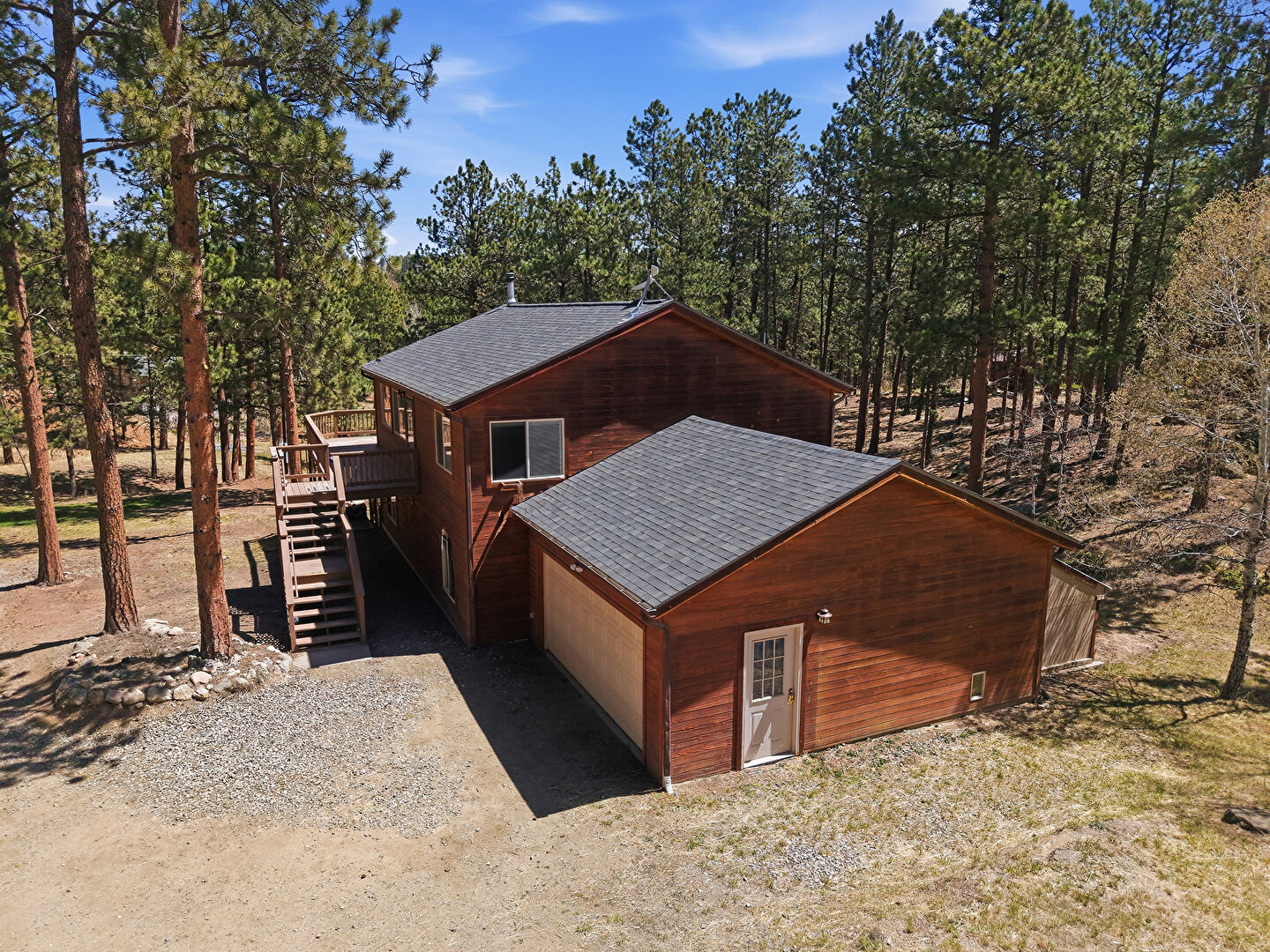 Deck, Downspout, Driveway, Garage, Gutters, Horizontal Siding, Lawn, Outdoor Structure, Shingle Roof, Stairs, Wood Siding, Woods View, Barn, Driveway, Gutters, Horizontal Siding