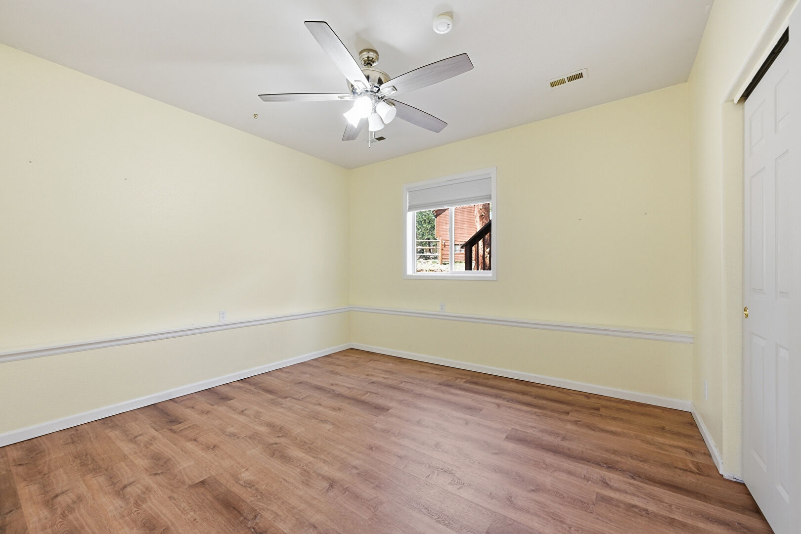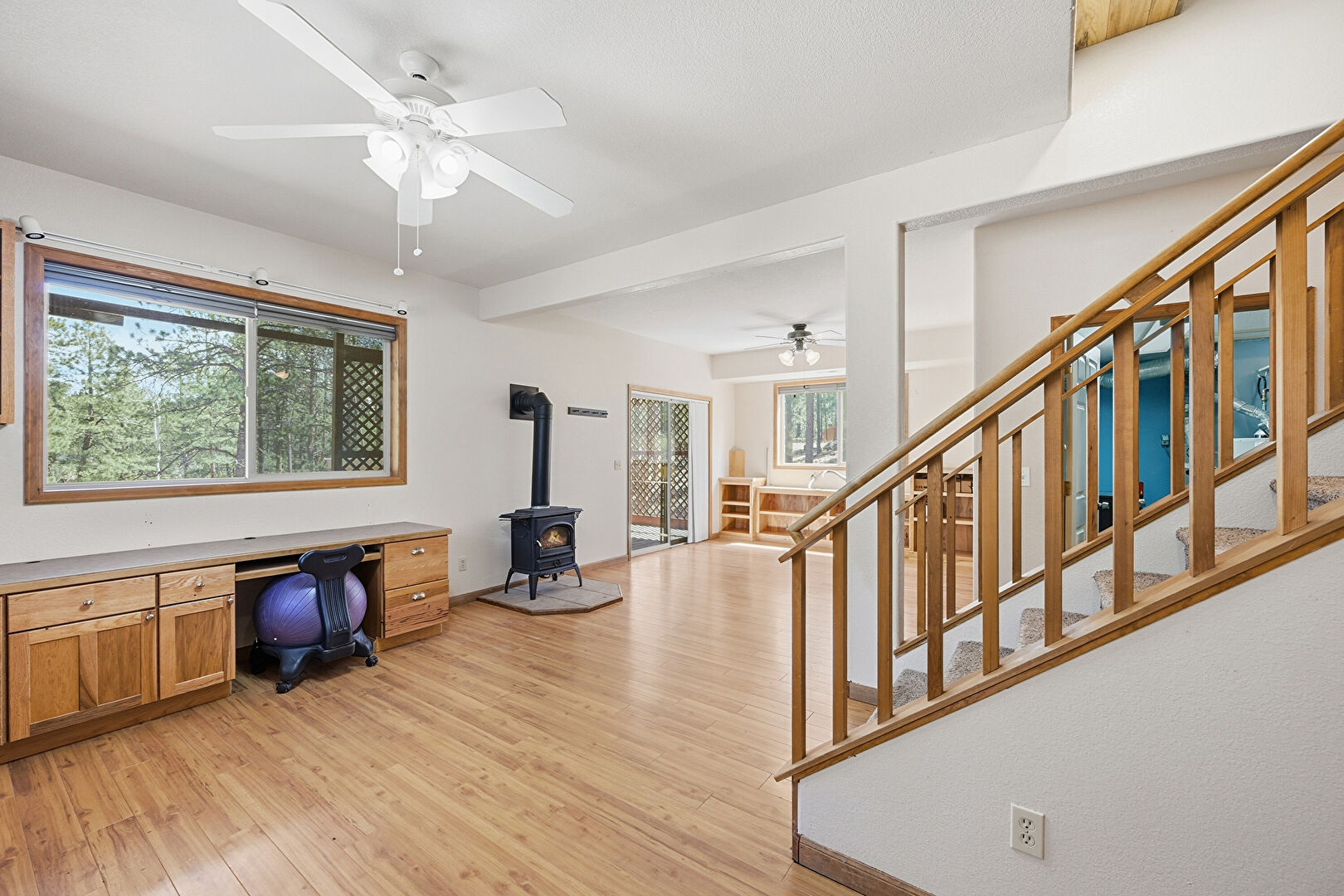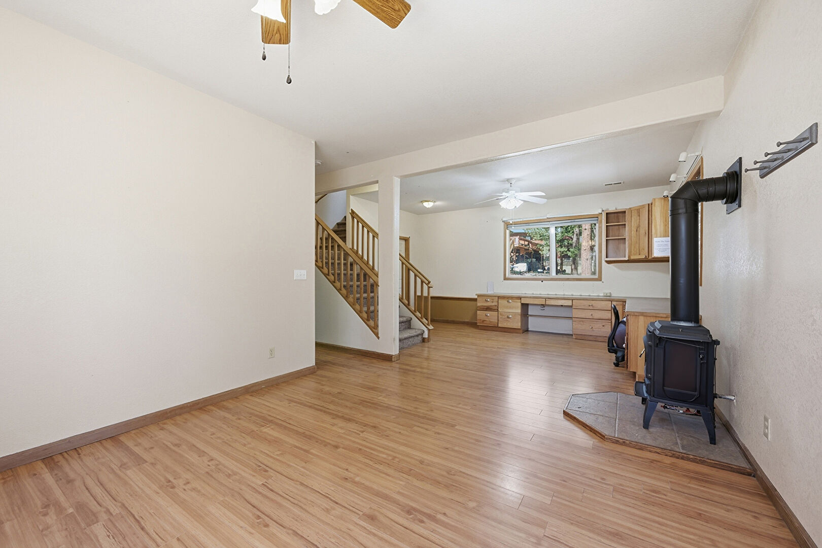 Baseboards Wall, Ceiling Fan, Drywall, Natural Light, Stairs, Vent, Wood Finish Floor, Wood Stove, Drywall, Natural Light