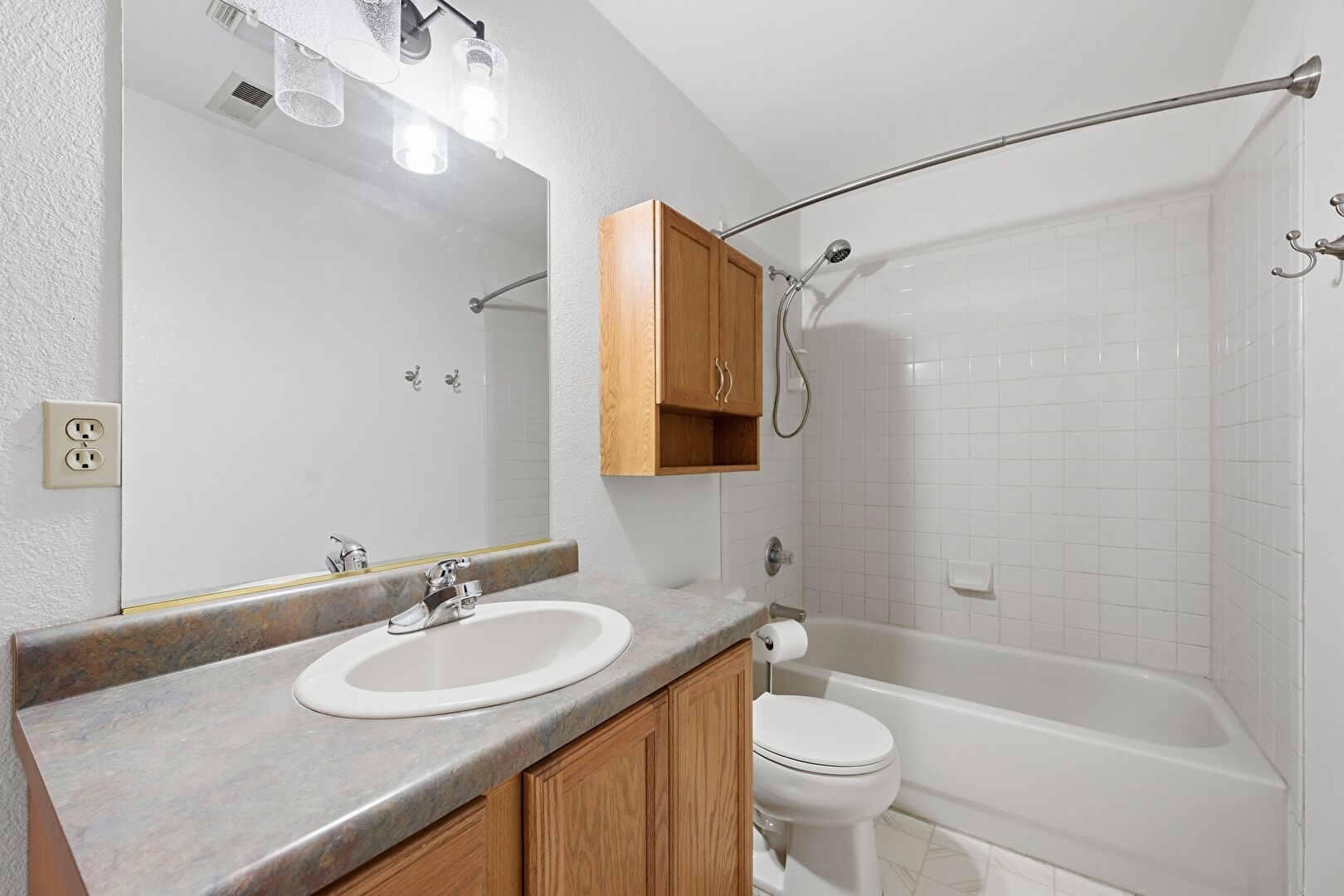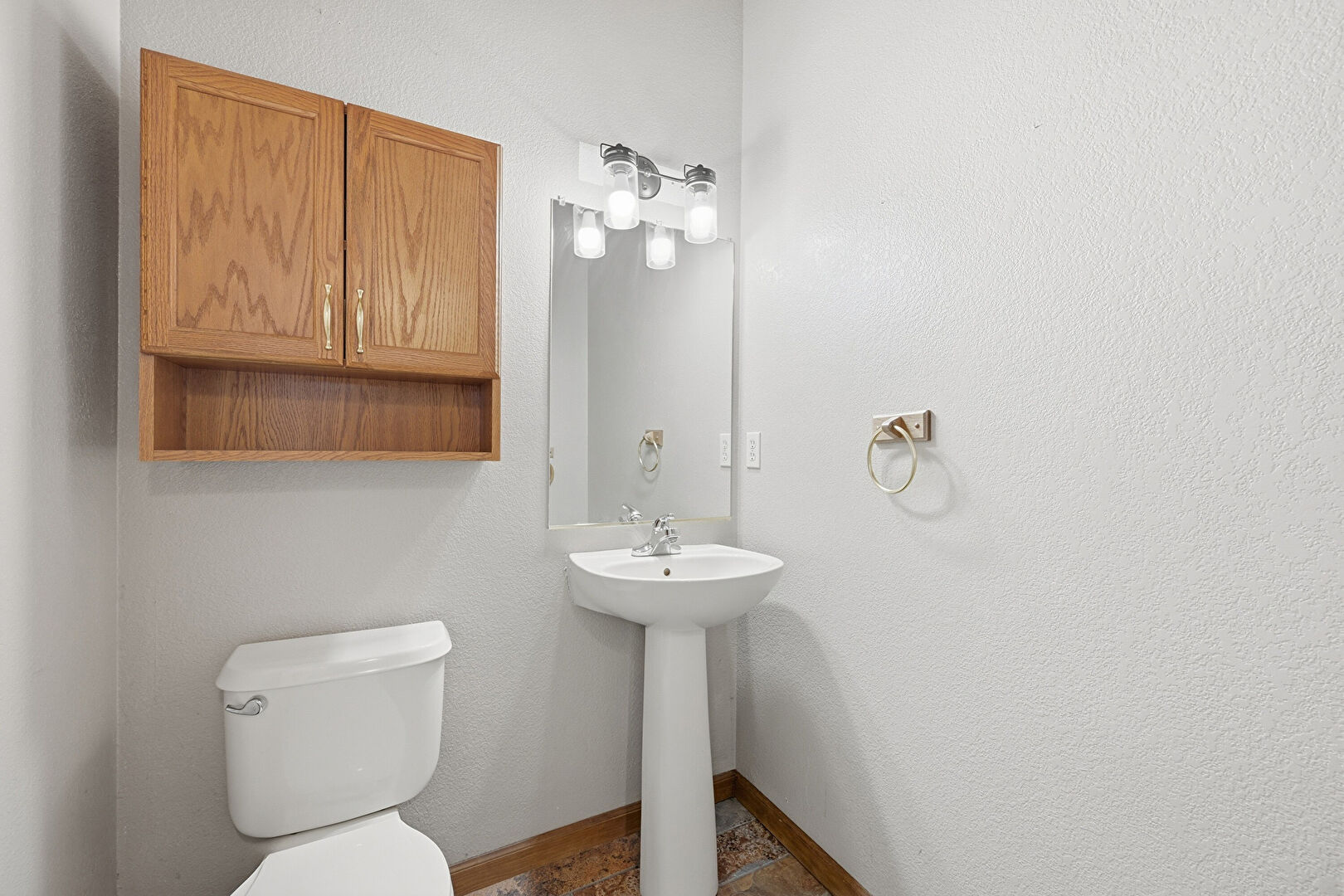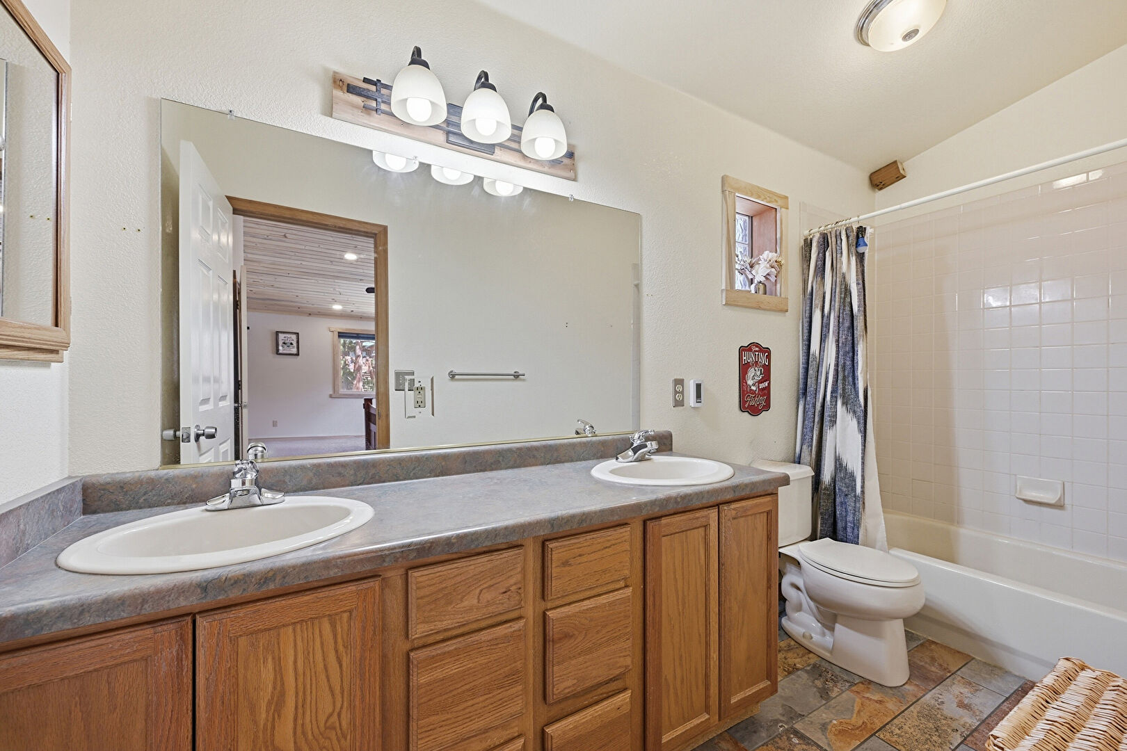 Baseboards Wall, Combined Bath Shower, Double Vanity, Drywall, Full Bathroom, Textured Wall, Vent, Half Bathroom, Stone Finish Floor, Vanity