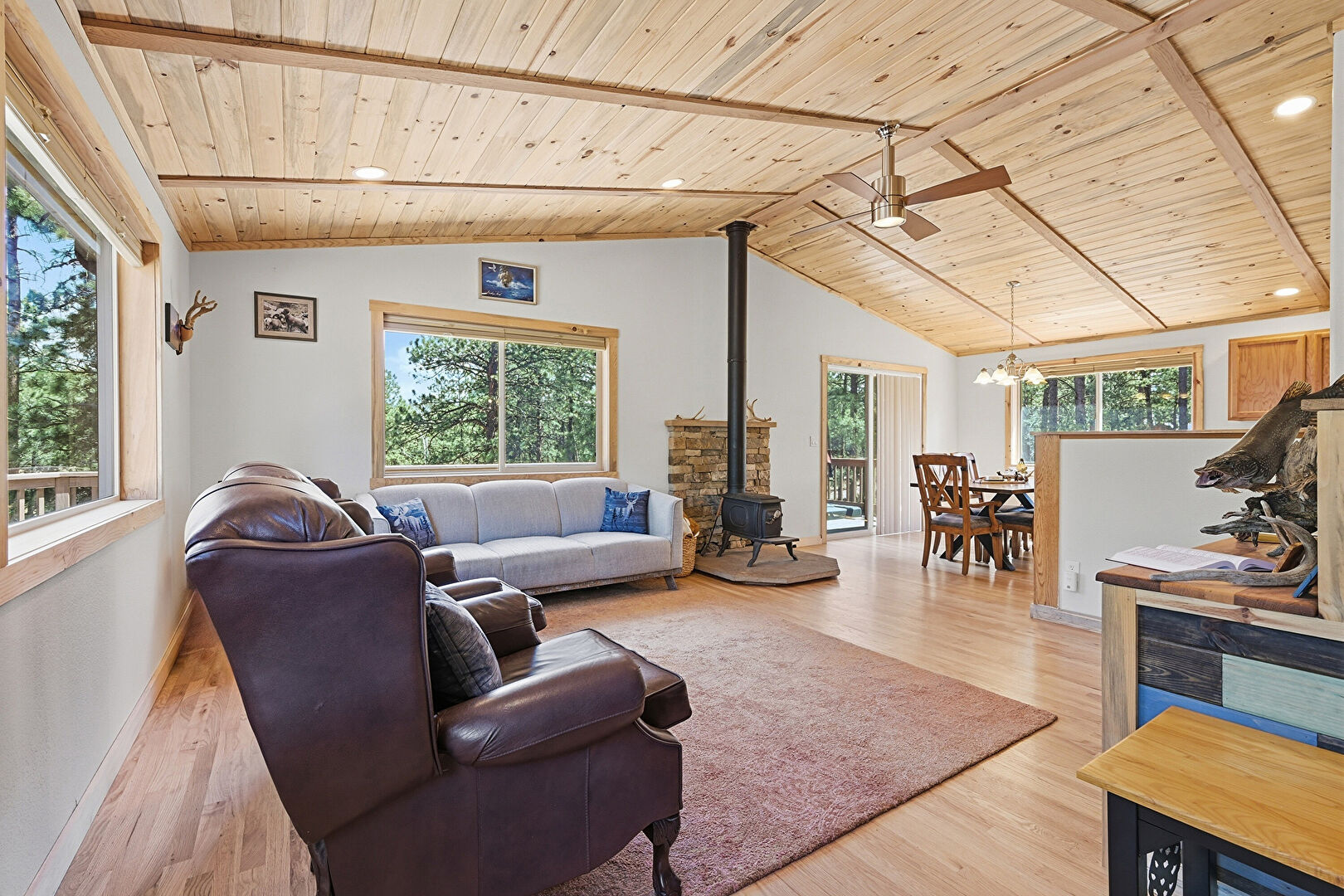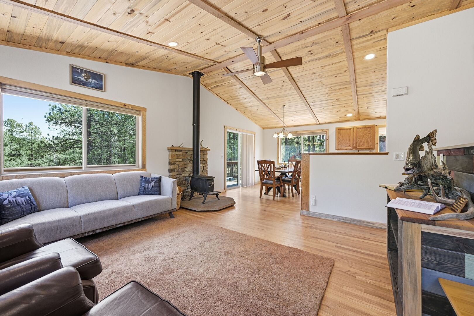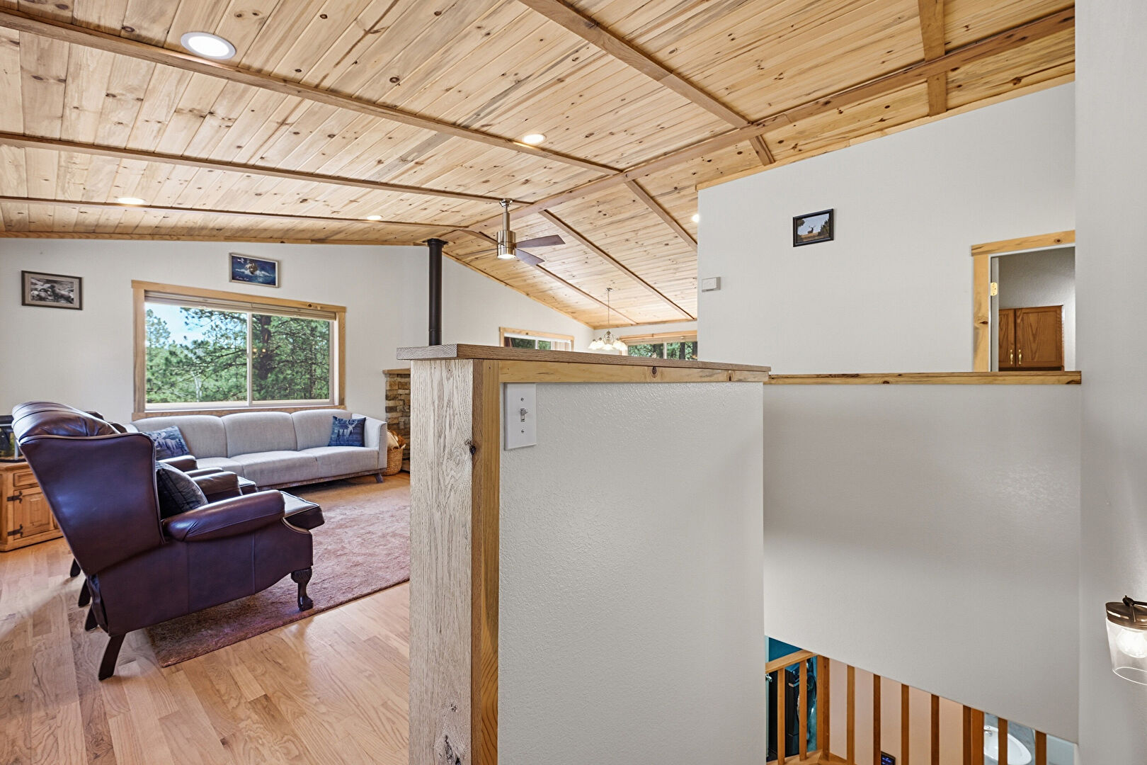 Baseboards Wall, Beamed Ceiling, Cathedral Ceiling, Ceiling Fan, Drywall, High Ceiling, Natural Light, Notable Chandelier, Recessed Lighting, Upstairs Landing, Vaulted Ceiling, Wood Ceiling, Wood Finish Floor, Wood Stove, Ceiling Fan, Drywall, Loft, Natural Light, Recessed Lighting, Vaulted Ceiling