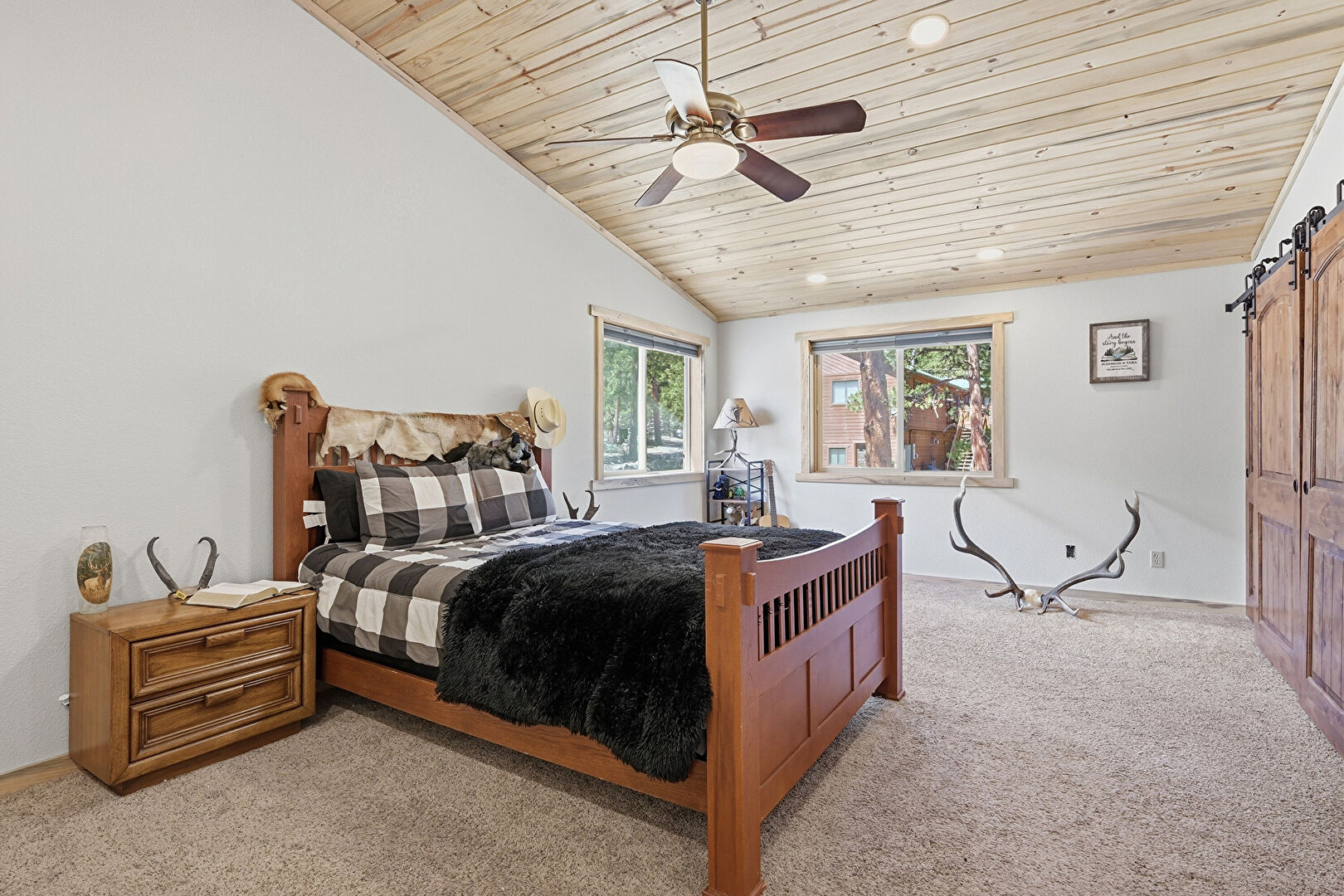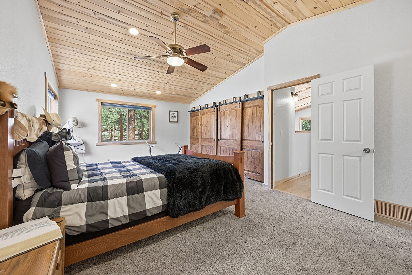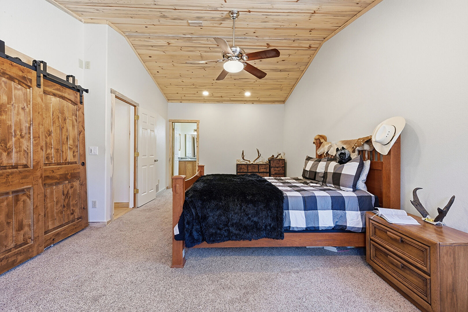 Barn Door, Baseboards Wall, Carpet, Ceiling Fan, Closet, Crown Molding, Drywall, Ensuite Bathroom, Natural Light, Recessed Lighting, Smoke Carbon Monoxide Detector, Vaulted Ceiling, Vent, Wood Ceiling, Wood Finish Floor, Carpet, Cathedral Ceiling, Ceiling Fan, Drywall, Wood Finish Floor