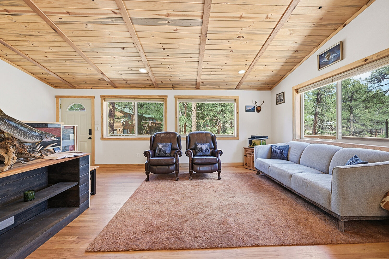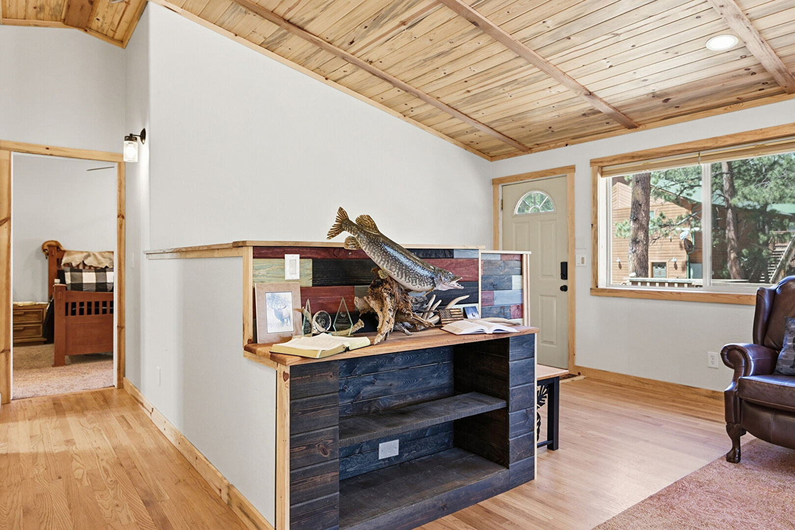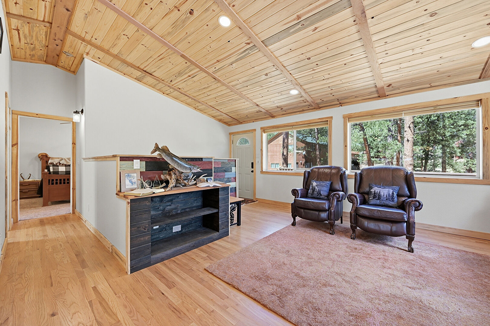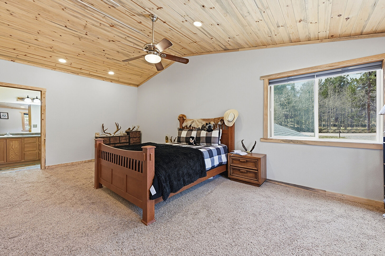 Barn Door, Baseboards Wall, Carpet, Ceiling Fan, Closet, Crown Molding, Drywall, Ensuite Bathroom, Natural Light, Recessed Lighting, Smoke Carbon Monoxide Detector, Vaulted Ceiling, Vent, Wood Ceiling, Wood Finish Floor, Carpet, Cathedral Ceiling, Ceiling Fan, Drywall, Wood Finish Floor