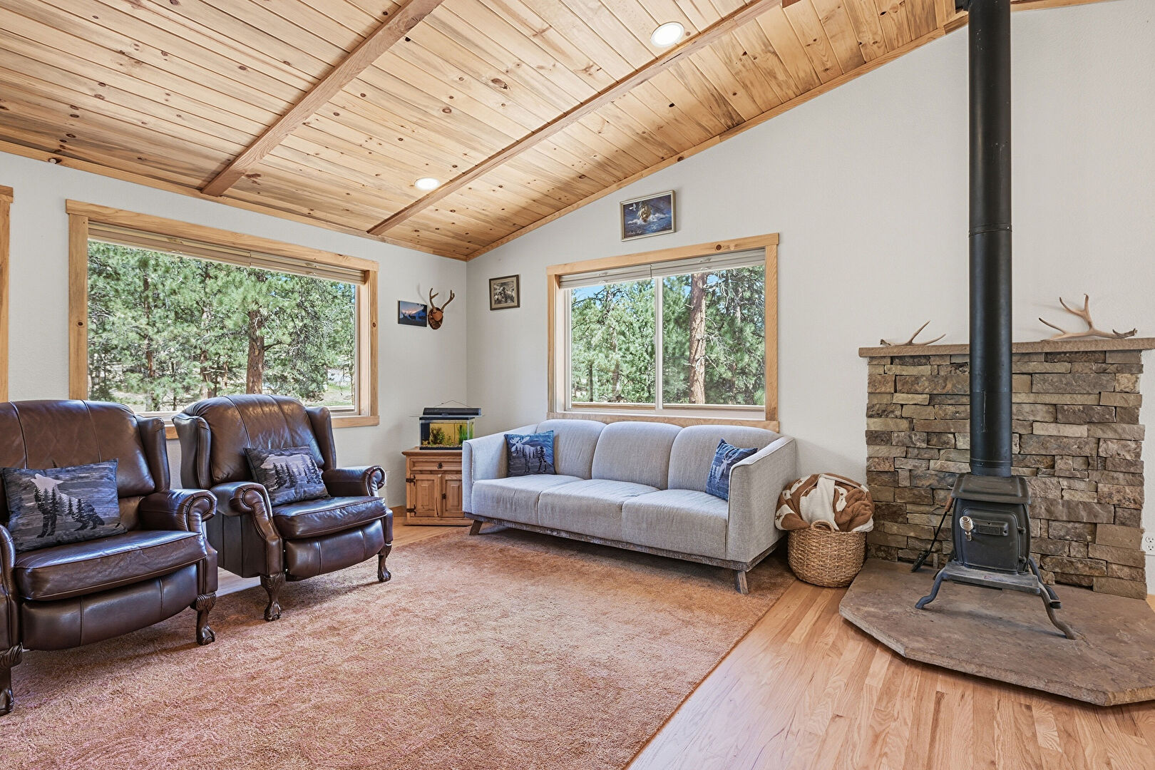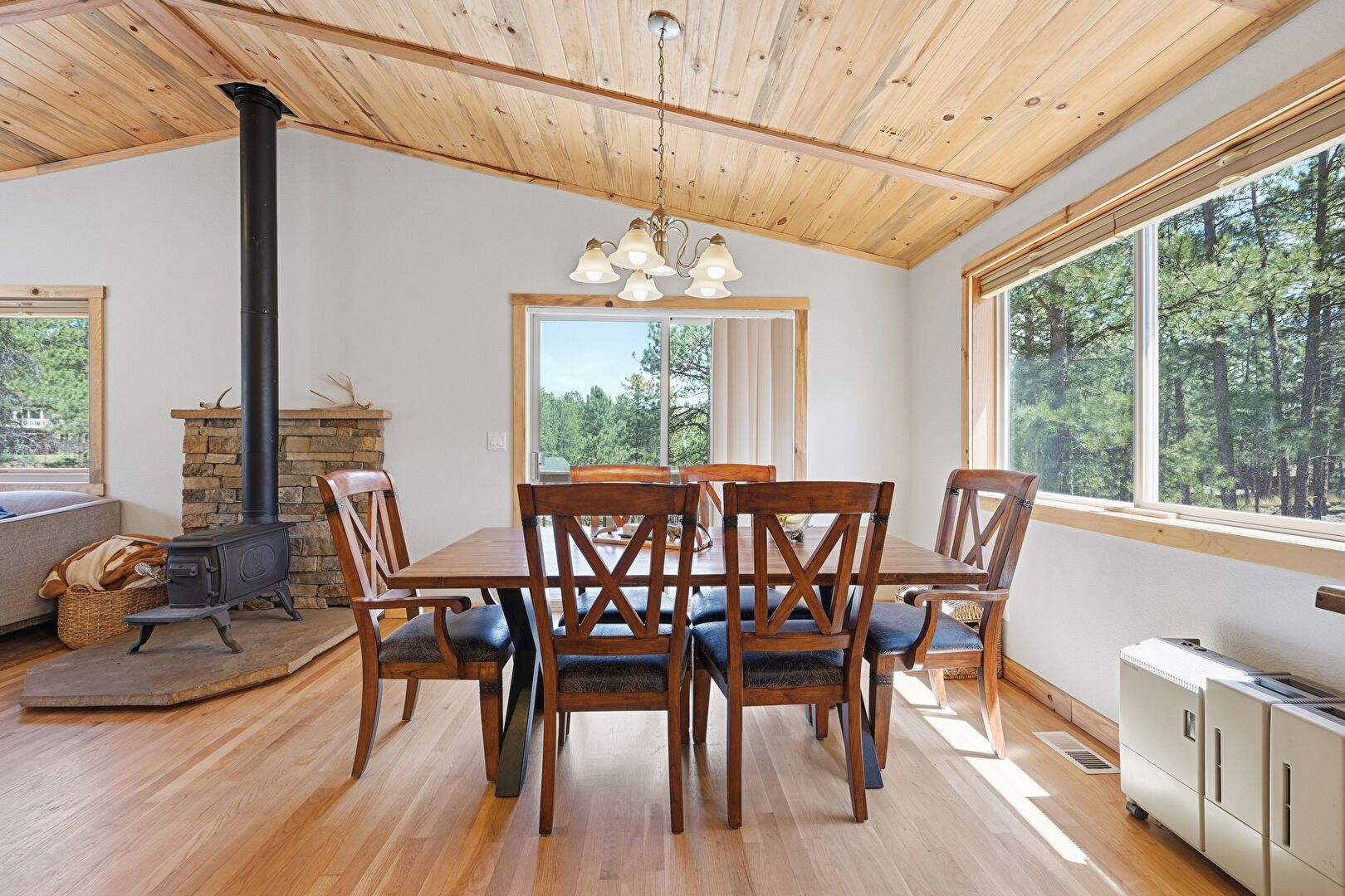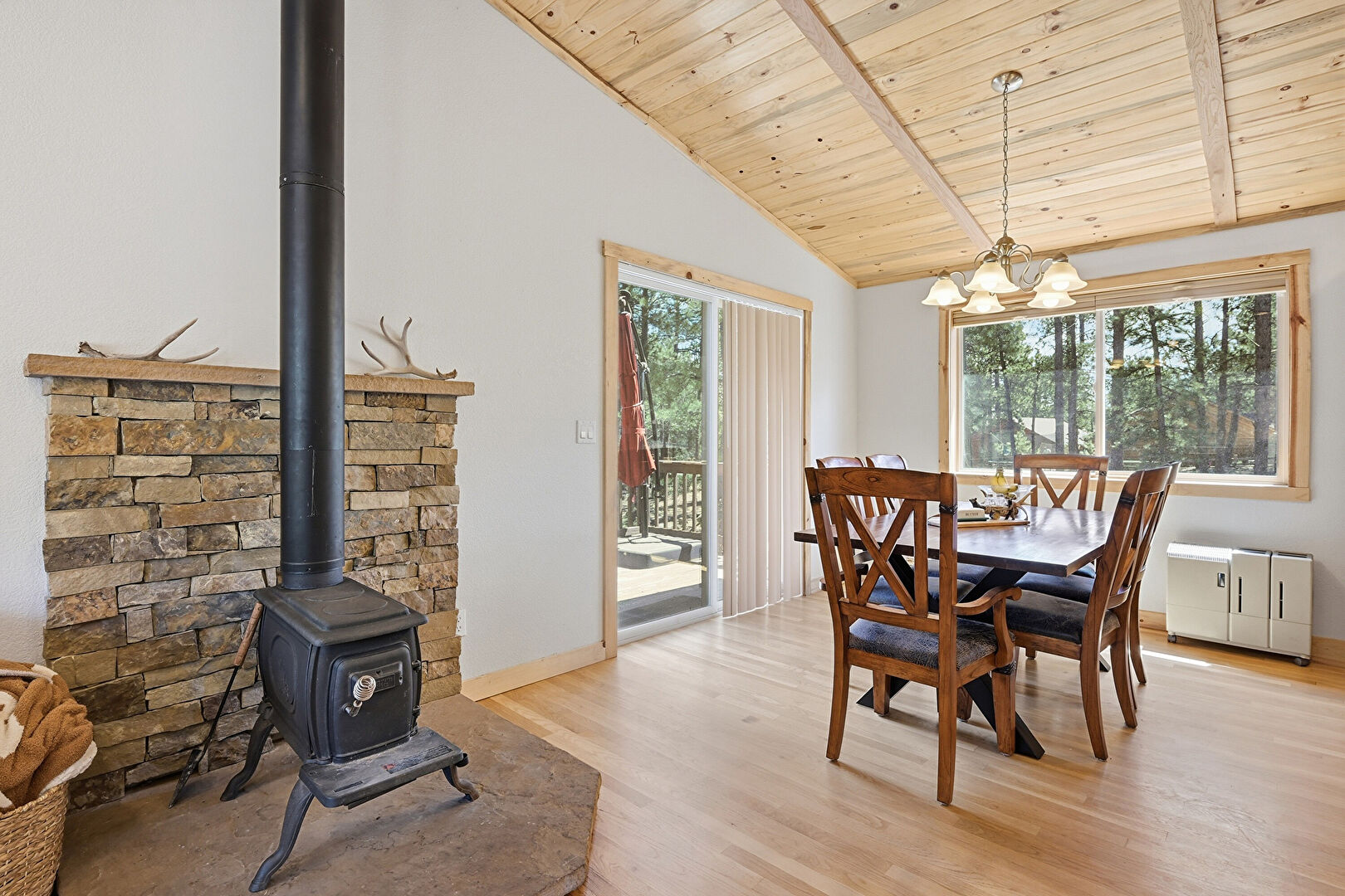 Baseboards Wall, Beamed Ceiling, Drywall, High Ceiling, Natural Light, Notable Chandelier, Recessed Lighting, U Shaped Kitchen, Vaulted Ceiling, Vent, Wood Ceiling, Wood Finish Floor, Wood Stove, Cathedral Ceiling, Drywall, Vaulted Ceiling, Wood Stove