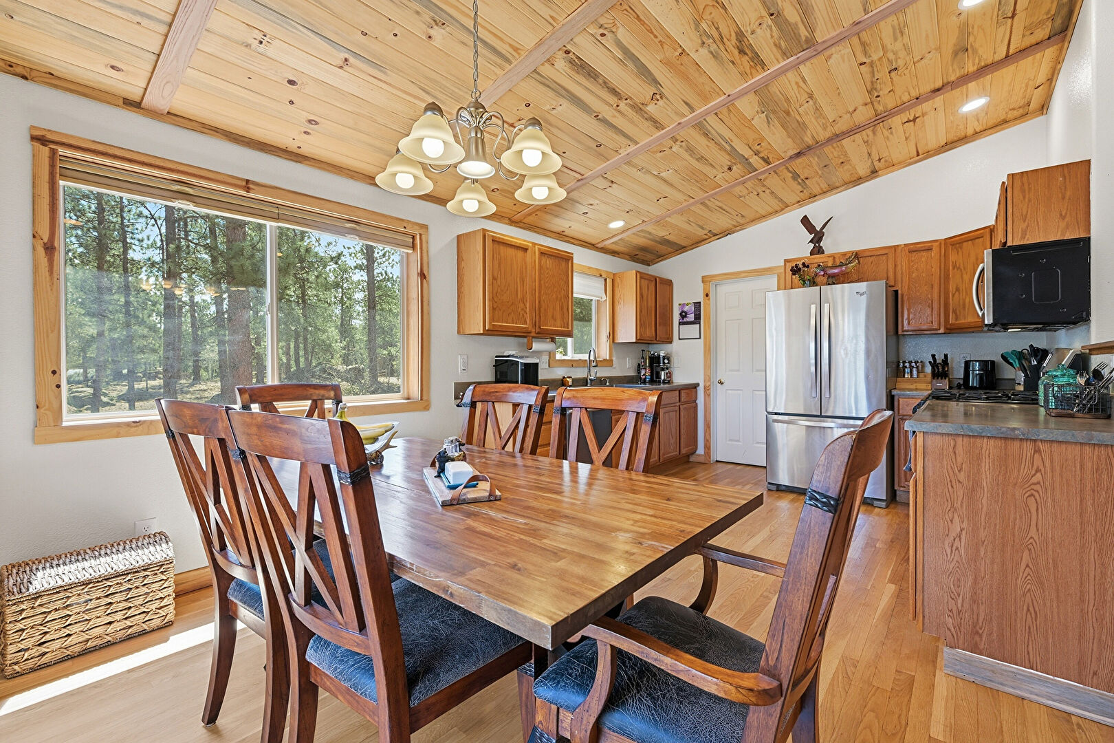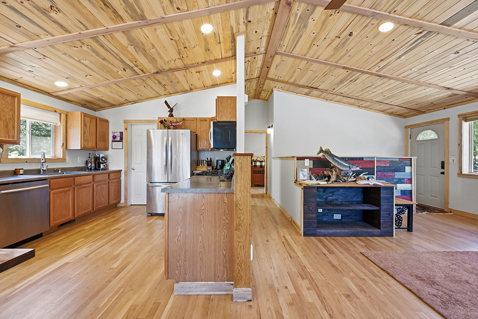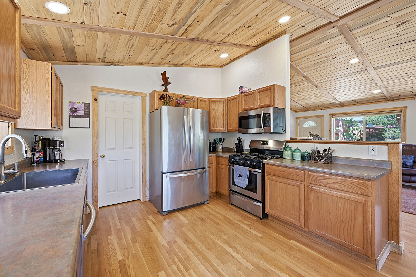 Beamed Ceiling, Cathedral Ceiling, Drywall, High Ceiling, Kitchen Peninsula, Medium Brown Cabinets, Natural Light, Recessed Lighting, Shaker Cabinets, Vaulted Ceiling, Wood Ceiling, Wood Finish Floor, Drywall, Medium Brown Cabinets, Vaulted Ceiling, Wood Ceiling