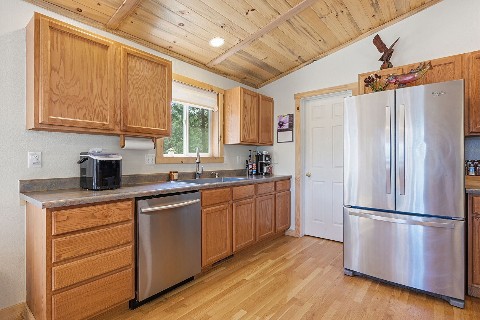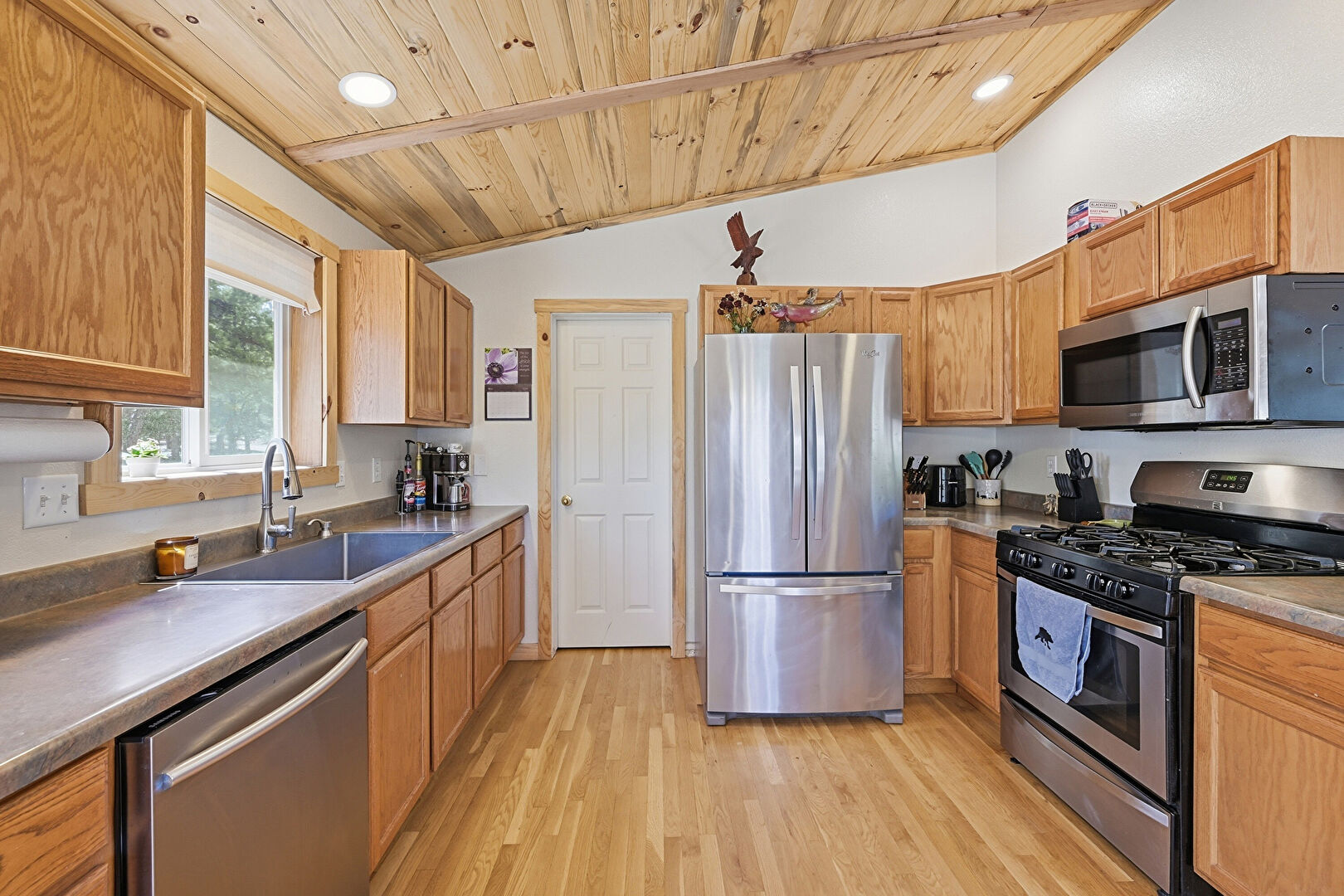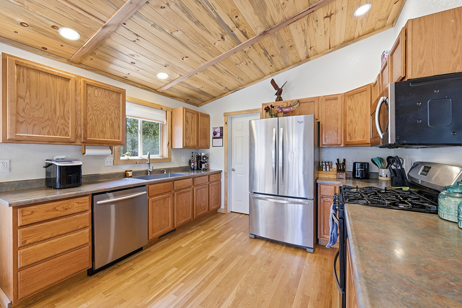 Beamed Ceiling, Cathedral Ceiling, Drywall, High Ceiling, Kitchen Peninsula, Medium Brown Cabinets, Natural Light, Recessed Lighting, Shaker Cabinets, Vaulted Ceiling, Wood Ceiling, Wood Finish Floor, Drywall, Medium Brown Cabinets, Vaulted Ceiling, Wood Ceiling