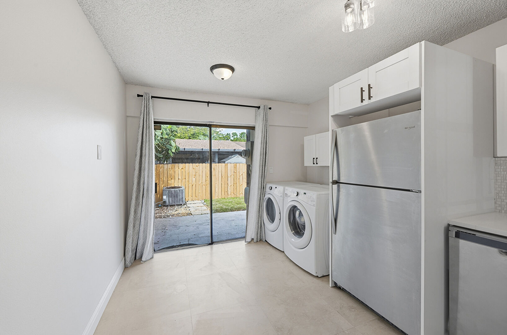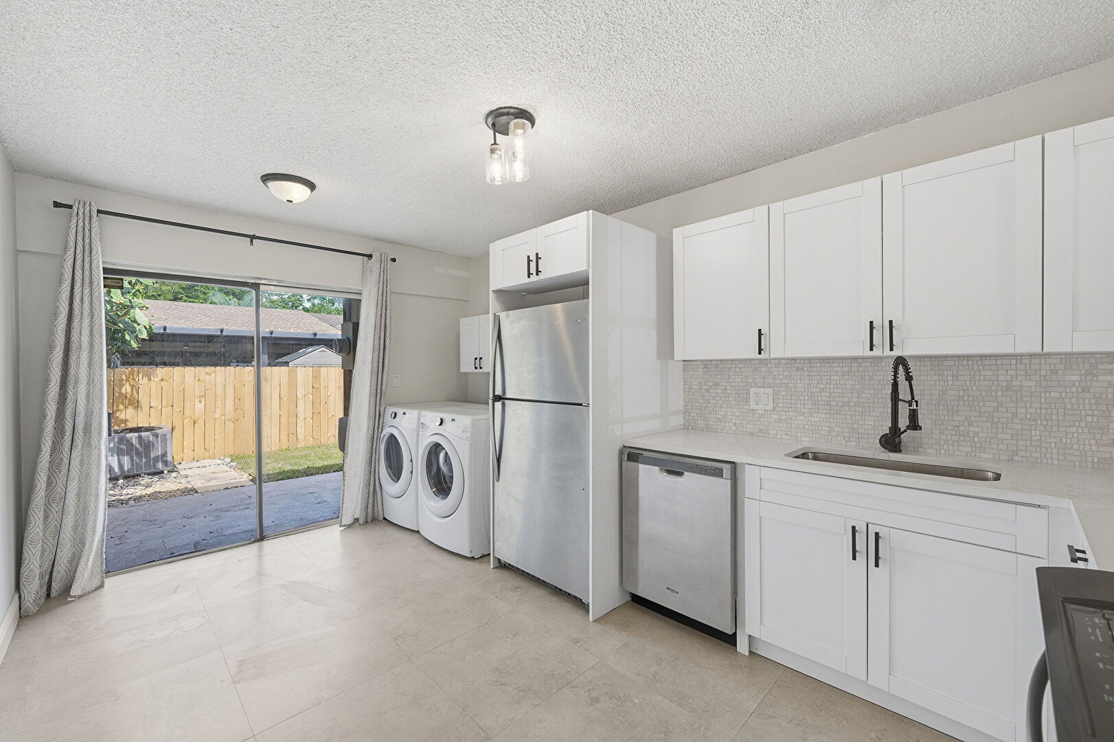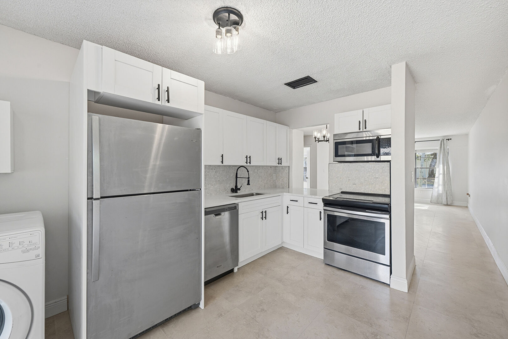 Baseboards Wall, Drywall, L Shaped Kitchen, Laundry, Natural Light, Notable Chandelier, Pass Through Window, Shaker Cabinets, Stone Countertops, Textured Ceiling, Vent, Washer Dryer, Shaker Cabinets, Textured Ceiling, Vinyl Floor