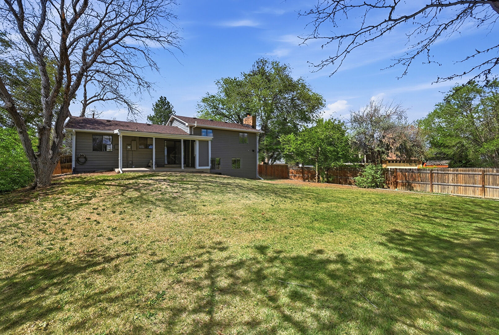 Chimney, Downspout, Fence, Gutters, Horizontal Siding, Sunroom, Lawn