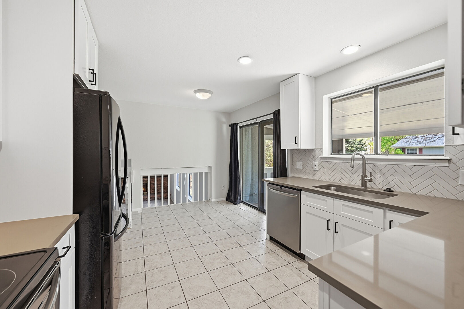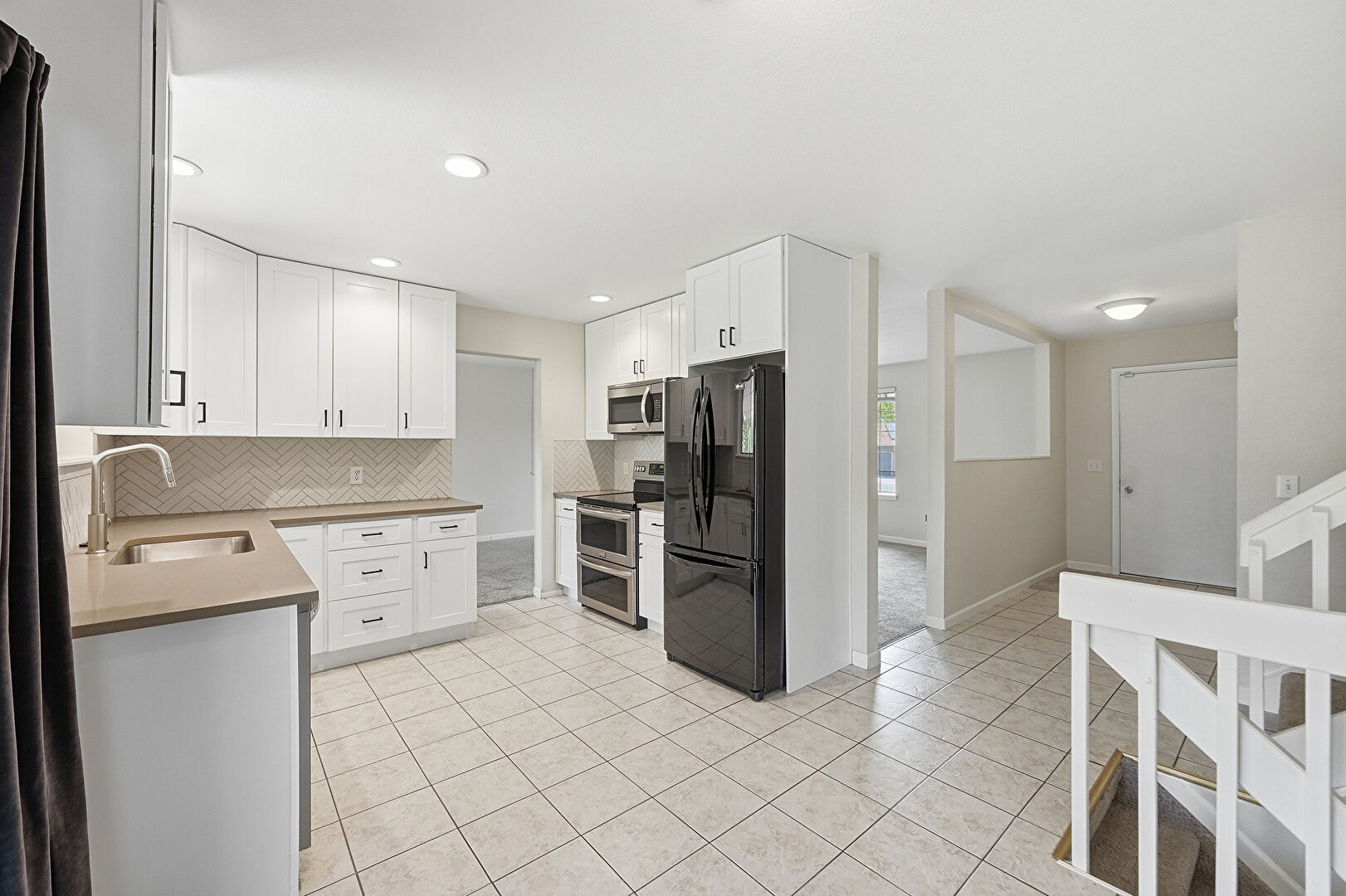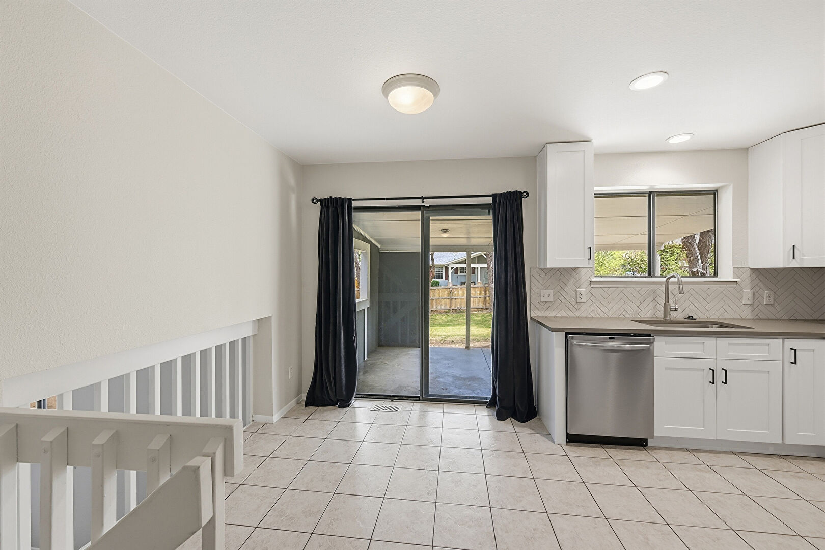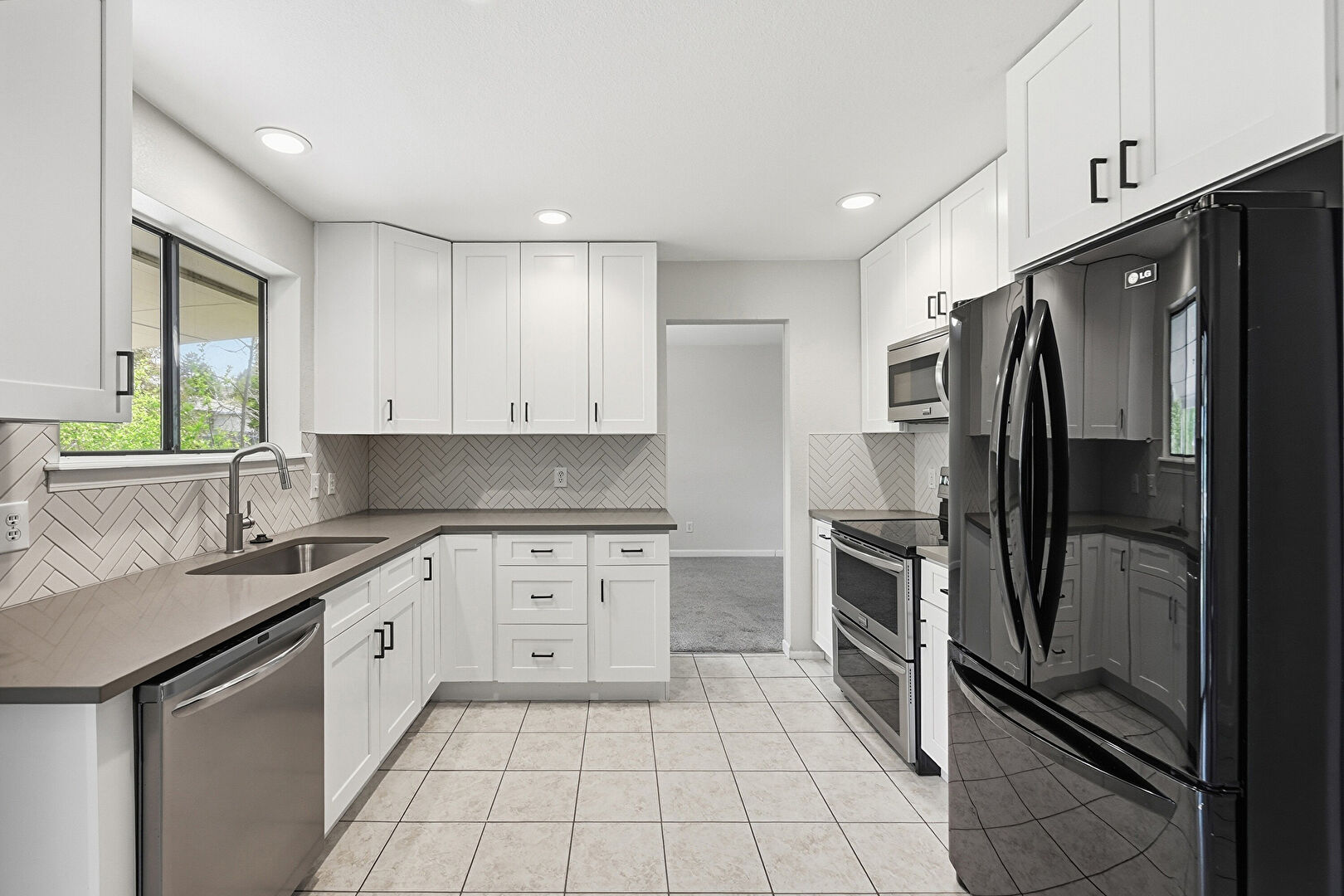 Baseboards Wall, Drywall, Natural Light, Recessed Lighting, Shaker Cabinets, Stone Countertops, Tile Floor, U Shaped Kitchen, Baseboards Wall, Tile Floor, U Shaped Kitchen