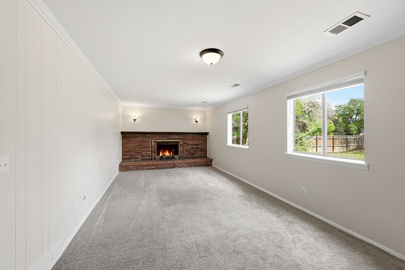 Baseboards Wall, Carpet, Crown Molding, Fireplace, Natural Light, Stairs, Vent, Wood Wall, Carpet, Crown Molding