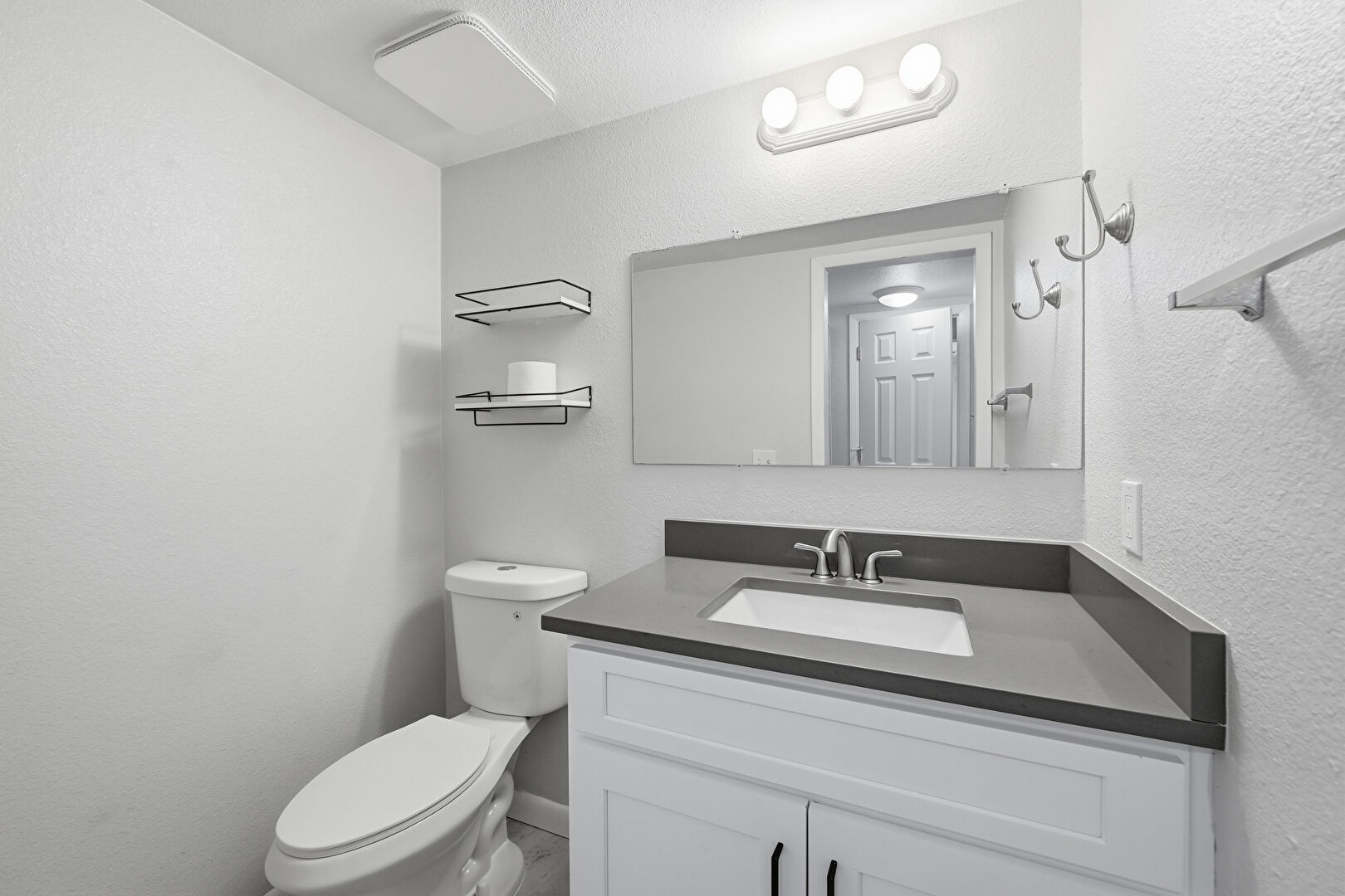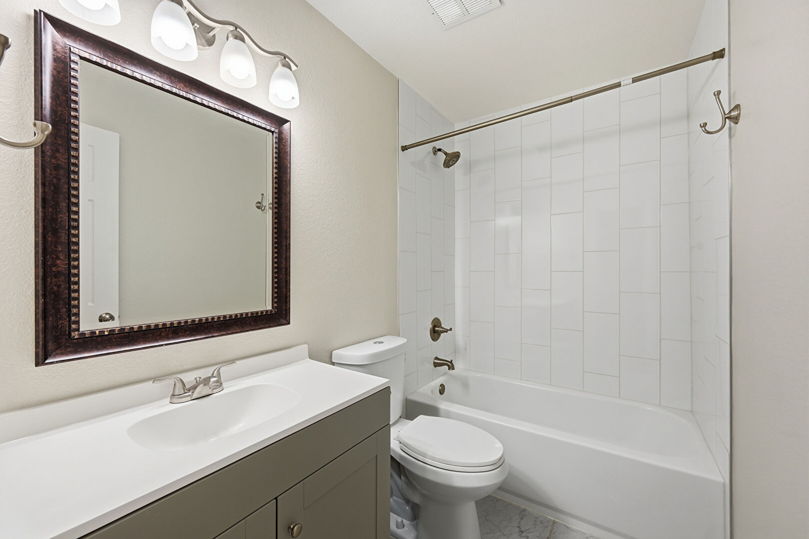 Combined Bath Shower, Drywall, Full Bathroom, Half Bathroom, Textured Wall, Vanity, Vent, Baseboards Wall, Full Bathroom, Vanity