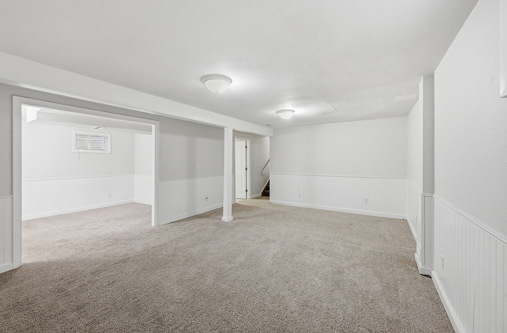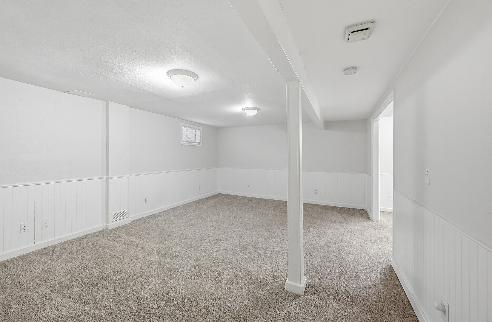 Baseboards Wall, Basement, Carpet, Drywall, Natural Light, Smoke Carbon Monoxide Detector, Stairs, Vent, Wainscot Wall, Carpet, Wainscot Wall