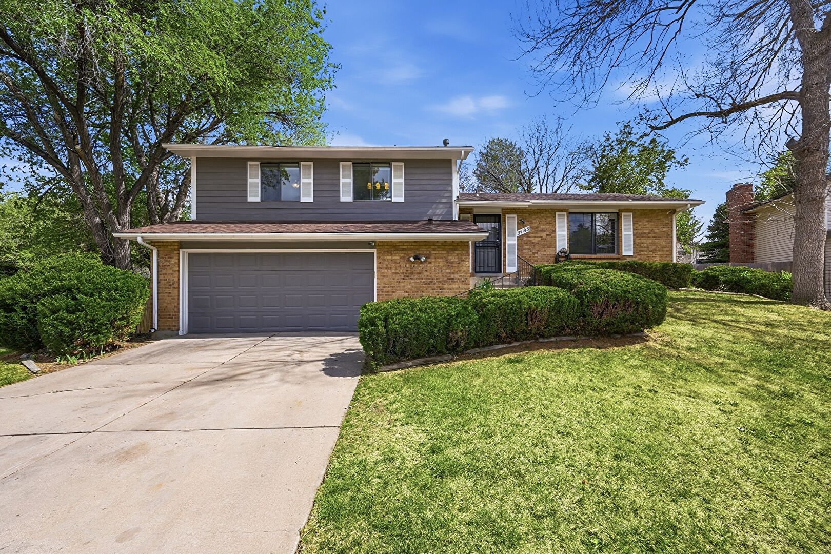Brick Siding, Built In Garage, Downspout, Driveway, Fence, Gutters, Horizontal Siding, Lawn, Driveway, Lawn
