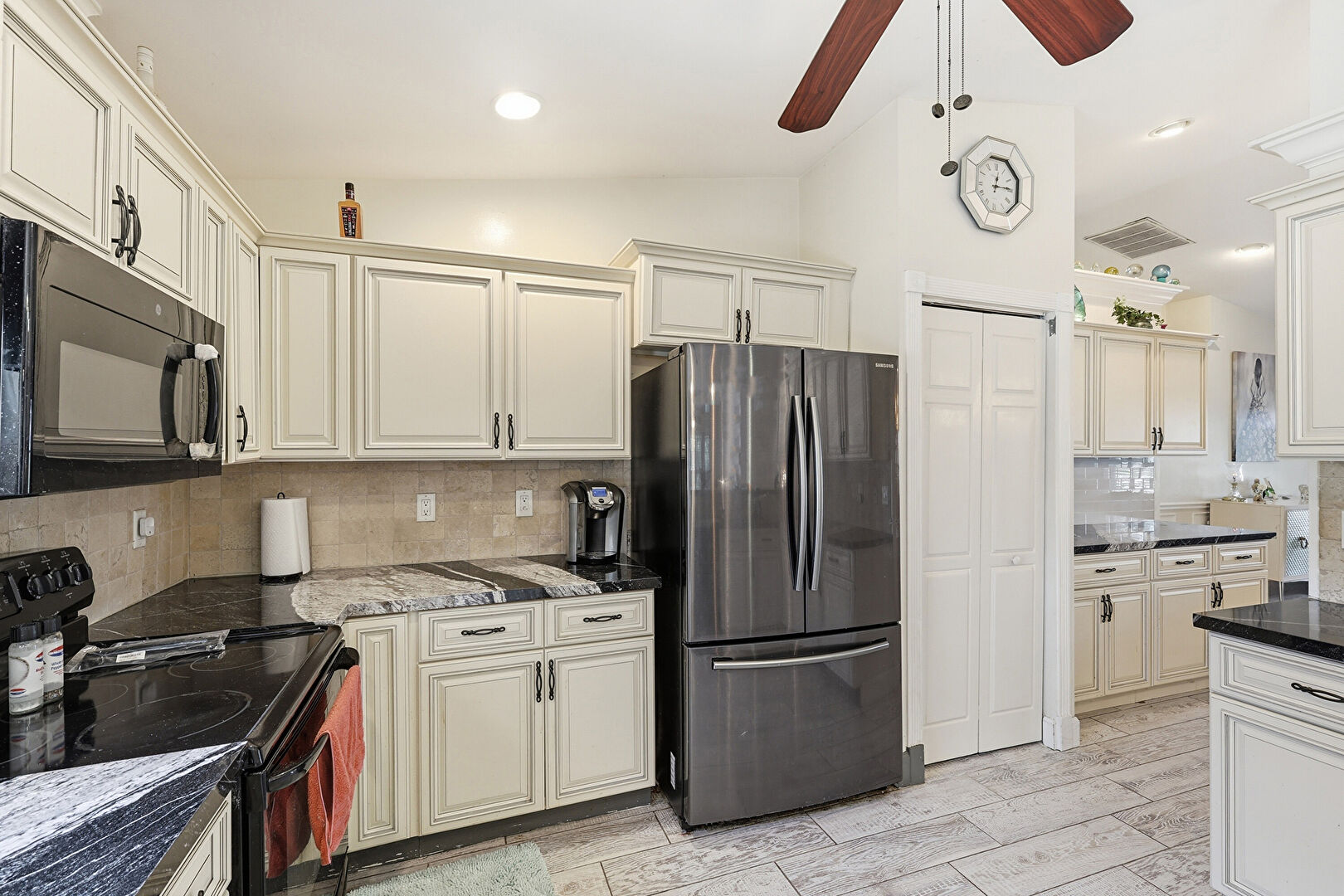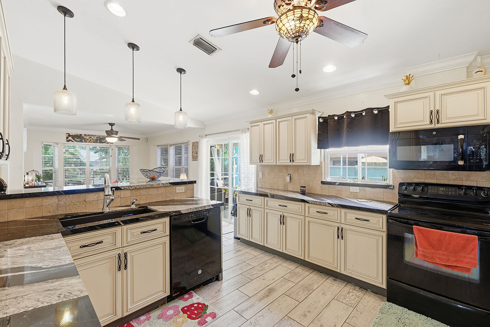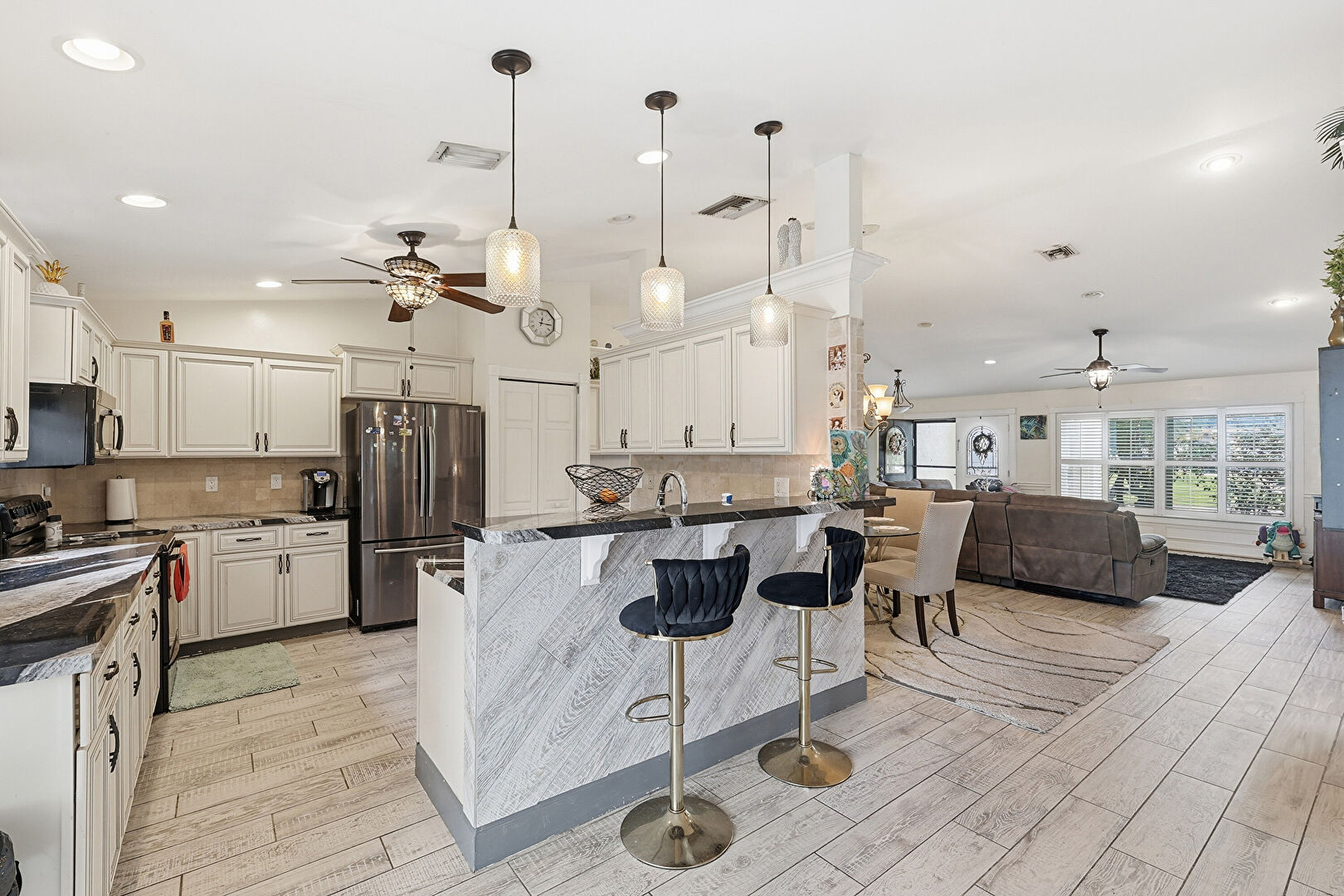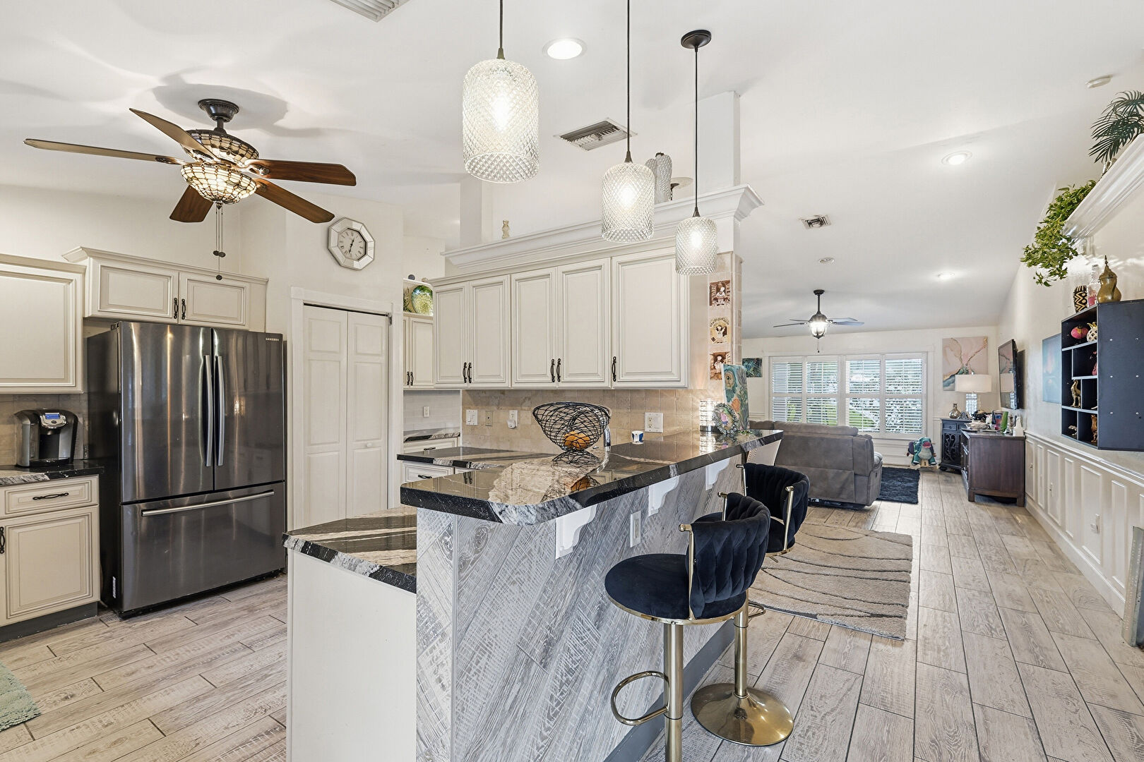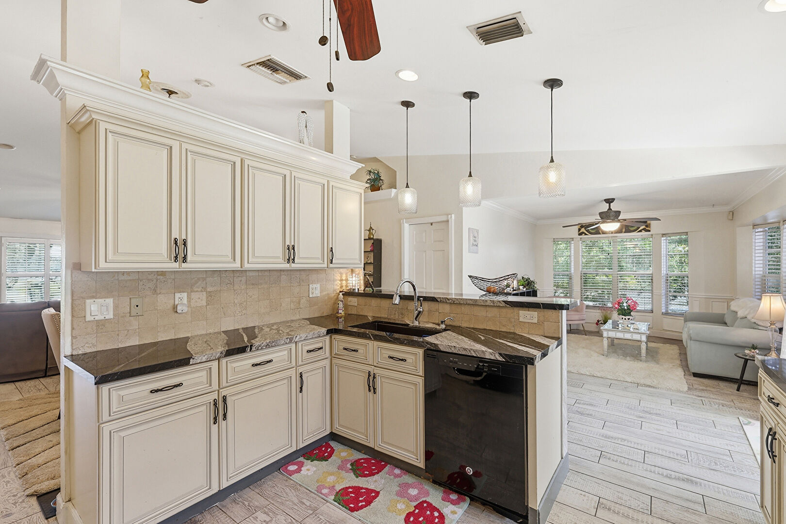 Ceiling Fan, Cream Cabinets, Crown Molding, Crown Molding Cabinets, Drywall, G Shaped Kitchen, Kitchen Bar, Kitchen Peninsula, Natural Light, Opens To Living Area, Pendant Lighting, Raised Cabinets, Recessed Lighting, Stone Countertops, Vaulted Ceiling, Vent, Wood Finish Floor, Ceiling Fan, Opens To Living Area, Pendant Lighting, Raised Cabinets, Wood Finish Floor