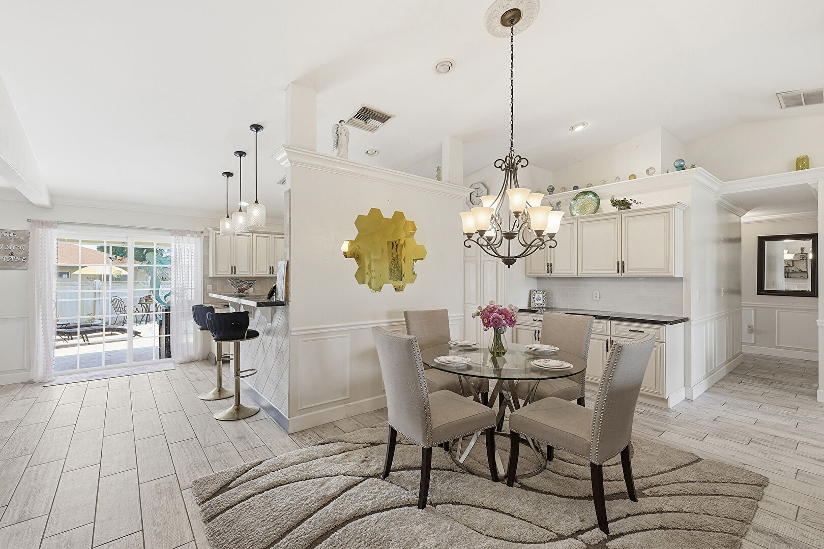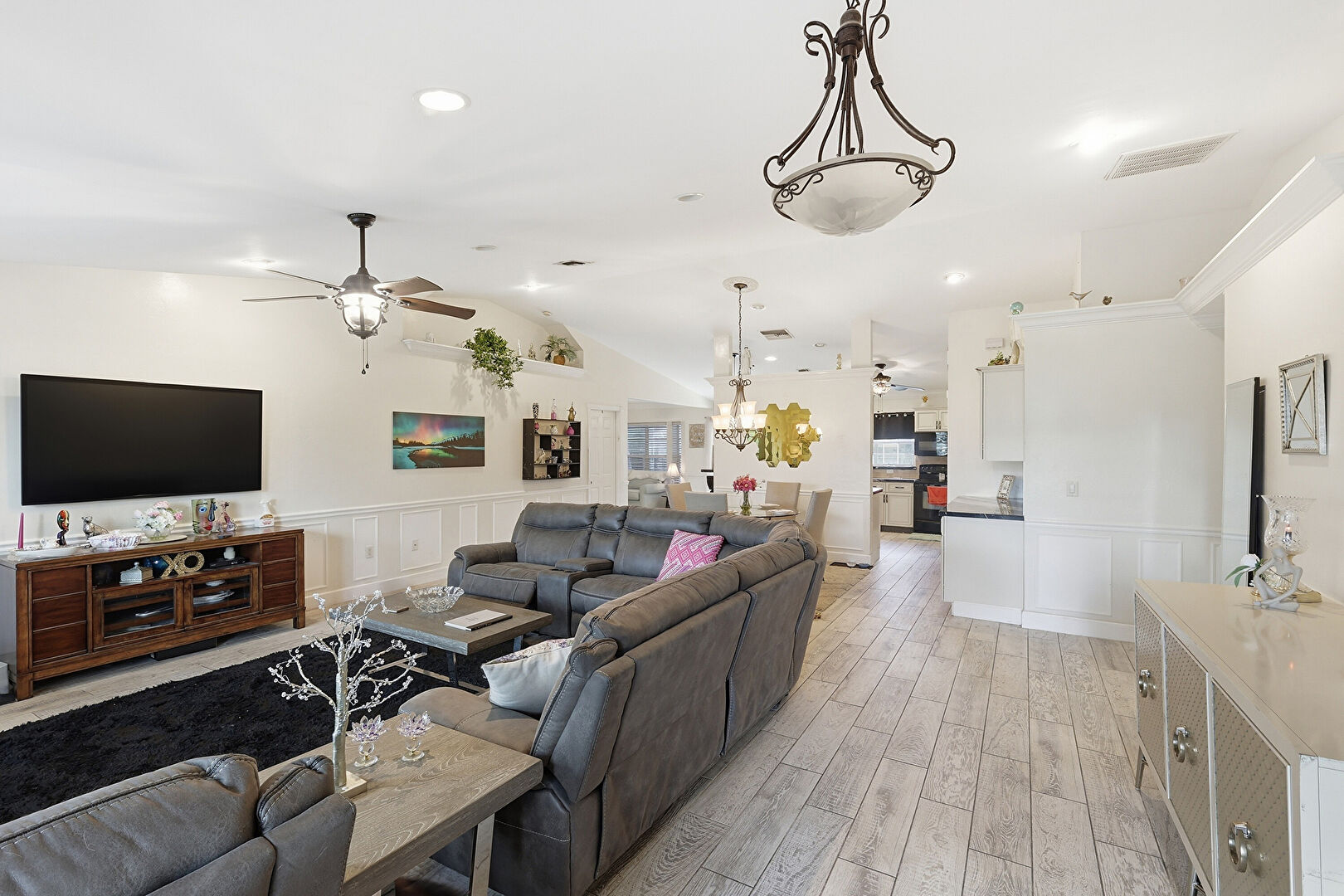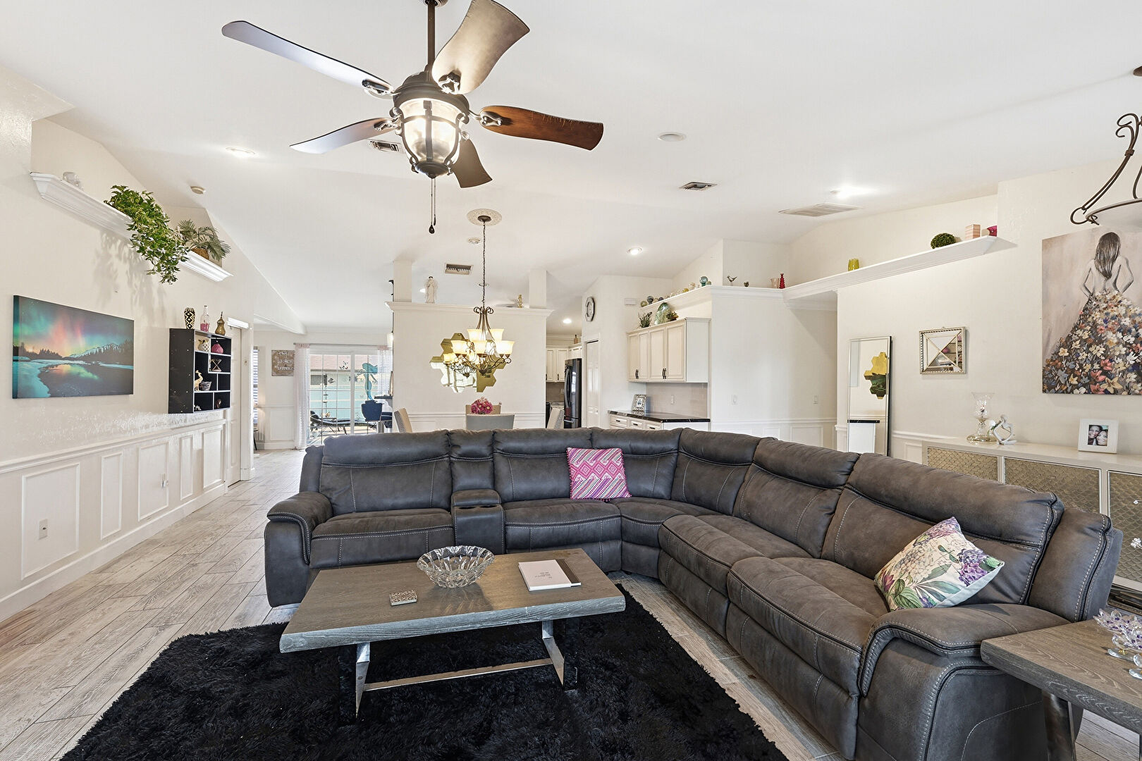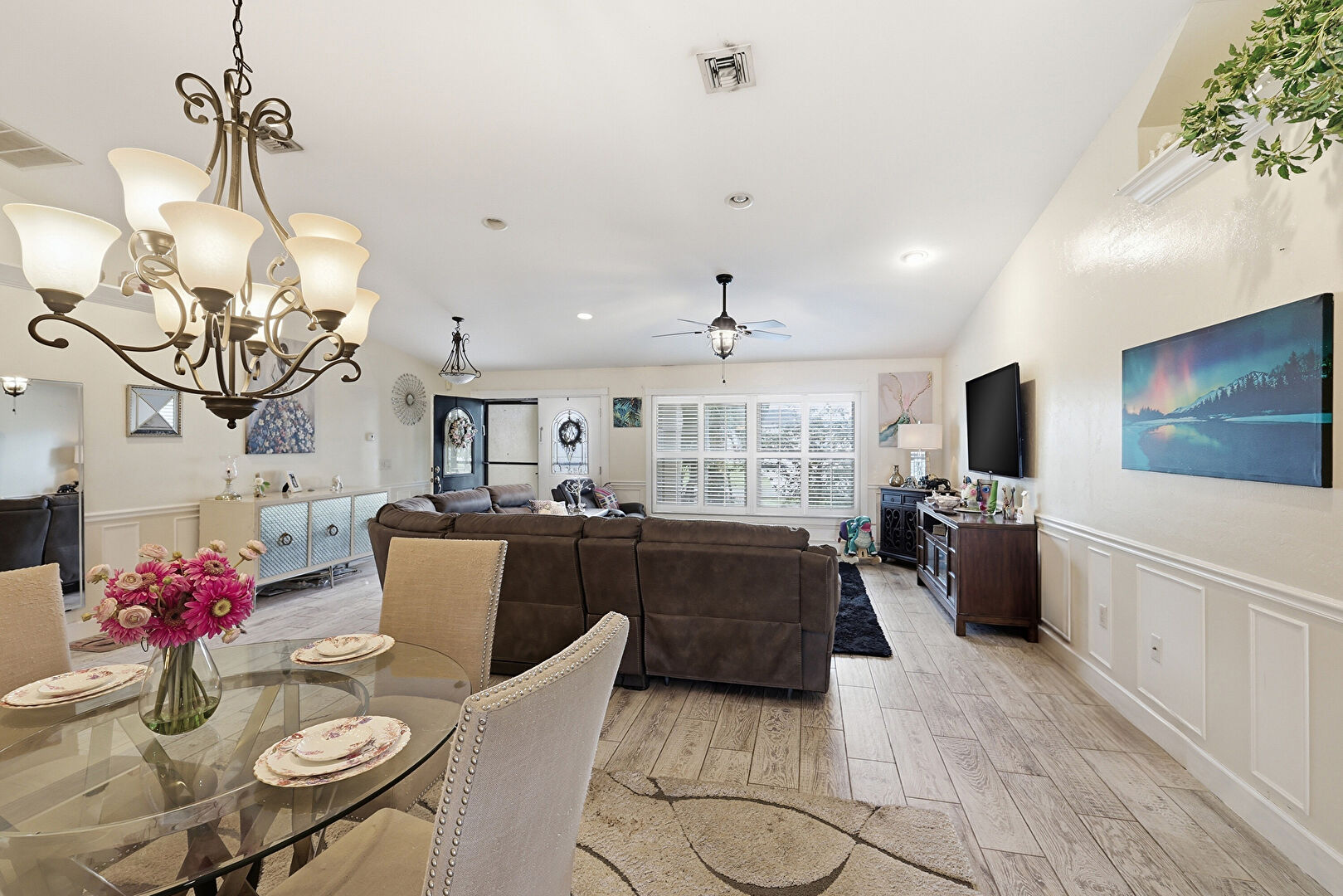 Ceiling Fan, Crown Molding, Drywall, High Ceiling, Natural Light, Notable Chandelier, Paneling Wall, Recessed Lighting, Vaulted Ceiling, Vent, Wainscot Wall, Wood Finish Floor, Ceiling Fan, Natural Light, Wainscot Wall, Wood Finish Floor