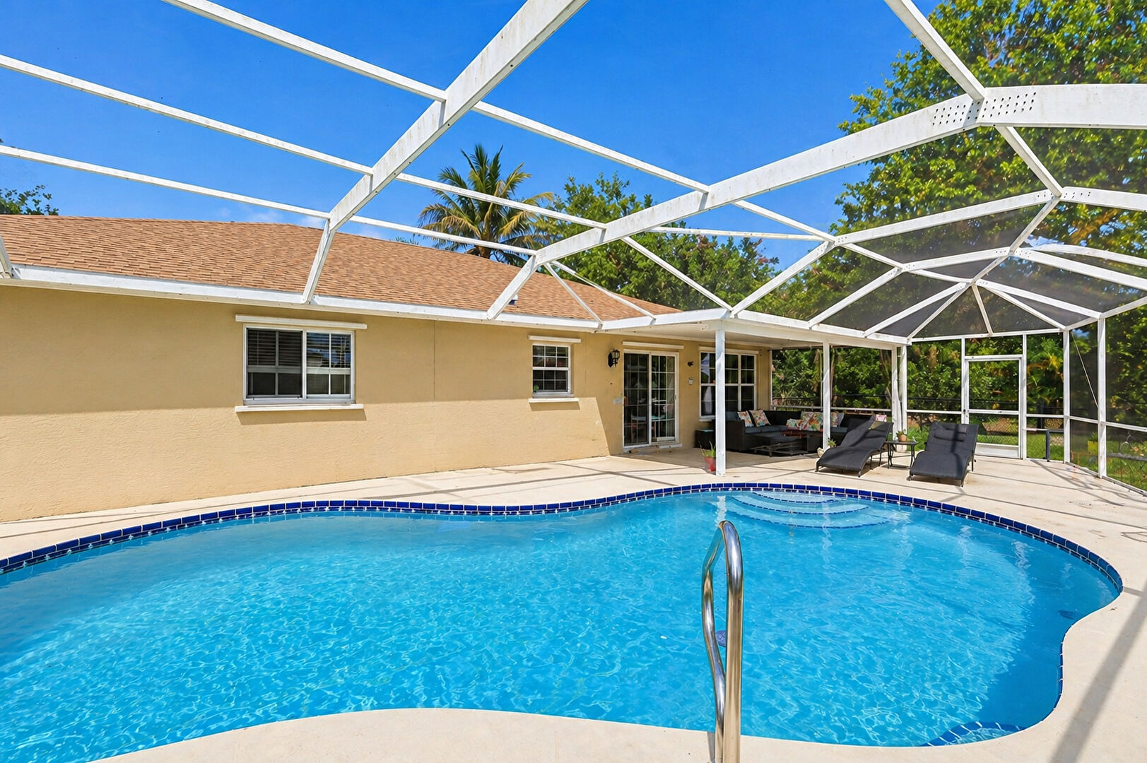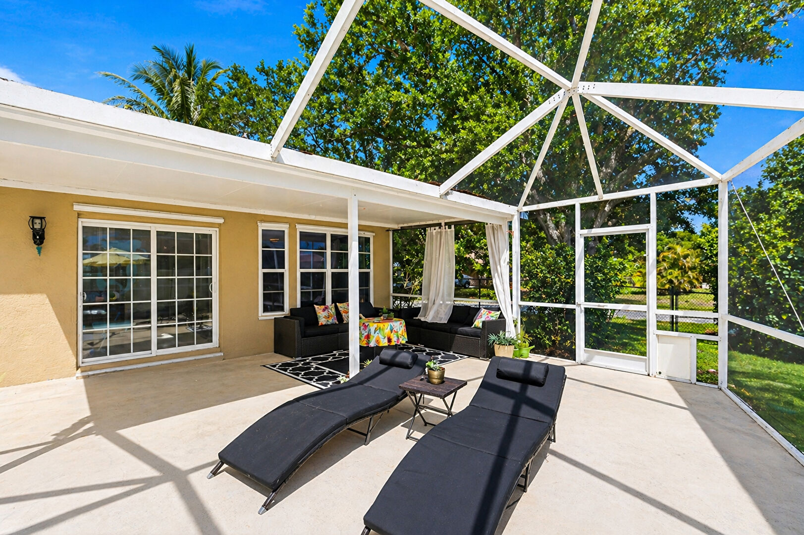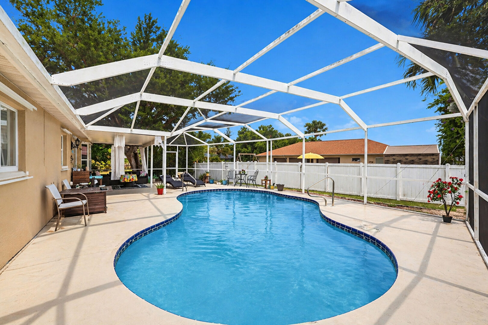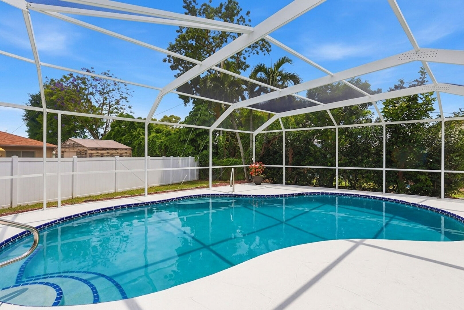 Fence, Handrail, Lanai, Patio, Pool, Sunroom, Lanai, Outdoor Dining Area, Outdoor Living Space, Patio, Sunroom