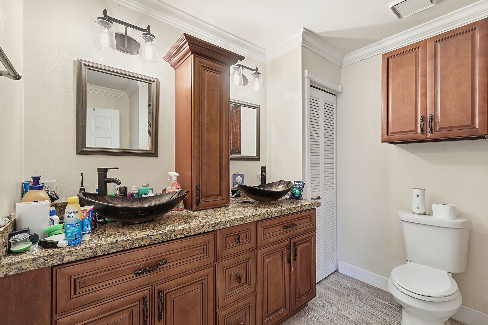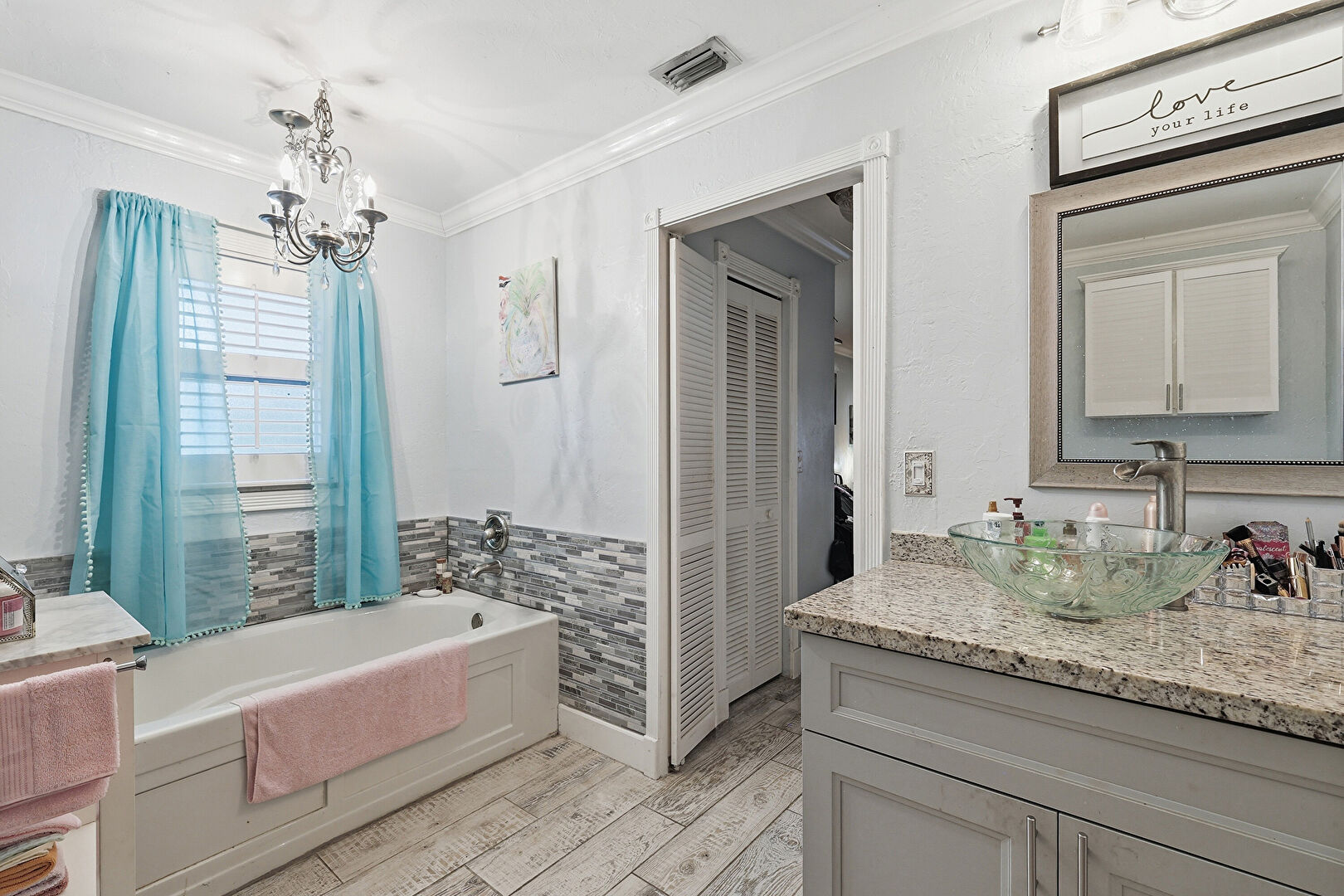 Baseboards Wall, Closet, Crown Molding, Double Vanity, Drywall, Full Bathroom, Natural Light, Notable Chandelier, Tile Wall, Vanity, Vent, Wainscot Wall, Wood Finish Floor, Full Bathroom, Notable Chandelier, Wood Finish Floor