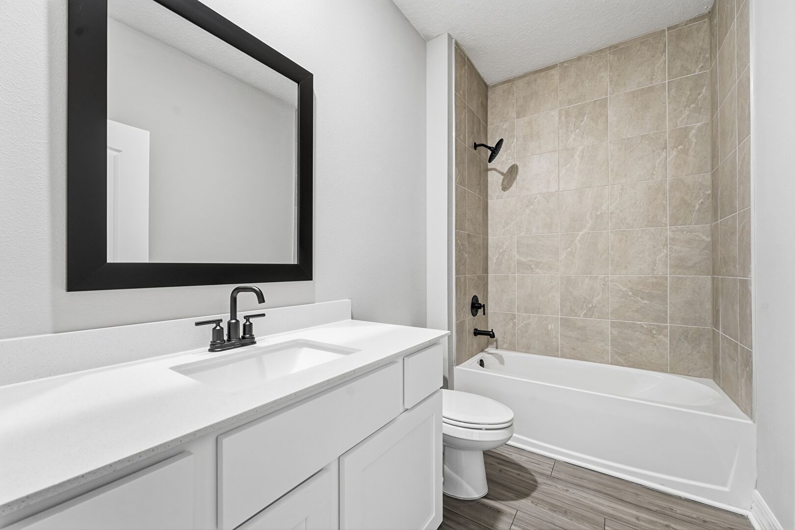 Combined Bath Shower, Drywall, Full Bathroom, Textured Ceiling, Wood Finish Floor, Vanity