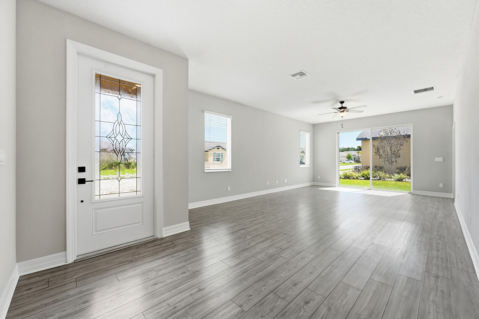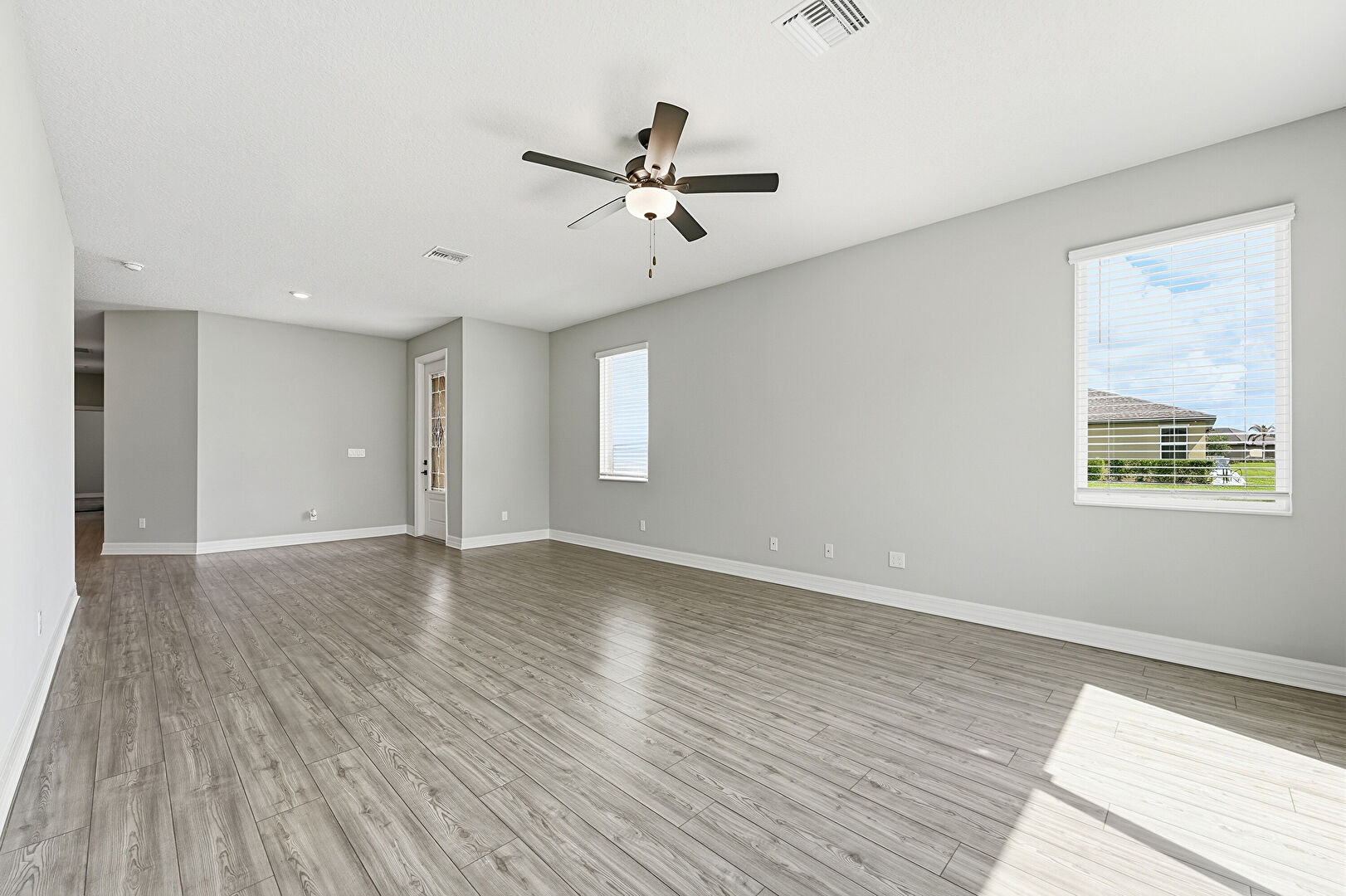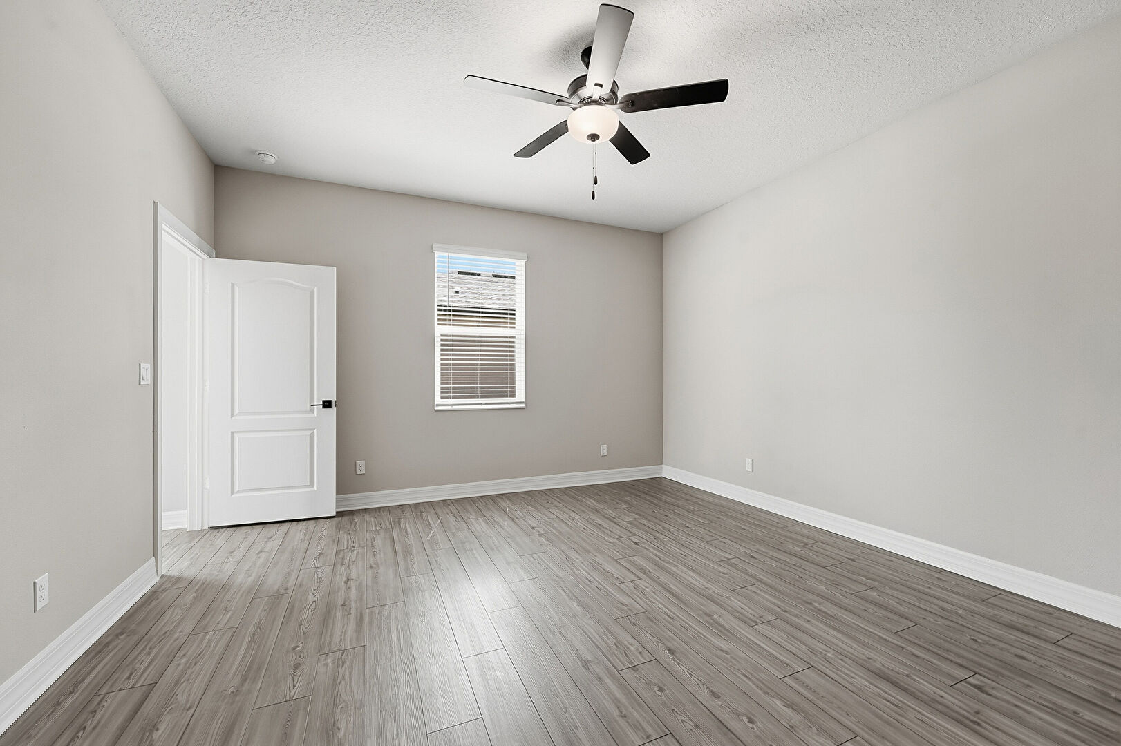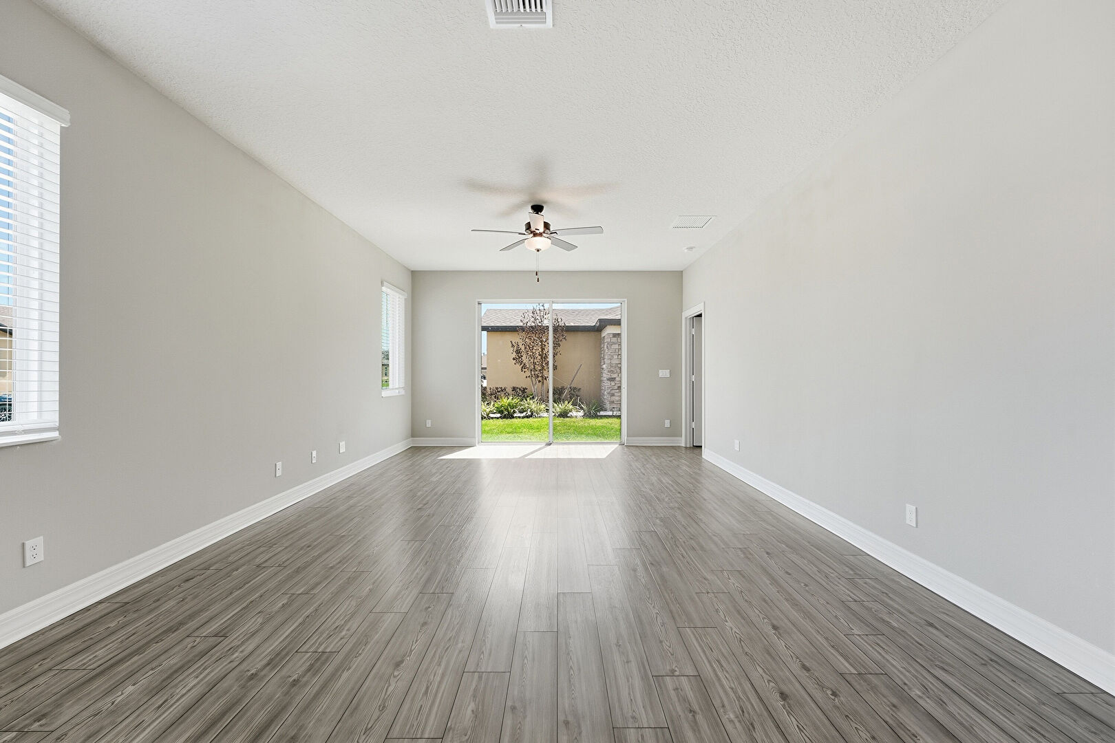 Baseboards Wall, Ceiling Fan, Drywall, Natural Light, Textured Ceiling, Vent, Wood Finish Floor, Drywall, Vent, Wood Finish Floor