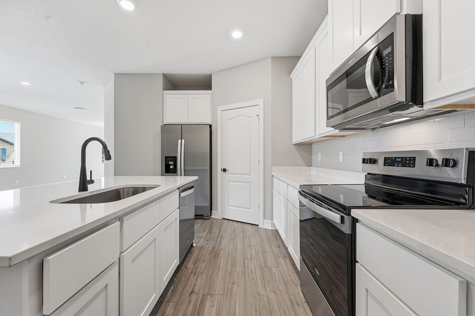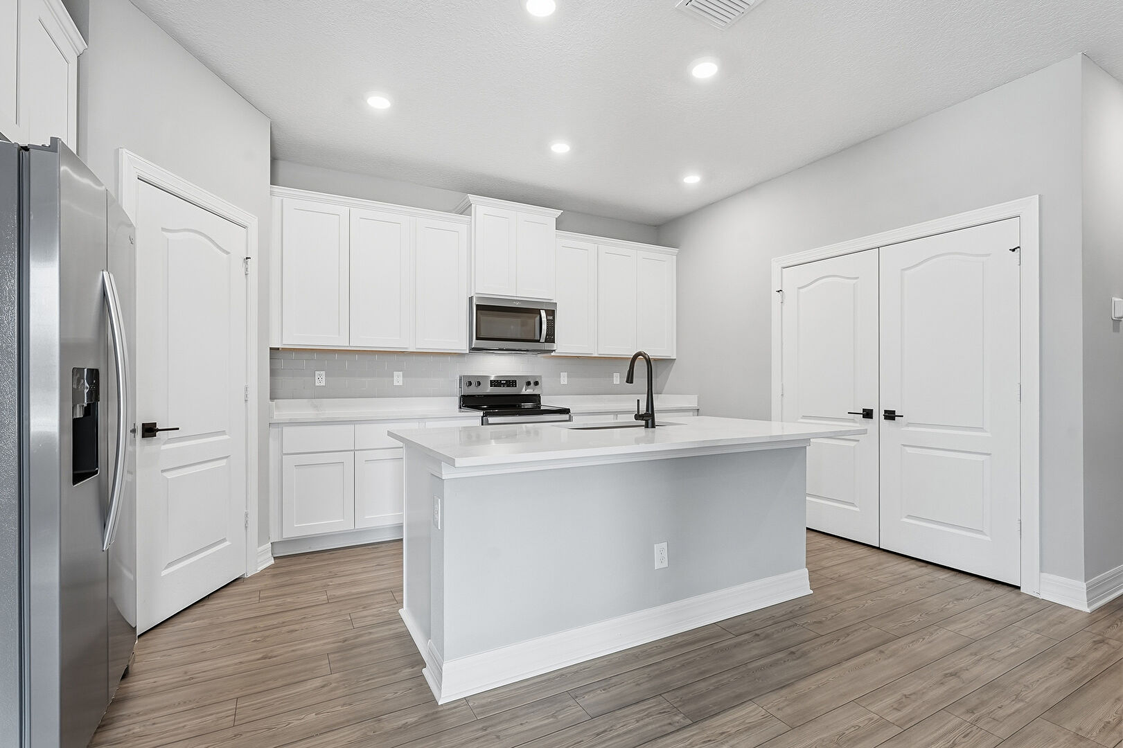 Baseboards Wall, Crown Molding Cabinets, Drywall, Kitchen Island, L Shaped Kitchen, Natural Light, Recessed Lighting, Shaker Cabinets, Stone Countertops, Vent, Wood Finish Floor, Kitchen Island, Wood Finish Floor