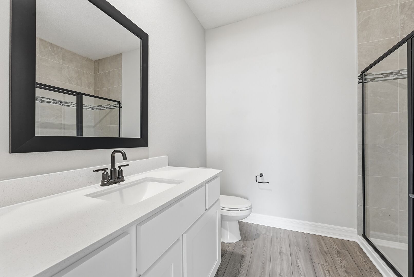 Baseboards Wall, Full Bathroom, Vanity, Wood Finish Floor, Drywall