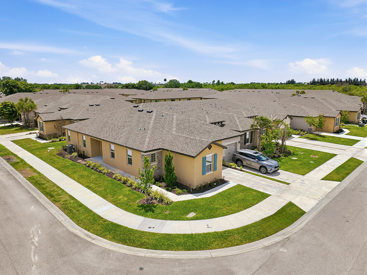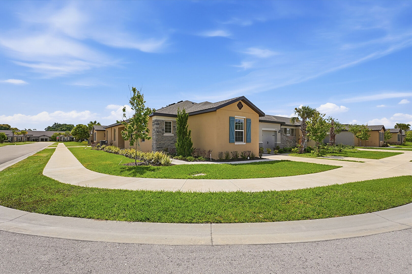 Driveway, Lawn, Residential View, Stone Siding, Stucco Siding, Shingle Roof, Stucco Siding