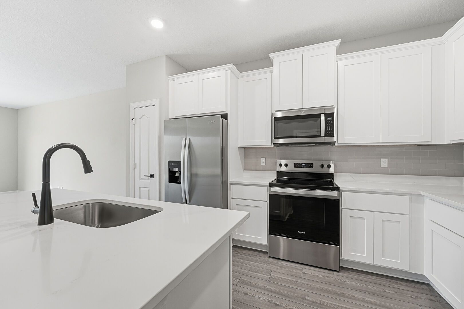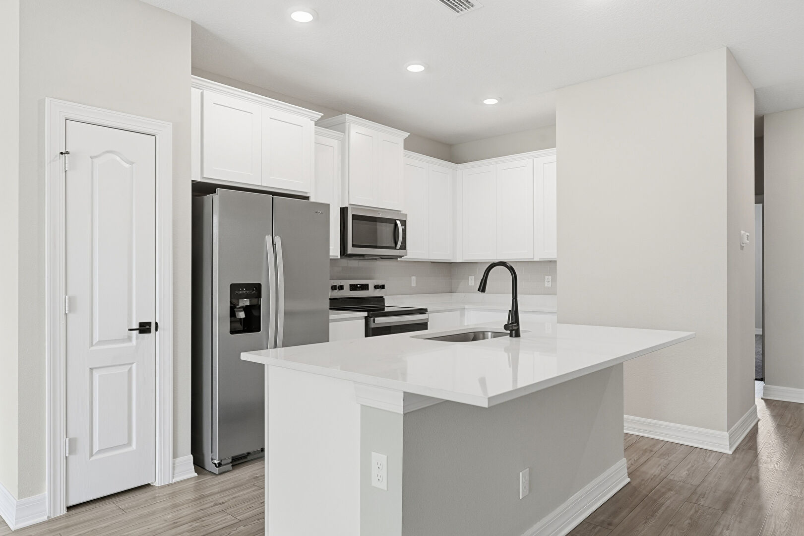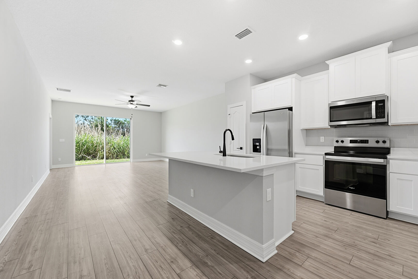 Baseboards Wall, Ceiling Fan, Crown Molding Cabinets, Drywall, Kitchen Bar, Kitchen Island, L Shaped Kitchen, Opens To Living Area, Recessed Lighting, Shaker Cabinets, Stone Countertops, Vent, Wood Finish Floor, Natural Light, Stone Countertops, Wood Finish Floor