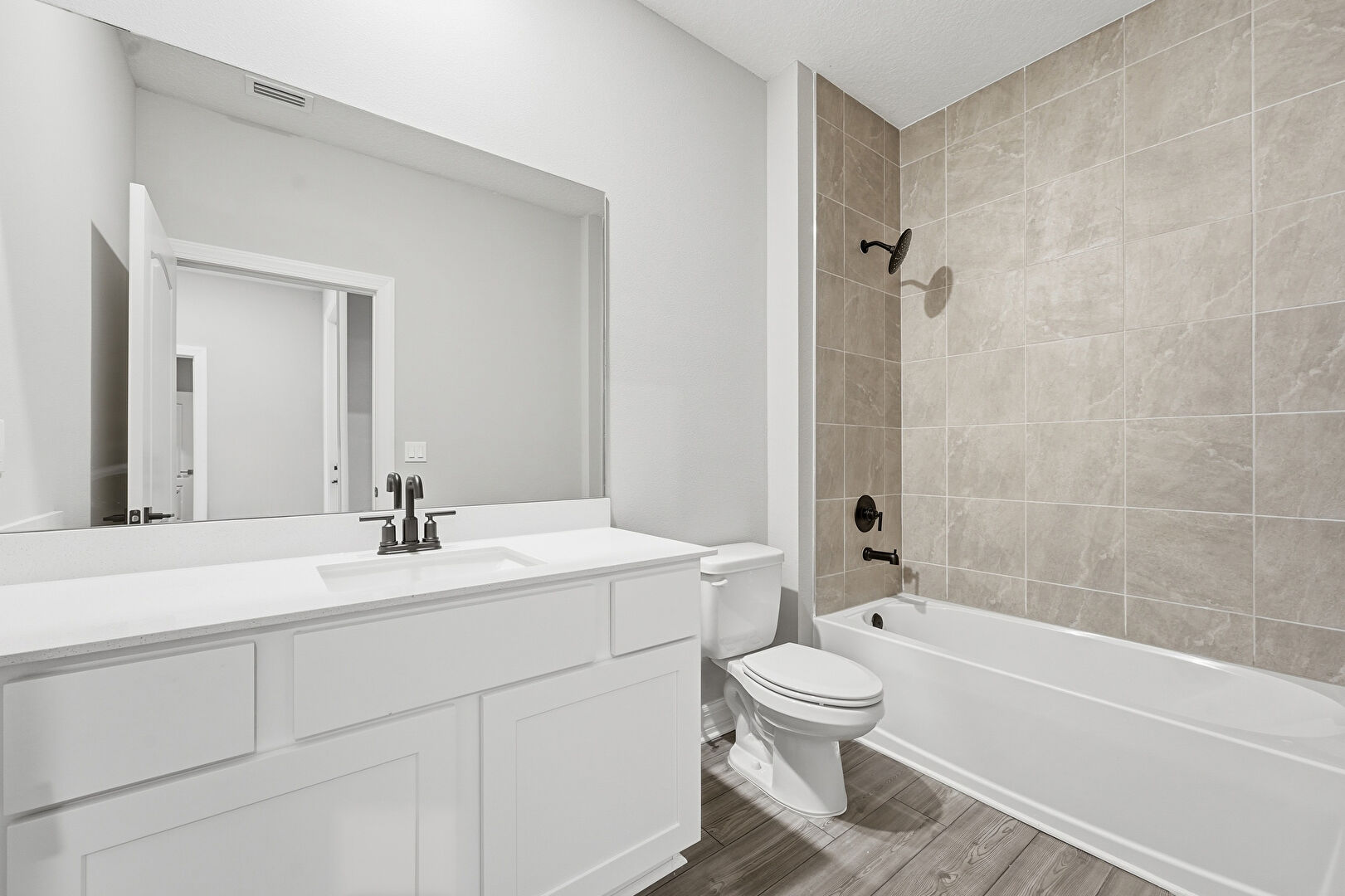 Combined Bath Shower, Drywall, Full Bathroom, Vanity, Vent, Wood Finish Floor