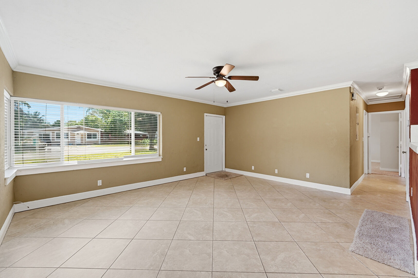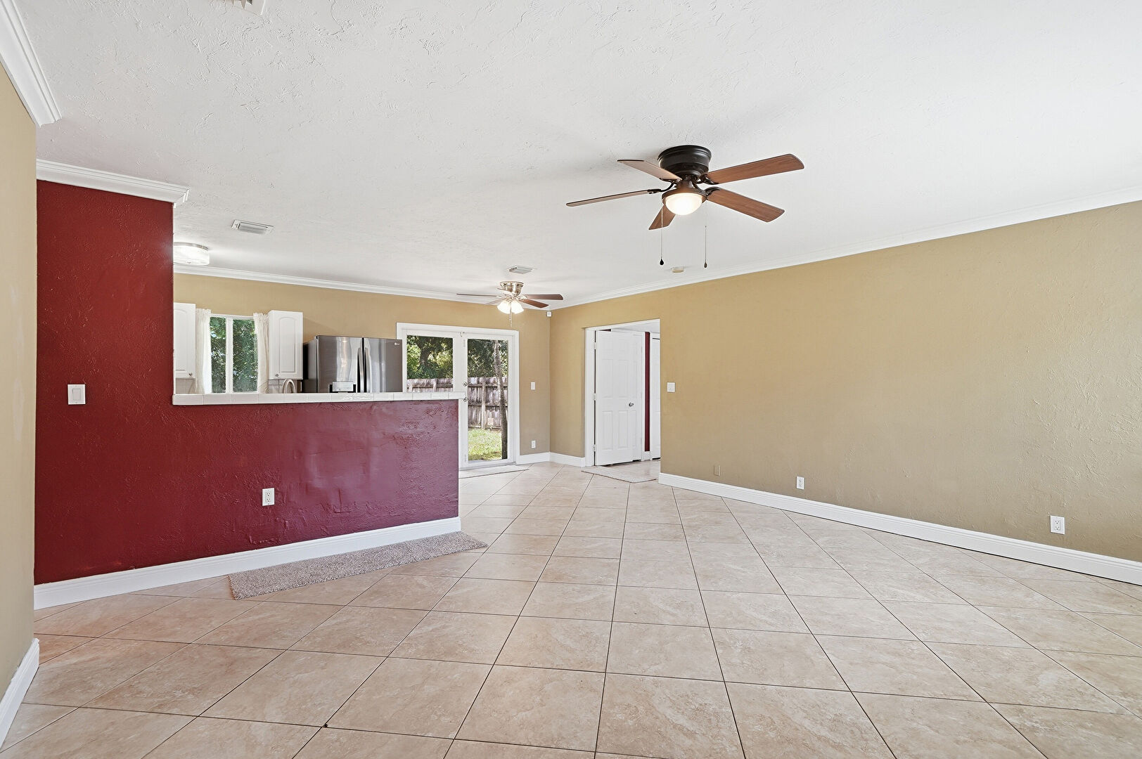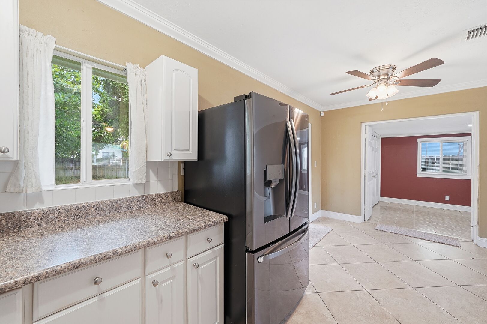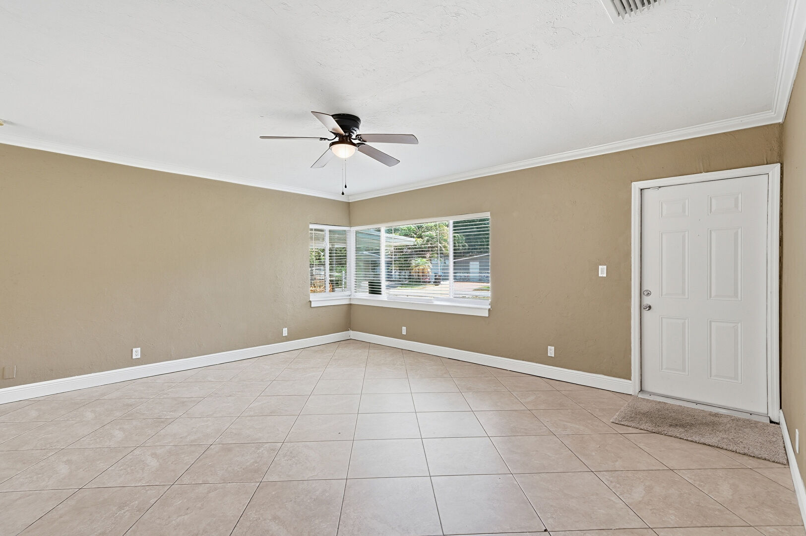 Baseboards Wall, Ceiling Fan, Crown Molding, Natural Light, Textured Wall, Tile Floor, Vent, Baseboards Wall, Natural Light