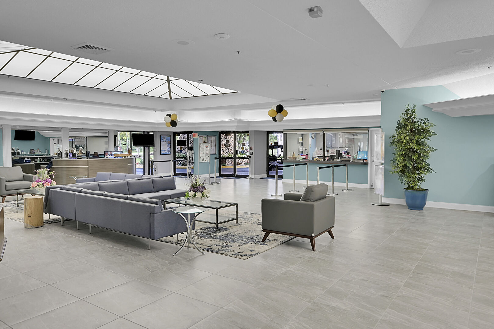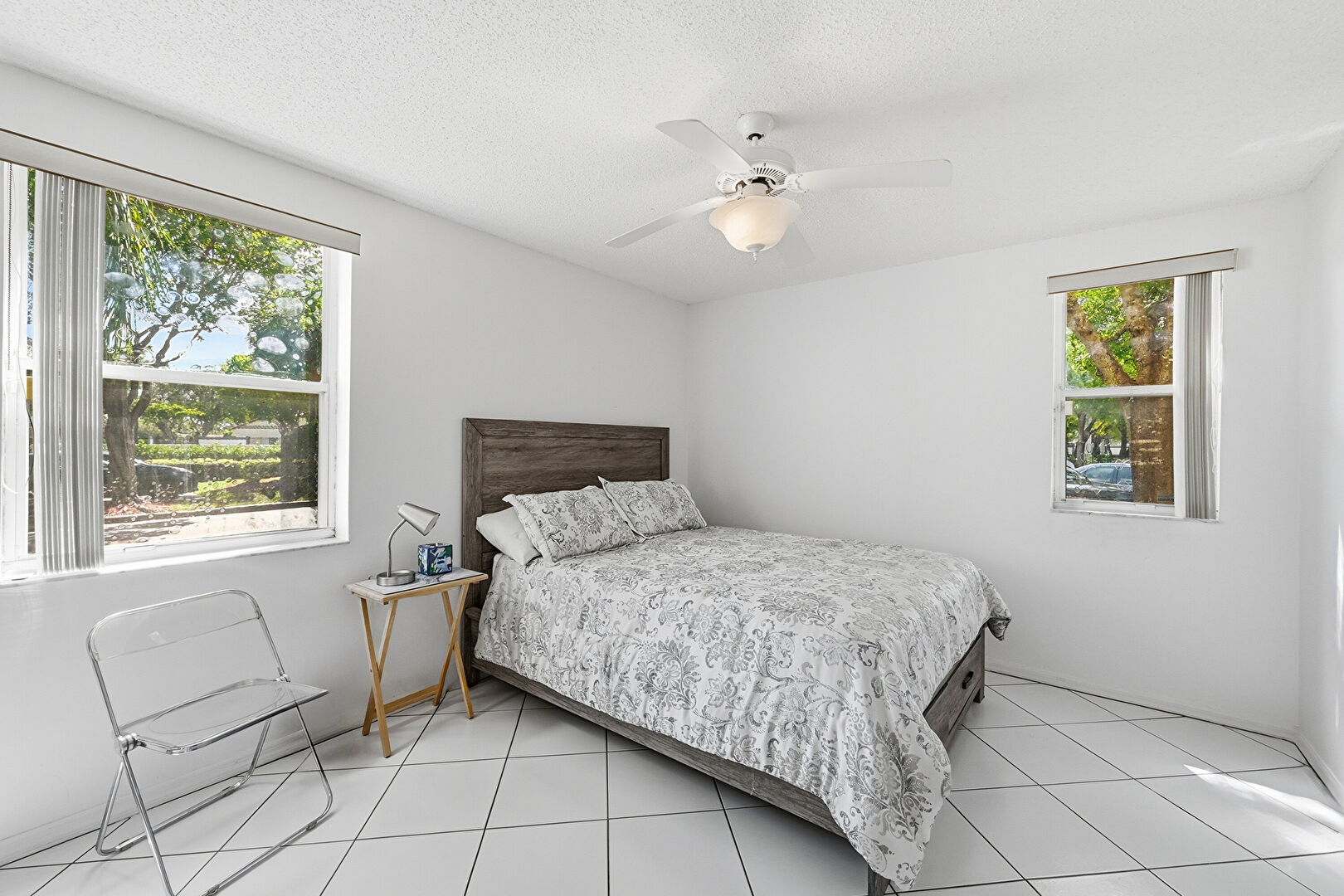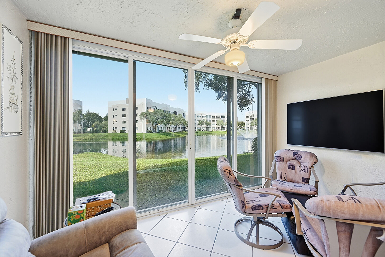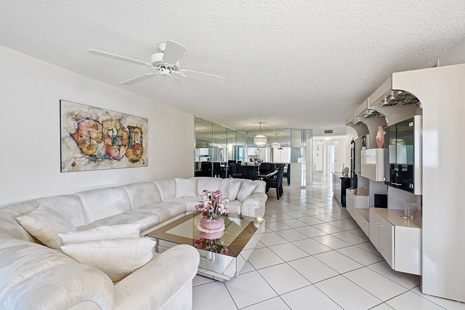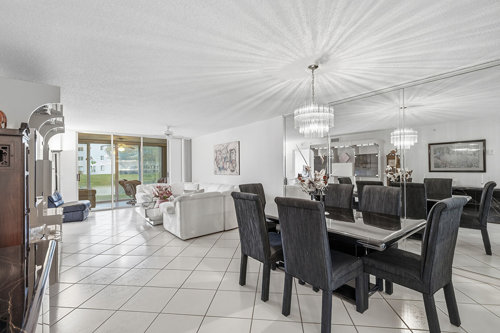 Ceiling Fan, Drywall, Floor Ceiling Windows, Notable Chandelier, Textured Ceiling, Tile Floor, Natural Light