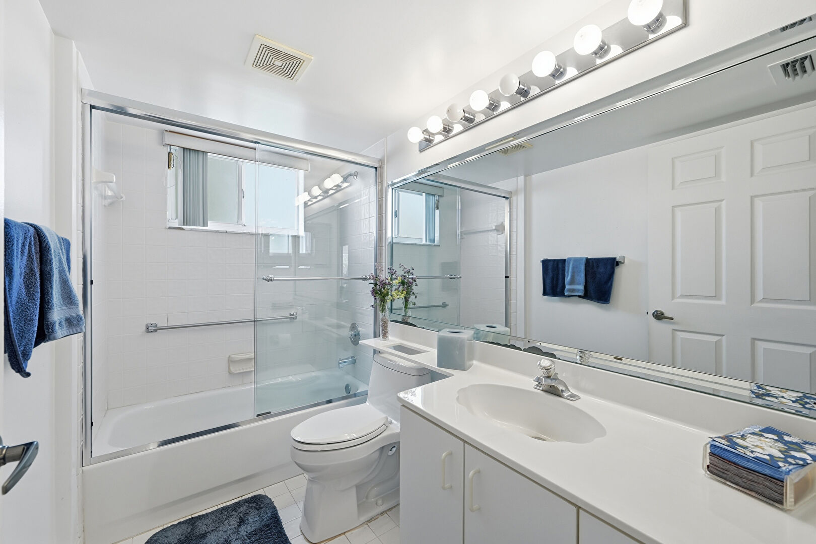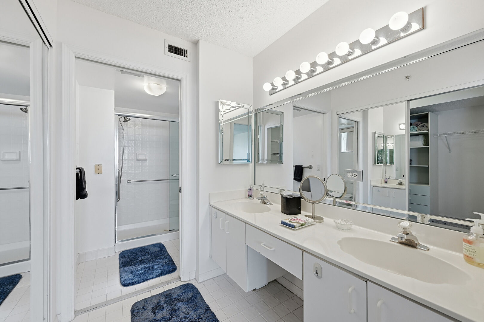 Baseboards Wall, Double Vanity, Drywall, Full Bathroom, Natural Light, Tile Floor, Vanity, Vent, Walk In Closet, Combined Bath Shower, Textured Ceiling