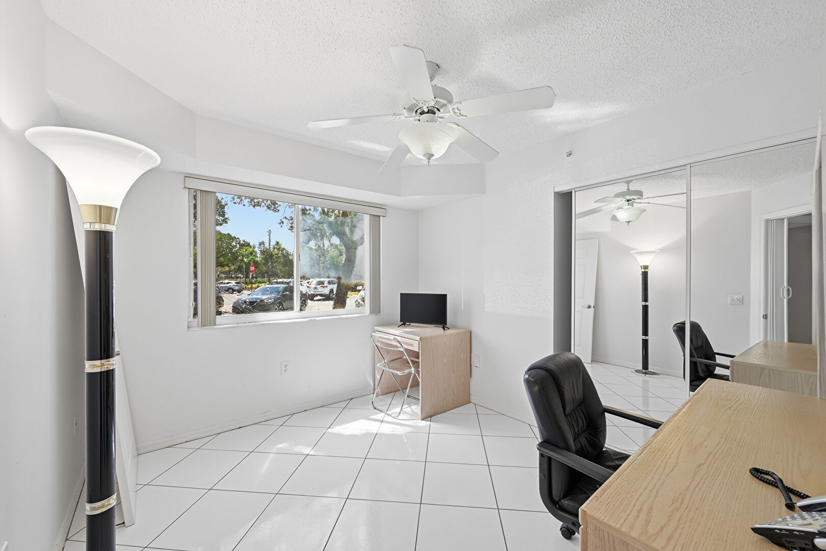 Ceiling Fan, Natural Light, Office Area, Textured Ceiling, Tile Floor, Drywall