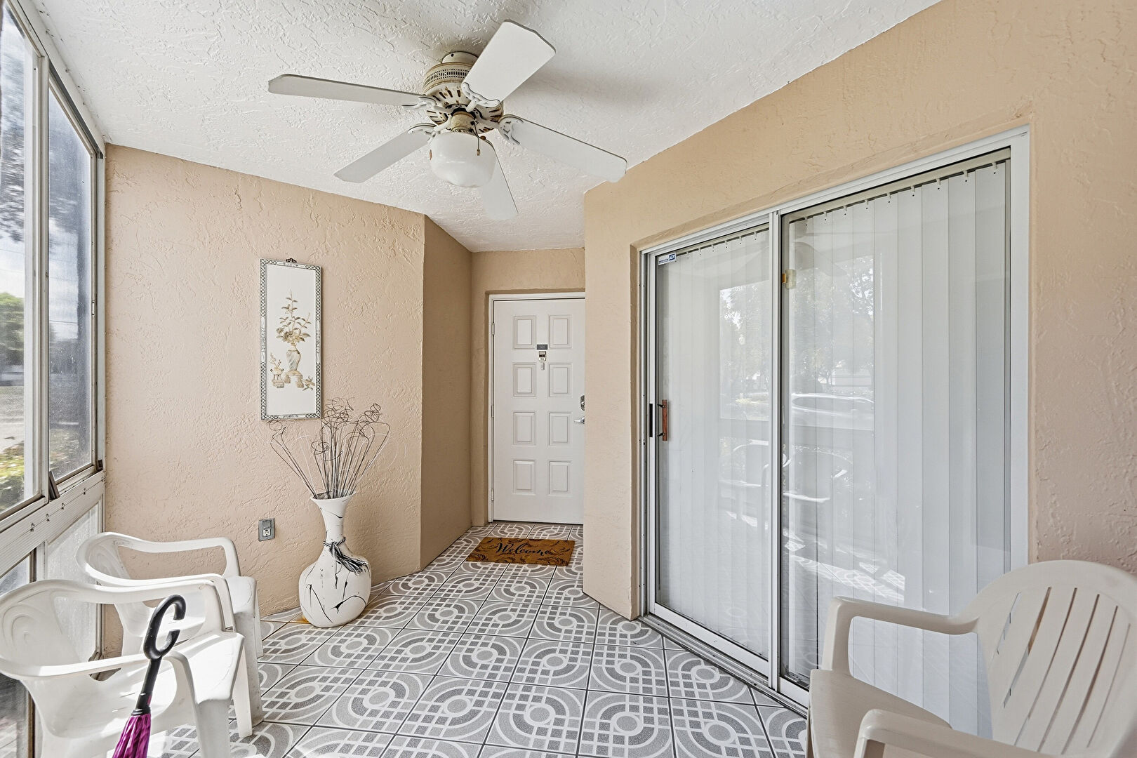 Arched Walkways, Ceiling Fan, Textured Ceiling, Tile Floor, Drywall